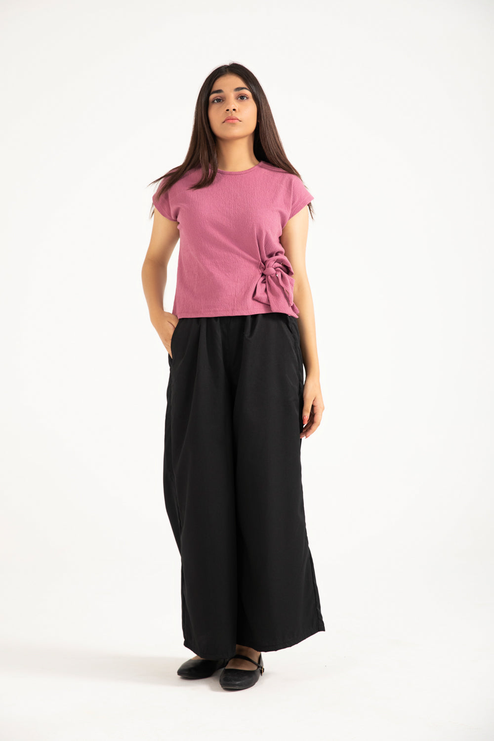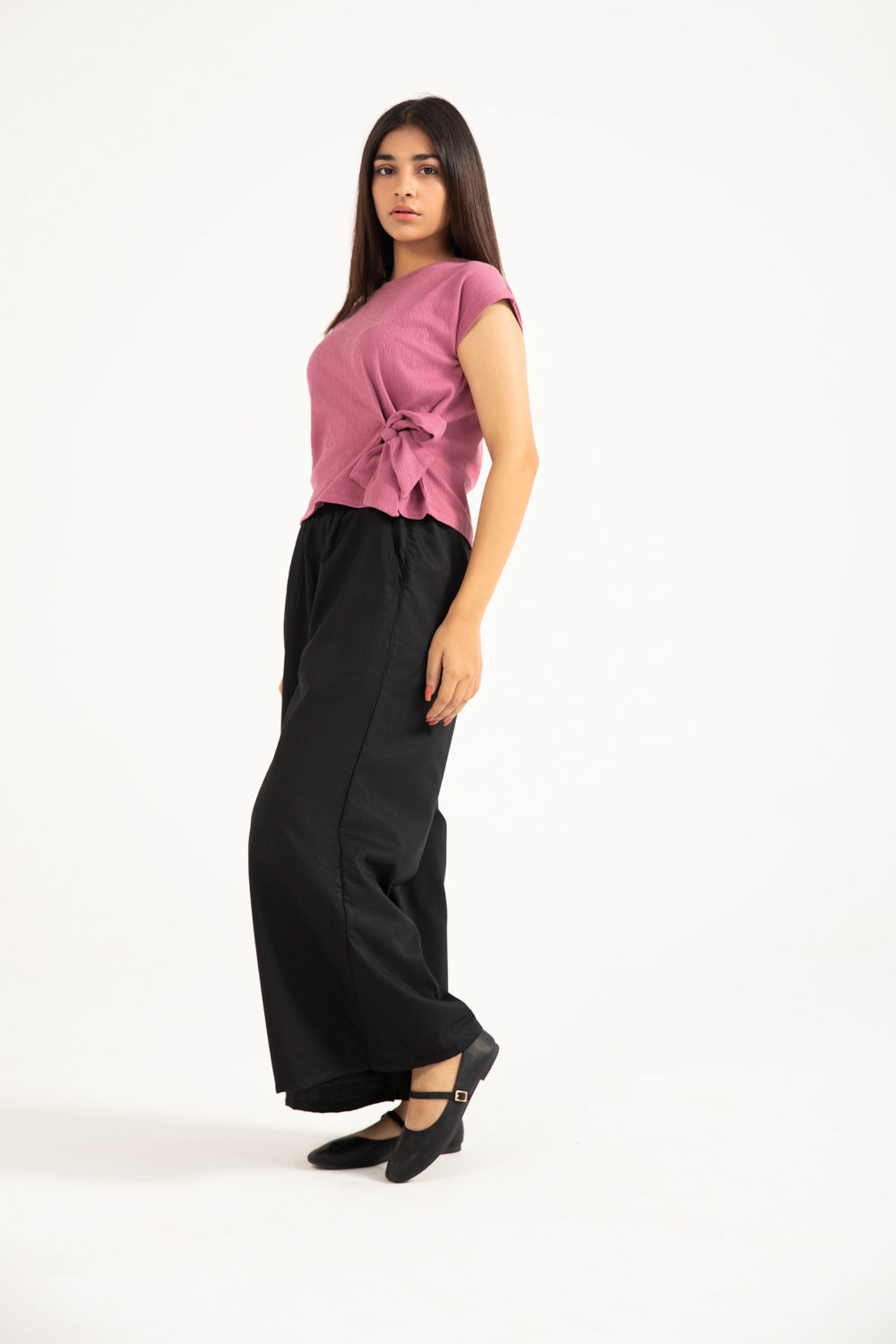 Dusty pink top in a cotton synthetic blend with a textured finish and a side waist tie detail.