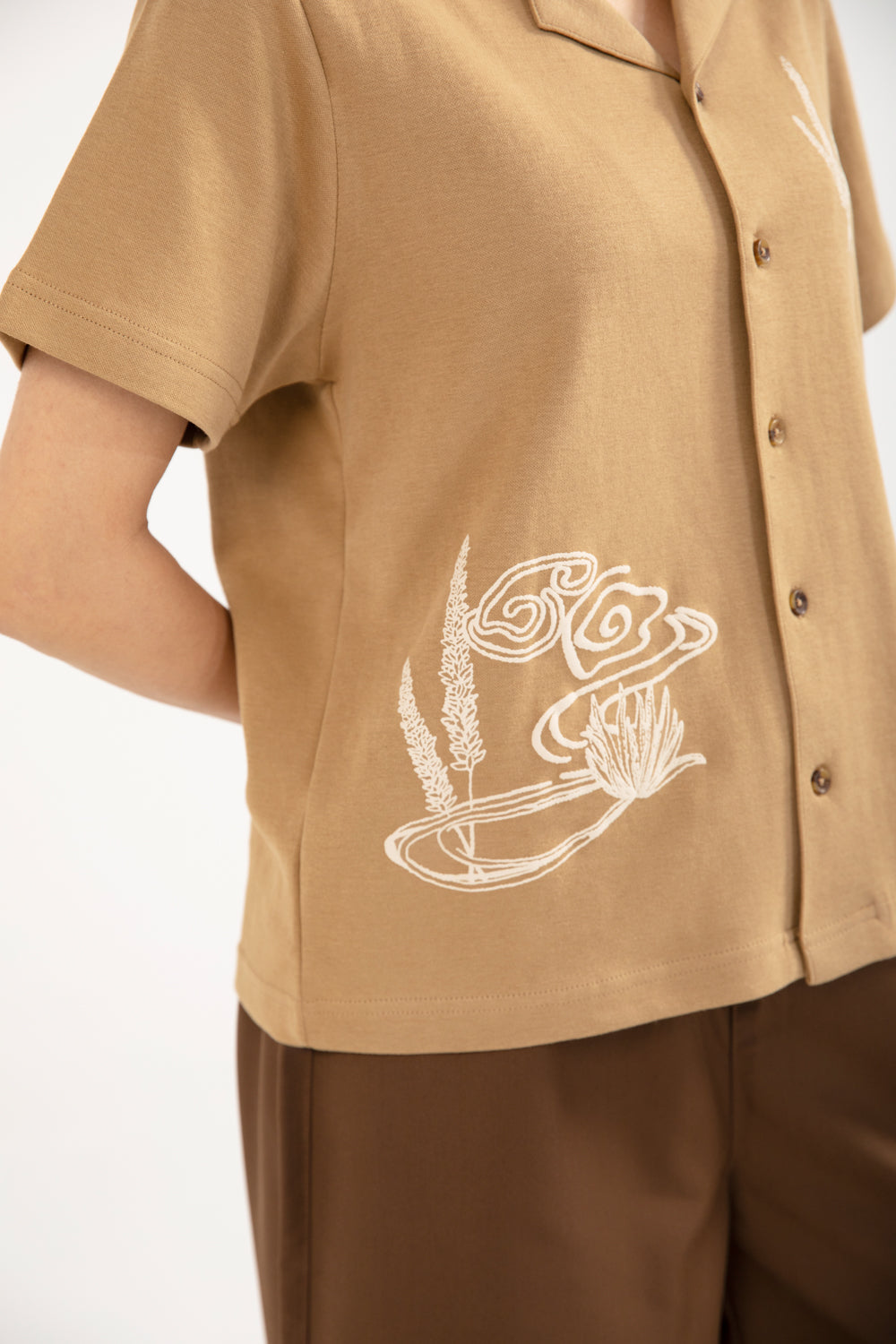 Button down knit top in brown crafted from a cotton blend with embossed front detailing and dark brown buttons.