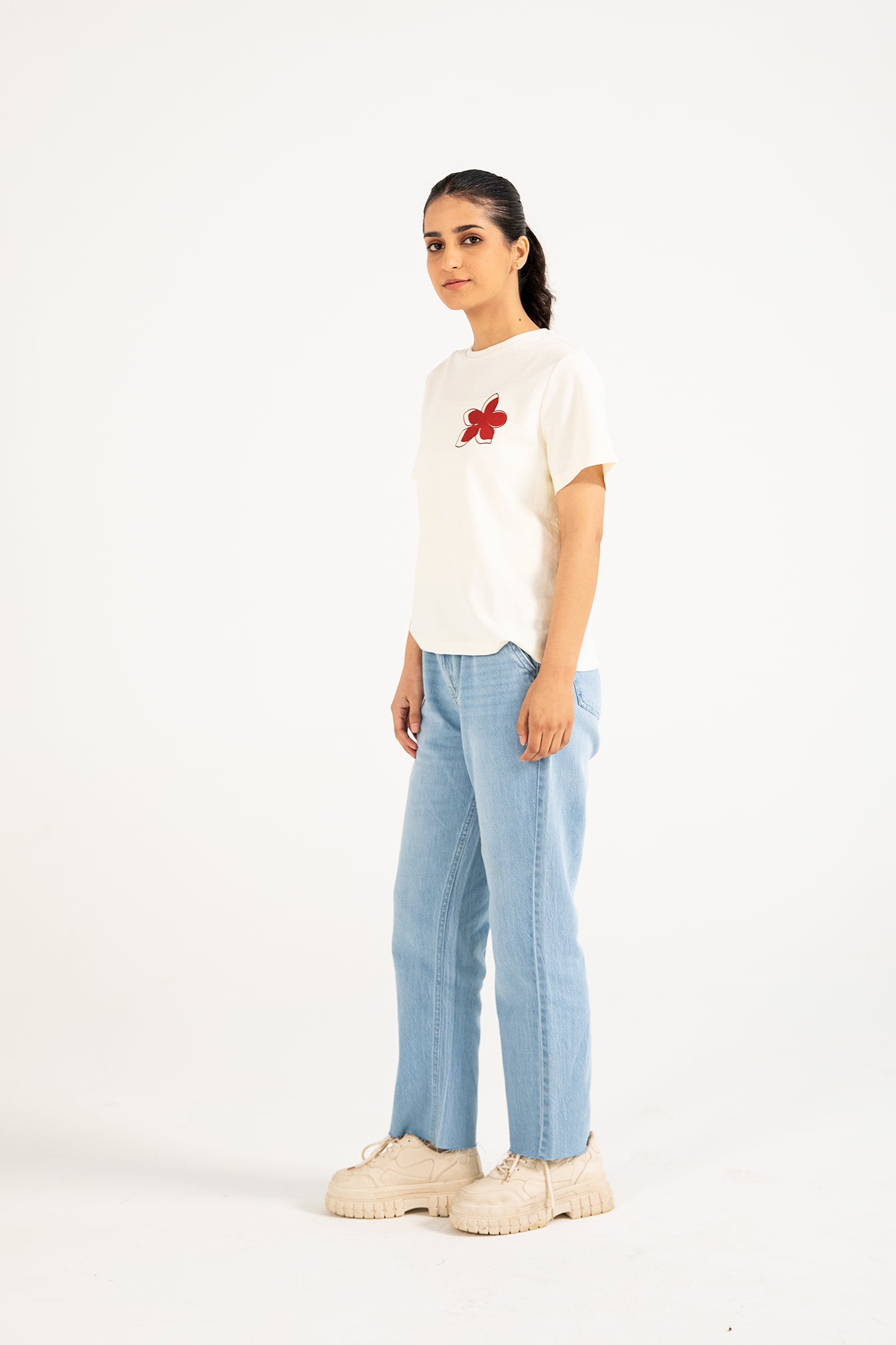 Off-white cotton synthetic blend with a textured feel, featuring a floral graphic on the front.