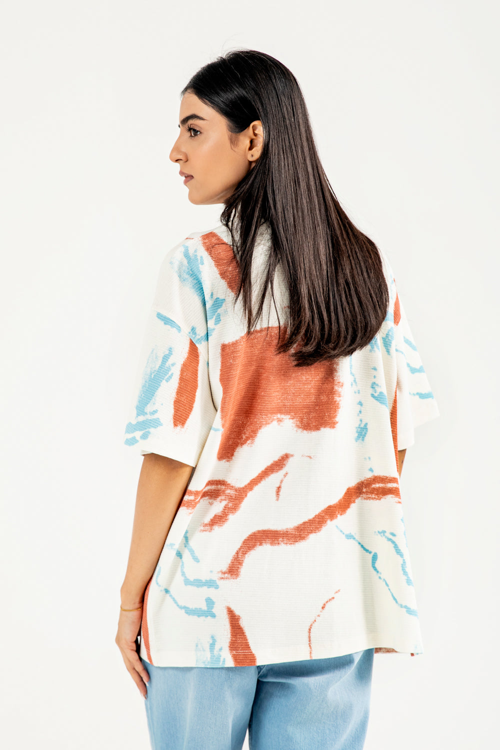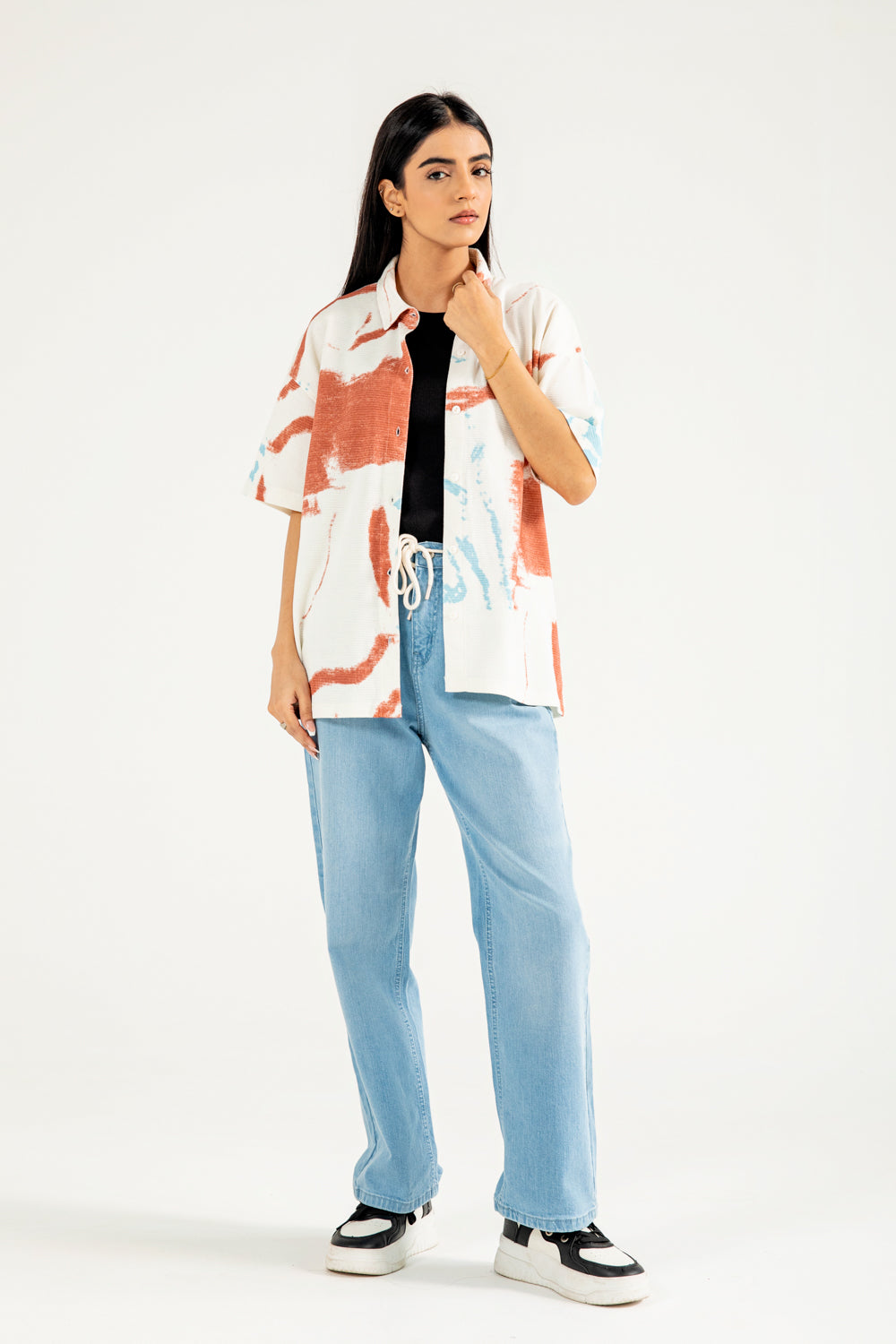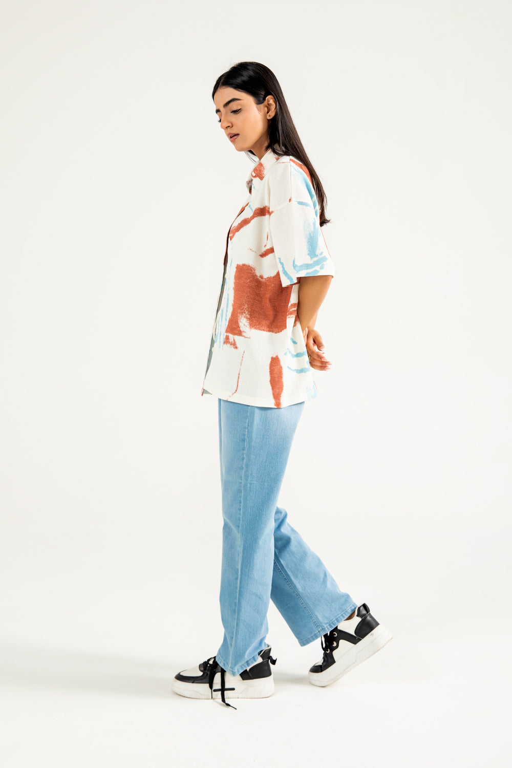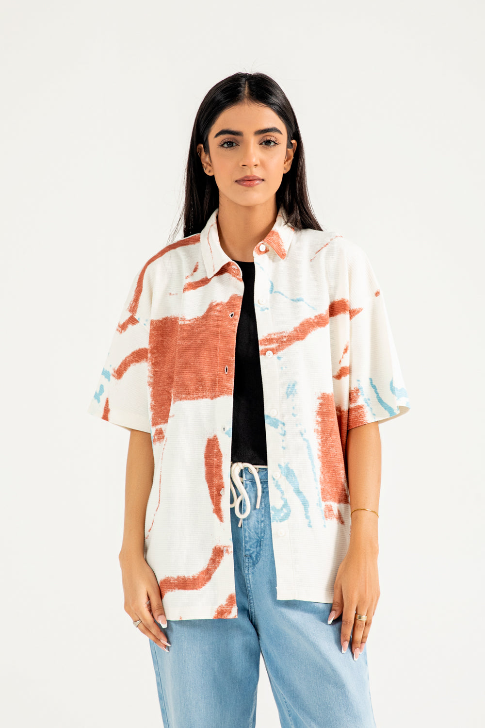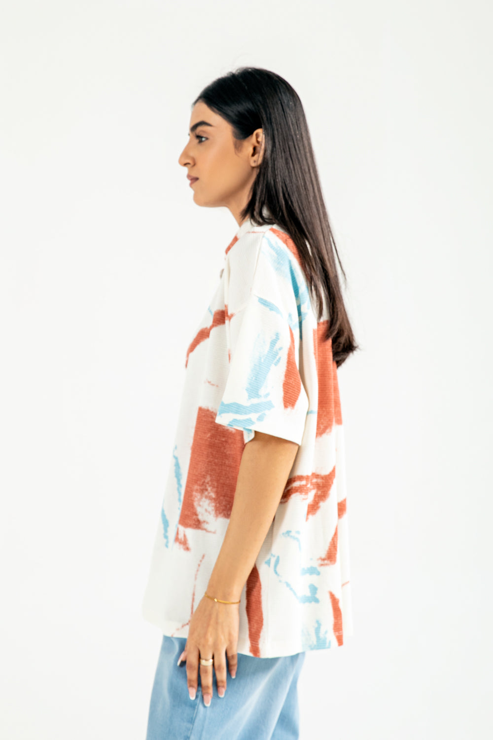 Cotton knit shirt with an all-over abstract print in vibrant tones, finished with crisp white buttons for contrast.