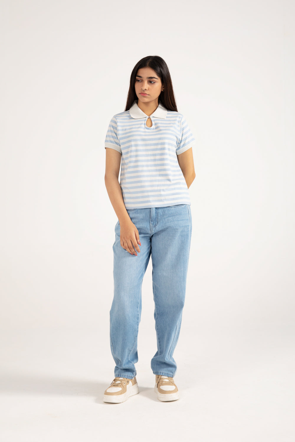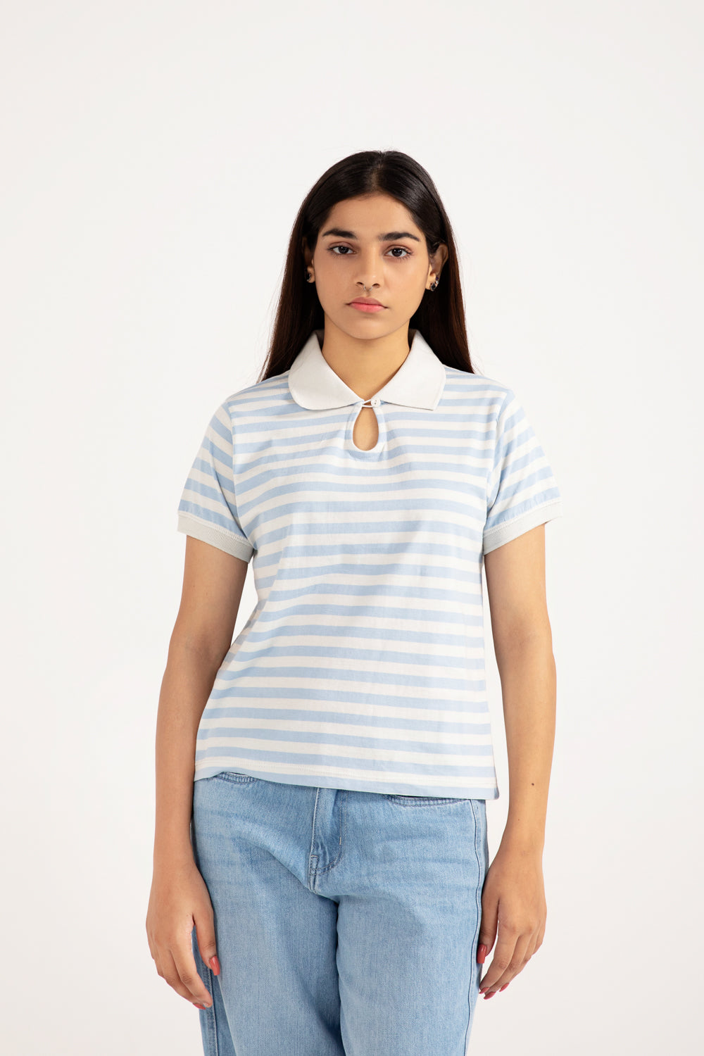 Blue cotton tee with horizontal stripes and a single button detail at the neckline.