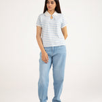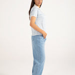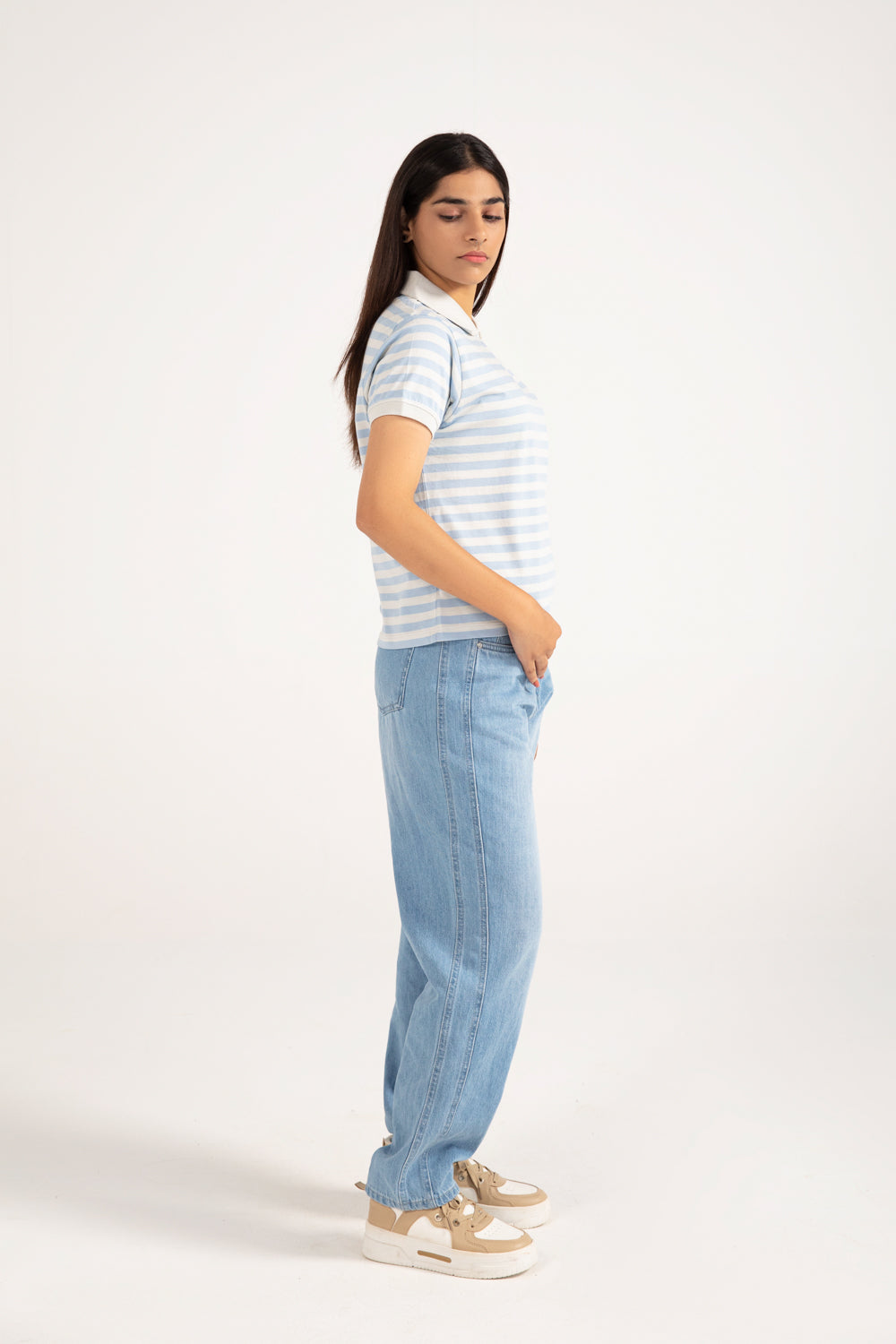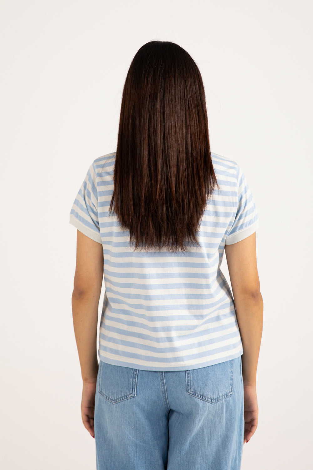 Blue cotton tee with horizontal stripes and a single button detail at the neckline.