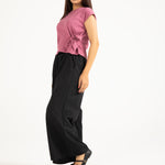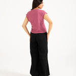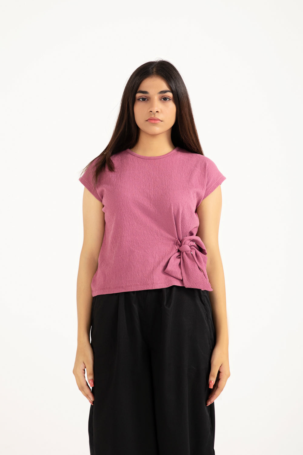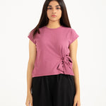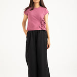 Dusty pink top in a cotton synthetic blend with a textured finish and a side waist tie detail.