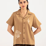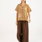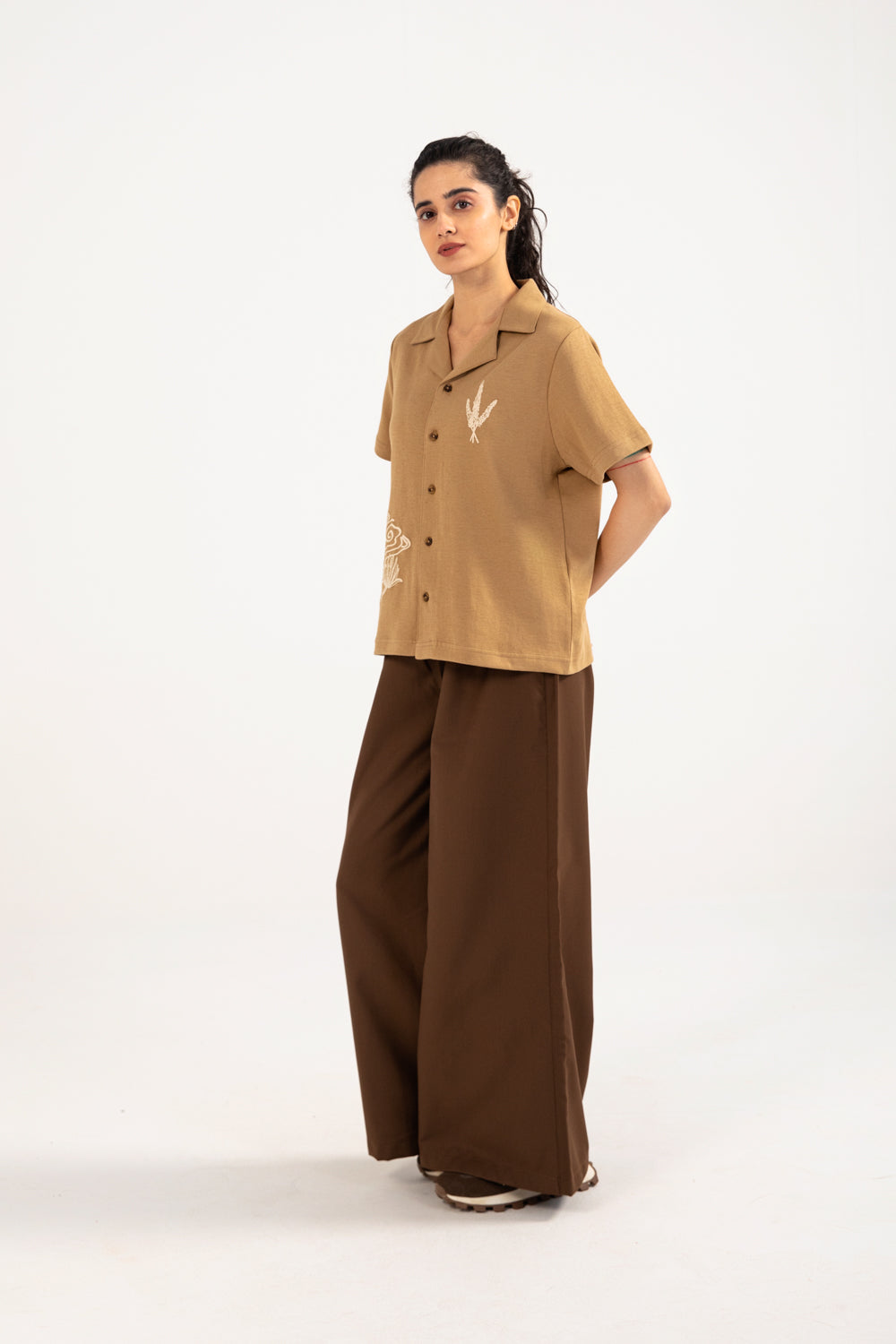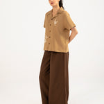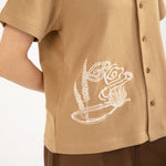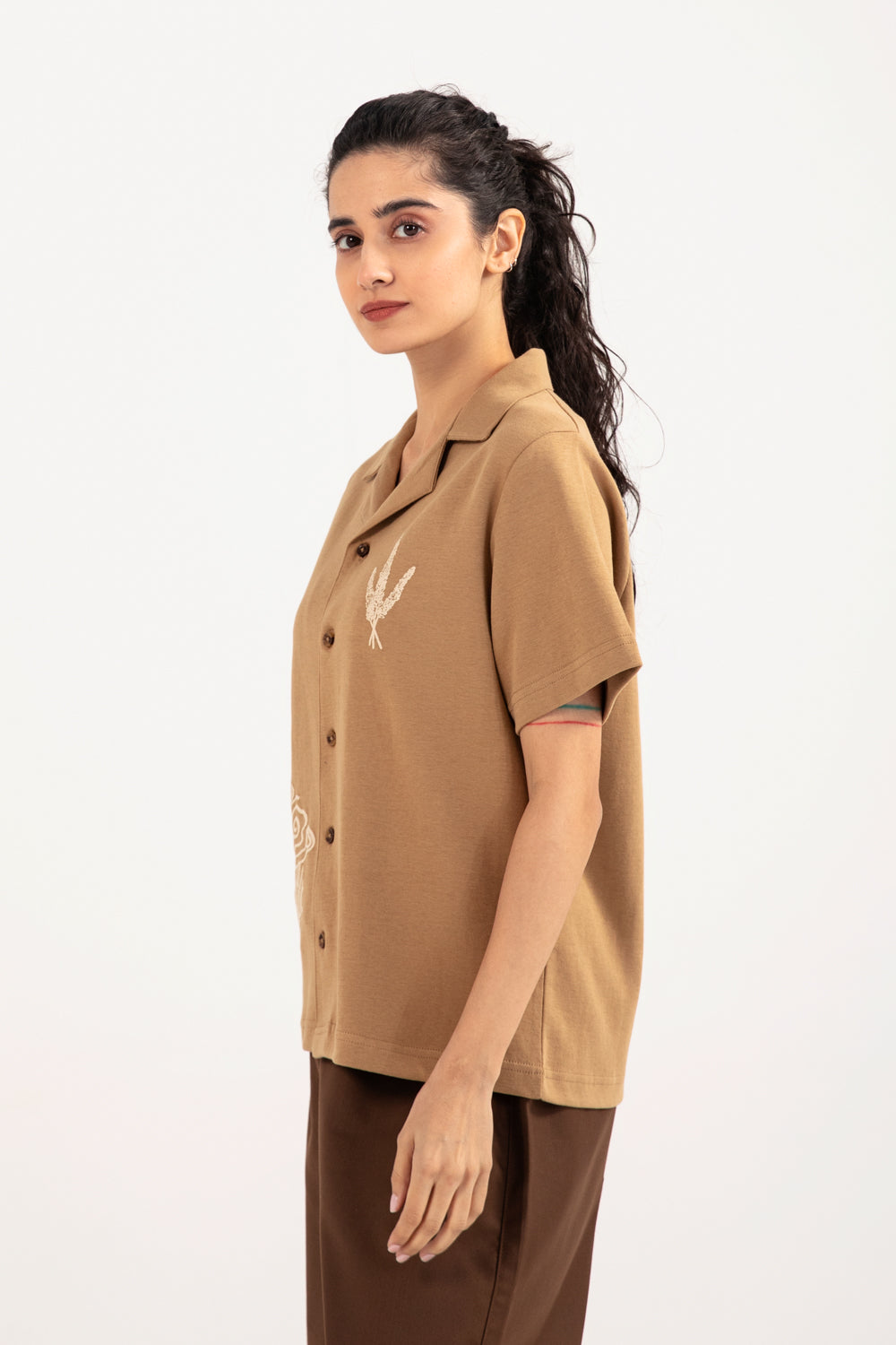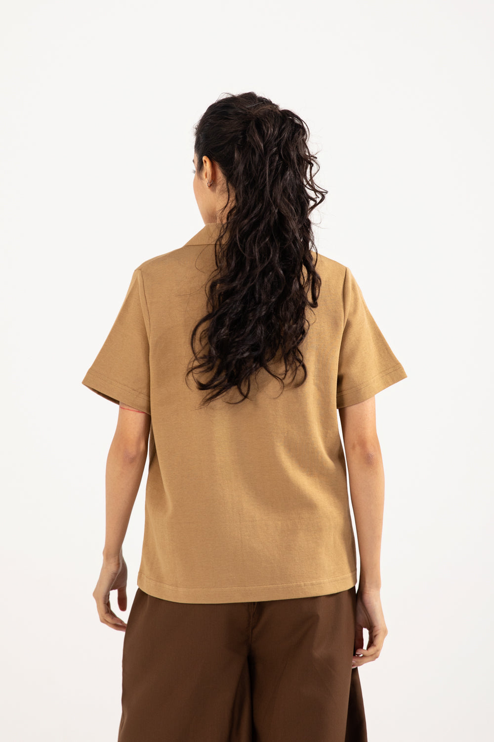 Button down knit top in brown crafted from a cotton blend with embossed front detailing and dark brown buttons.