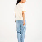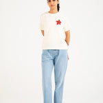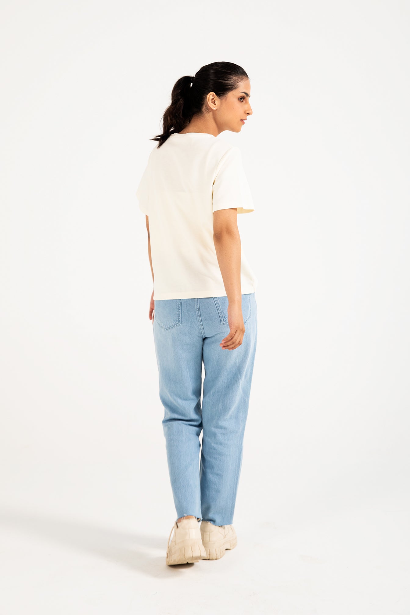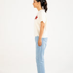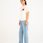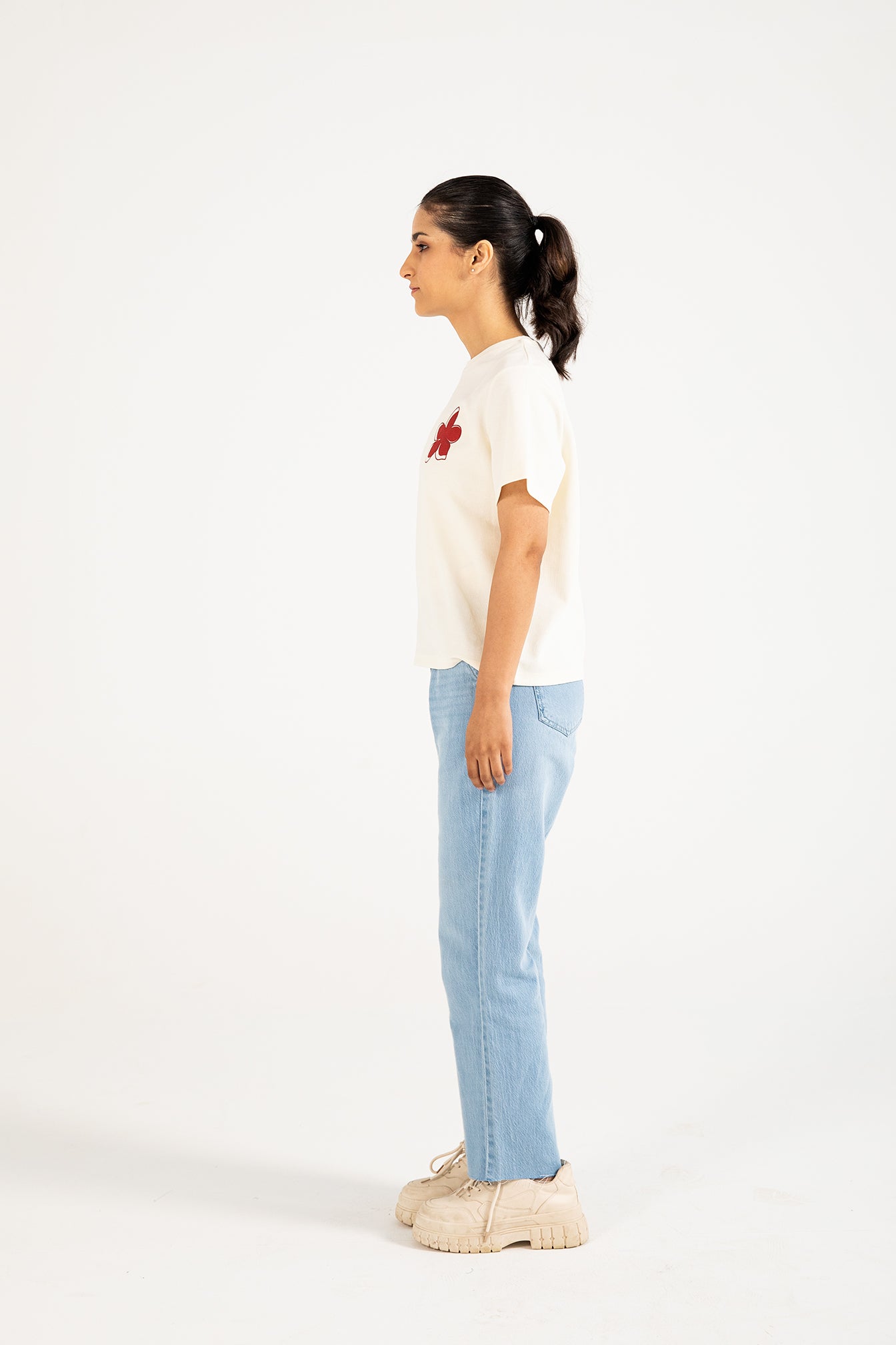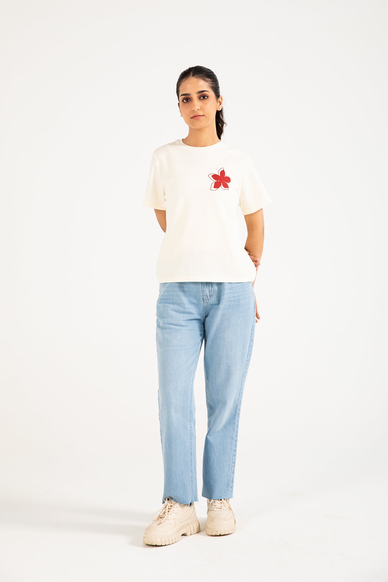 Off-white cotton synthetic blend with a textured feel, featuring a floral graphic on the front.