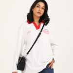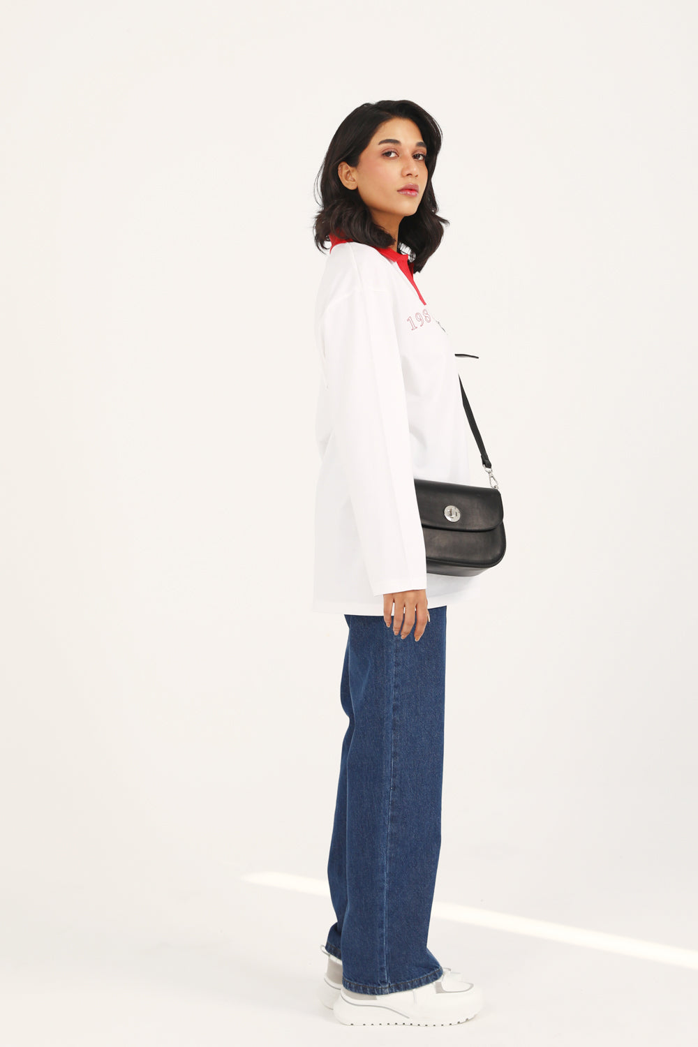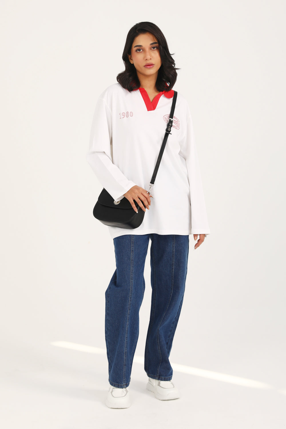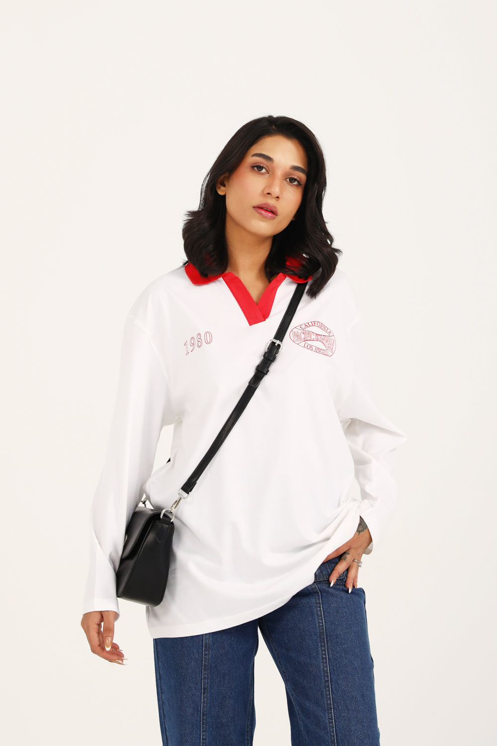 An oversized white polo with full sleeves, a contrasting red johnny collar, and graphic prints on the front that add character to the clean base.