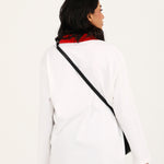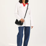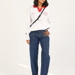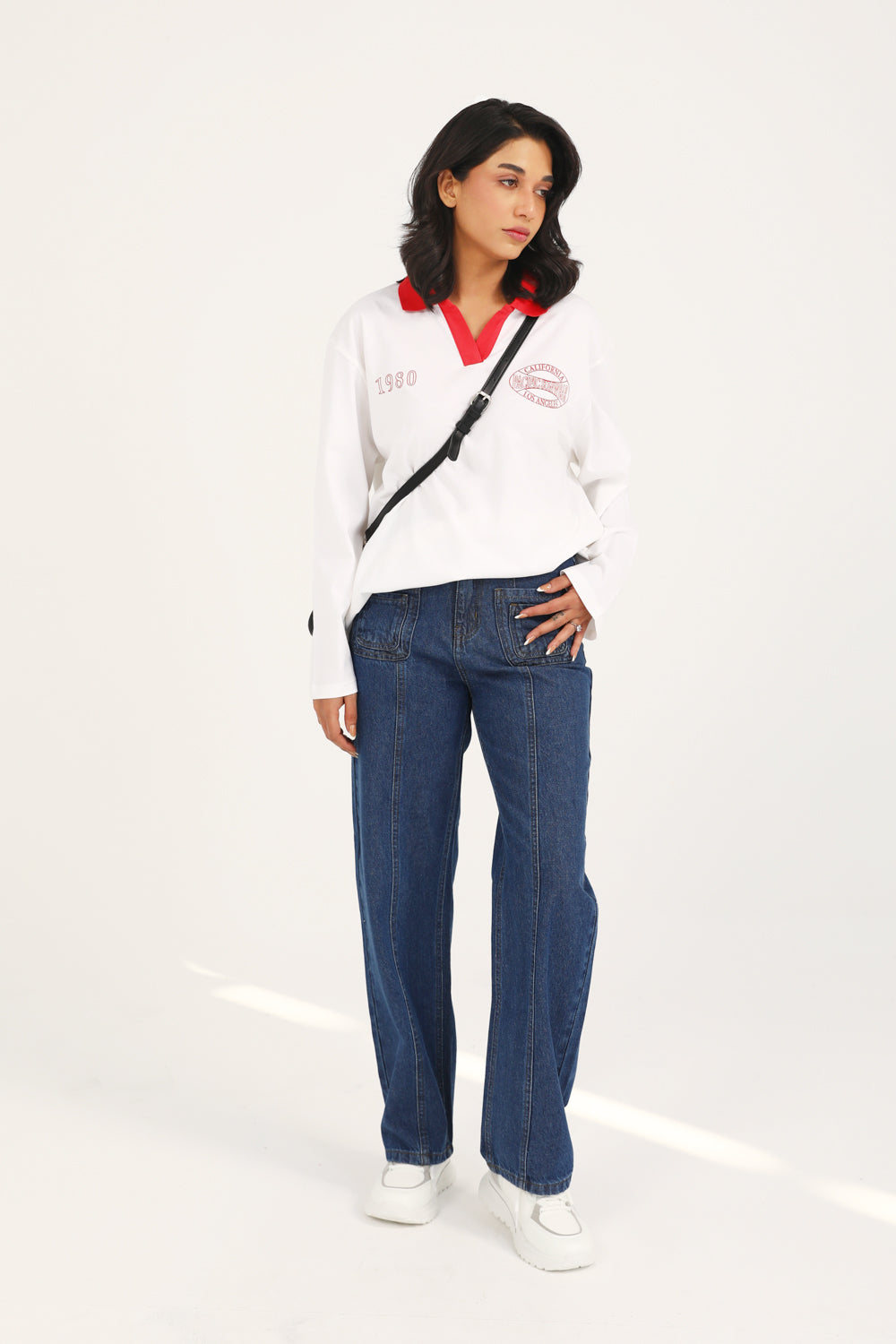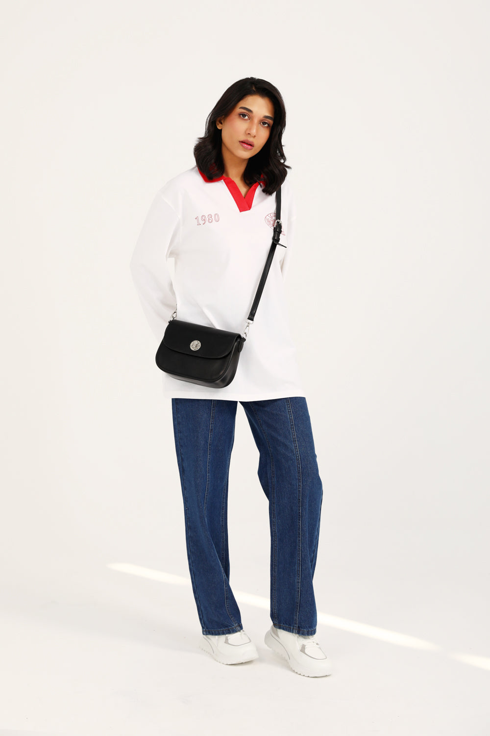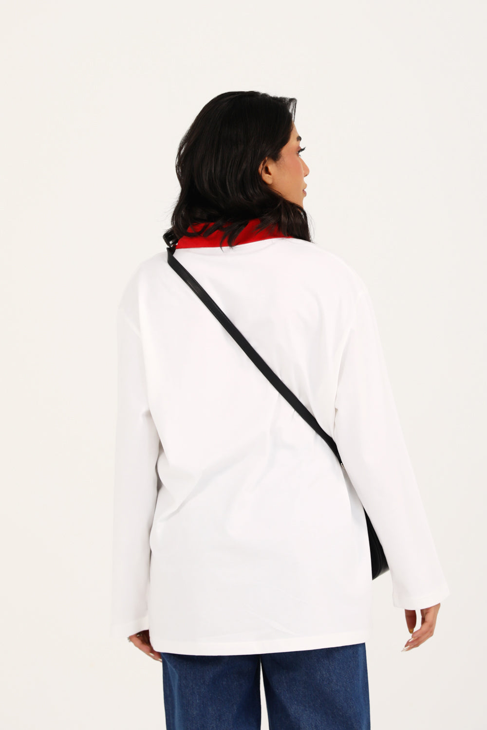 An oversized white polo with full sleeves, a contrasting red johnny collar, and graphic prints on the front that add character to the clean base.