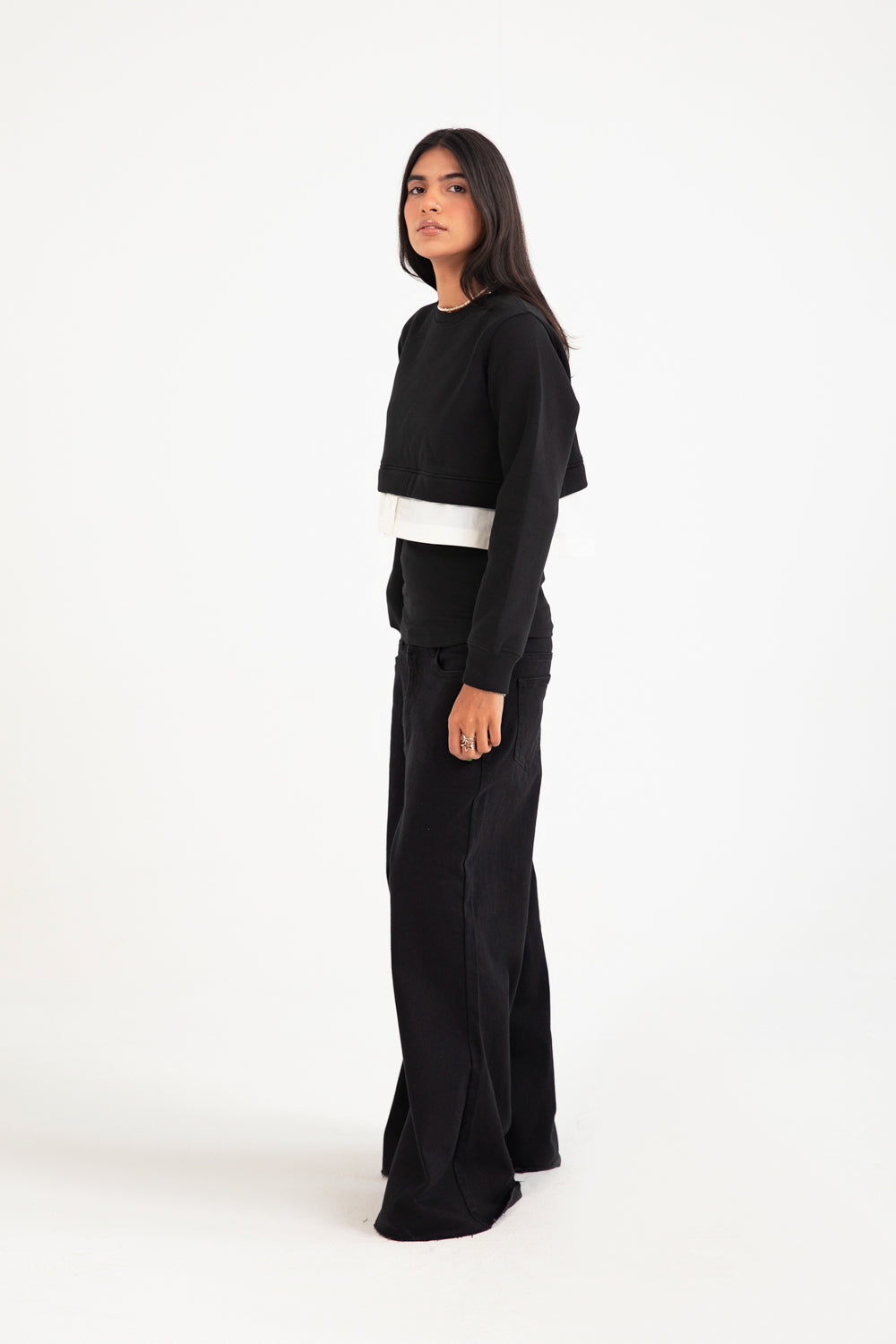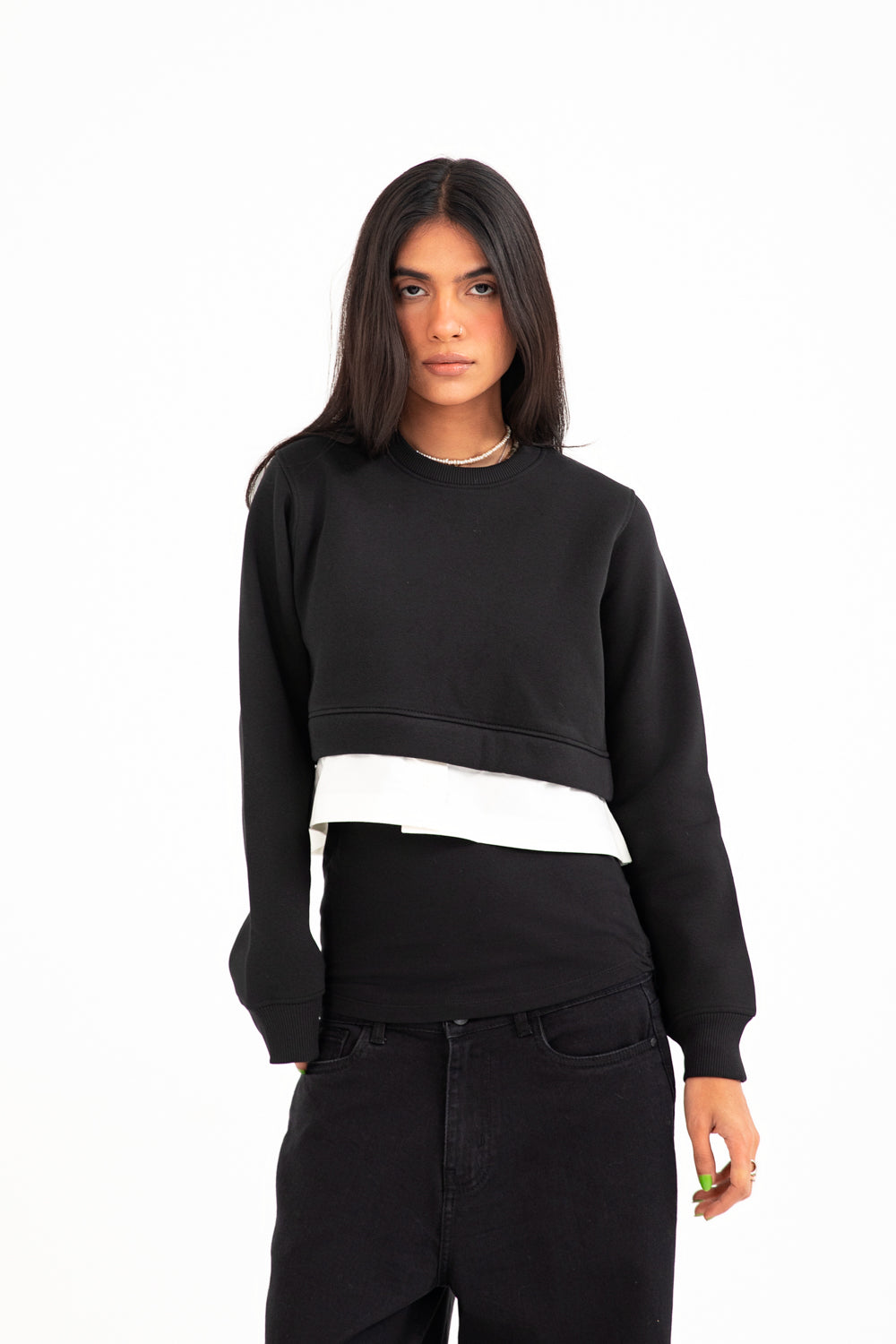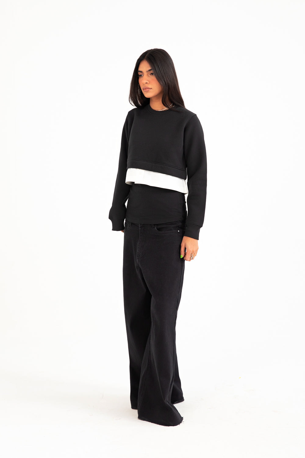 Sweatshirt in black featuring a contrasting white woven panel at the hem, finished with full length sleeves for a clean look.