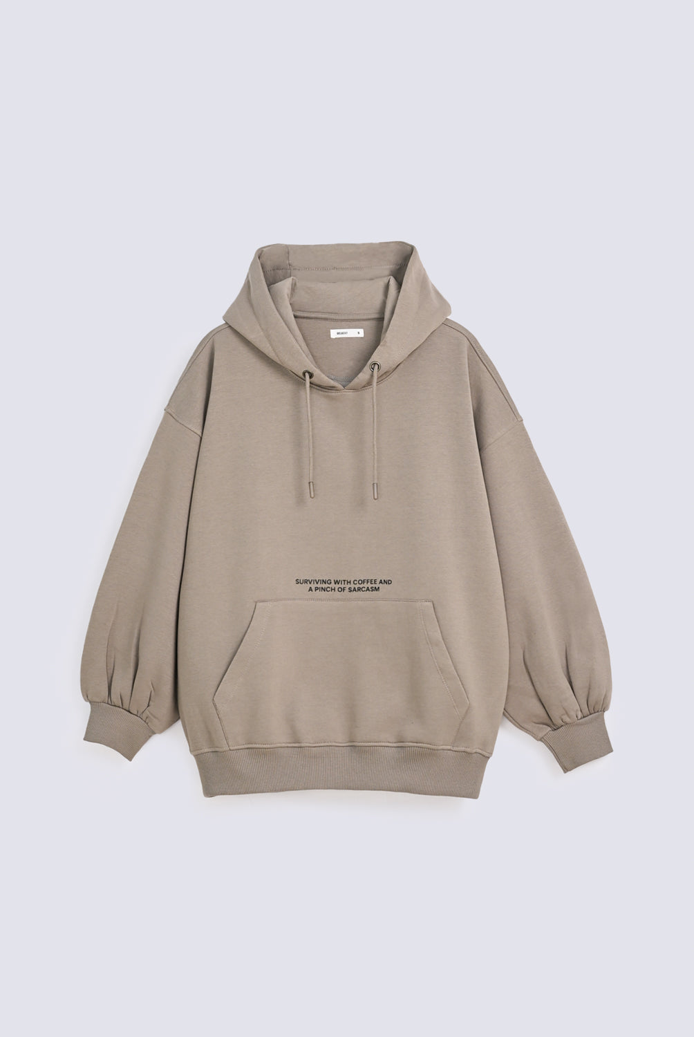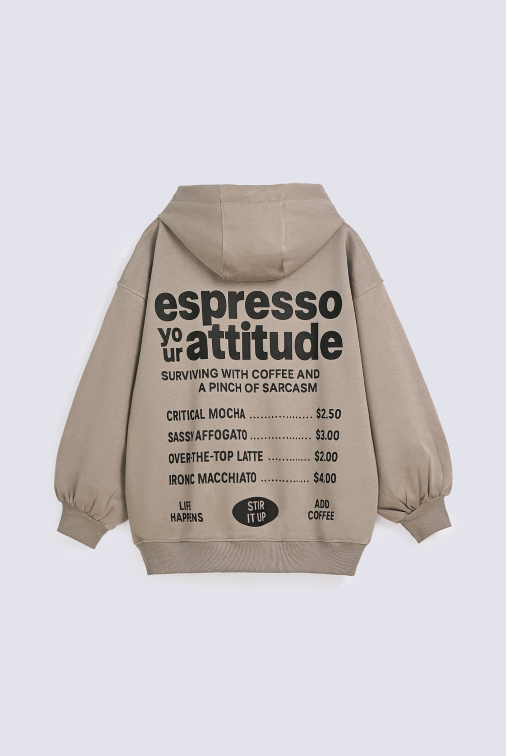 Espresso graphic hoodie in brown made from a soft cotton blend, featuring a small front text graphic and a bold back design.