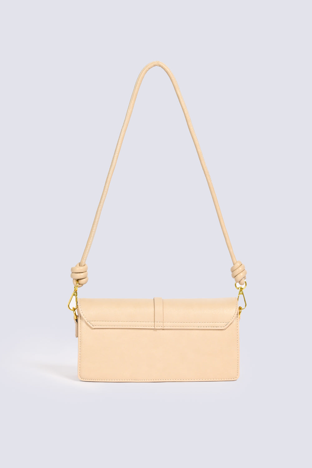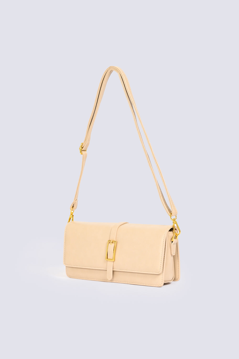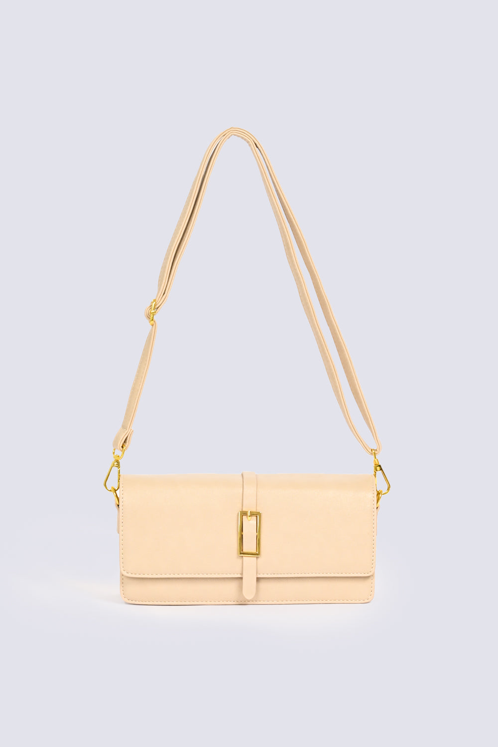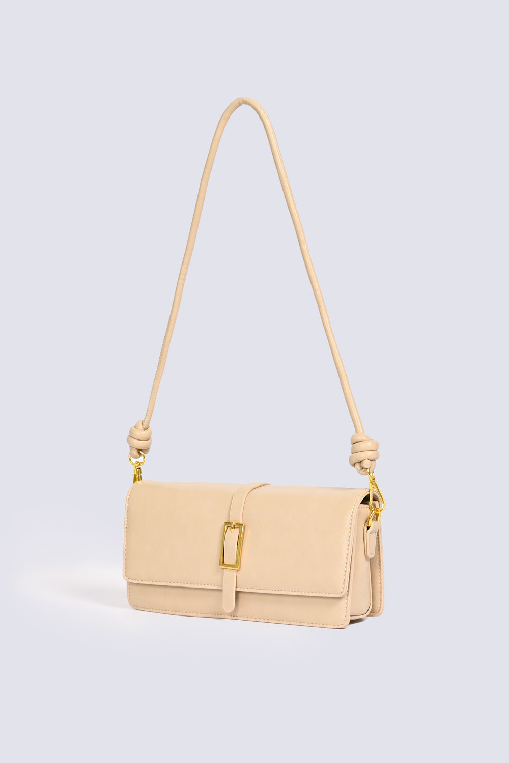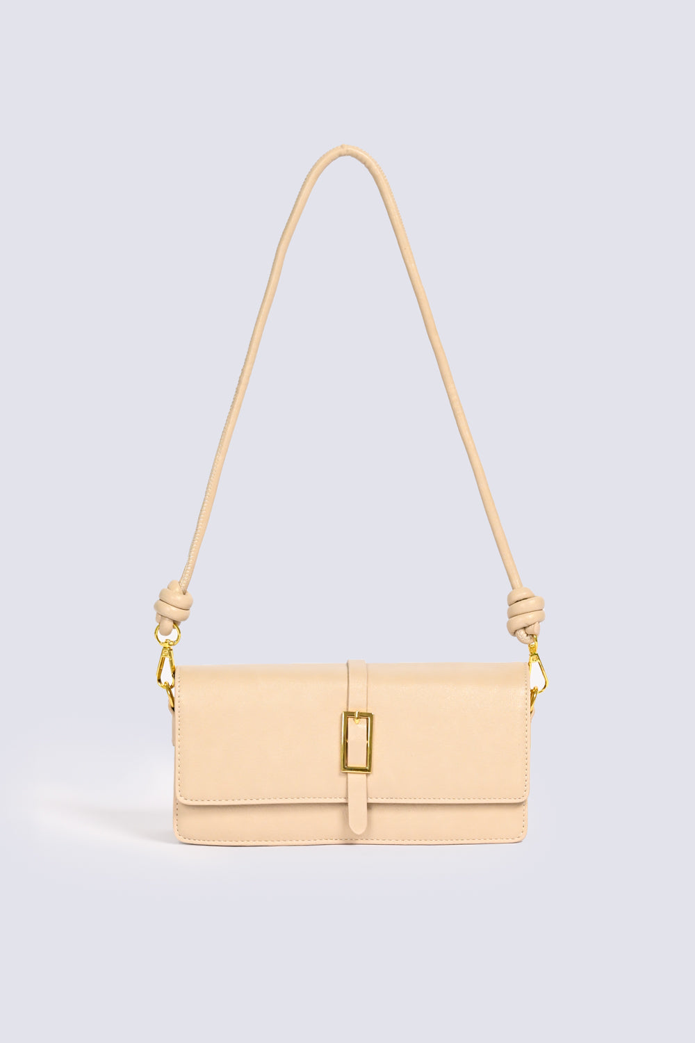 Beige shoulder bag with a buckle accent and gold hardware, designed with a detachable strap and an extra adjustable strap for versatile wear.