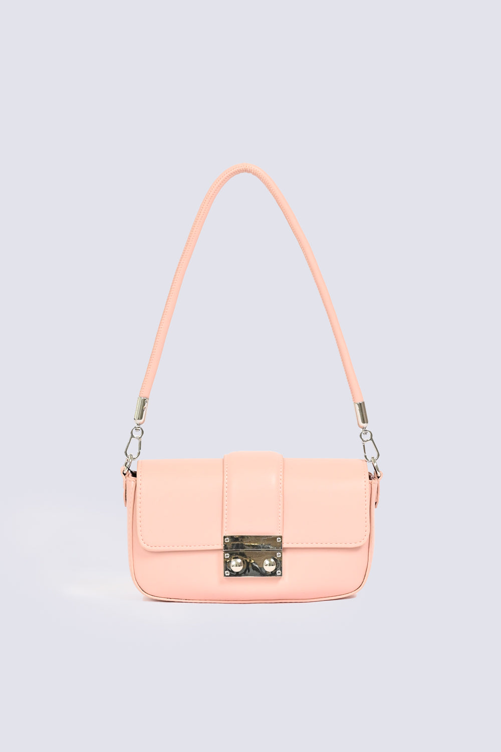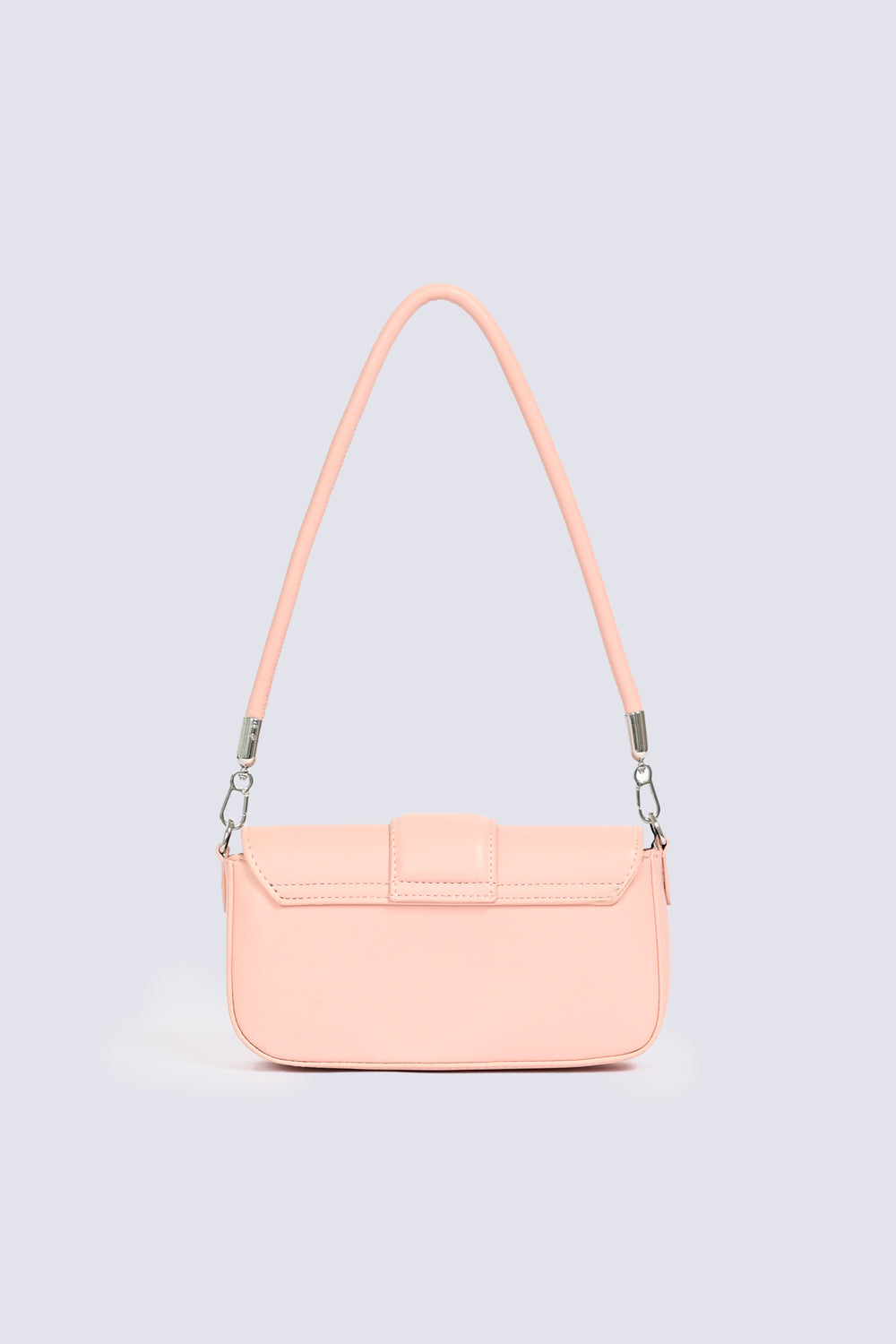 Pastel pink shoulder bag with a flap closure and silver accents, complete with two detachable straps for styling options.