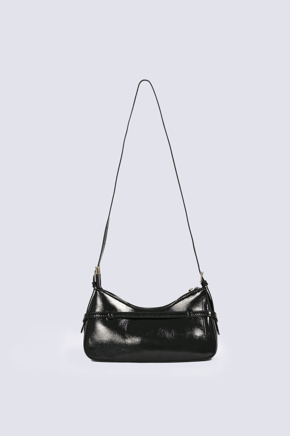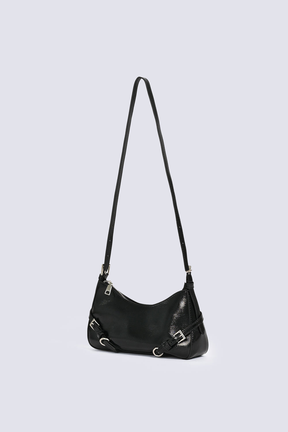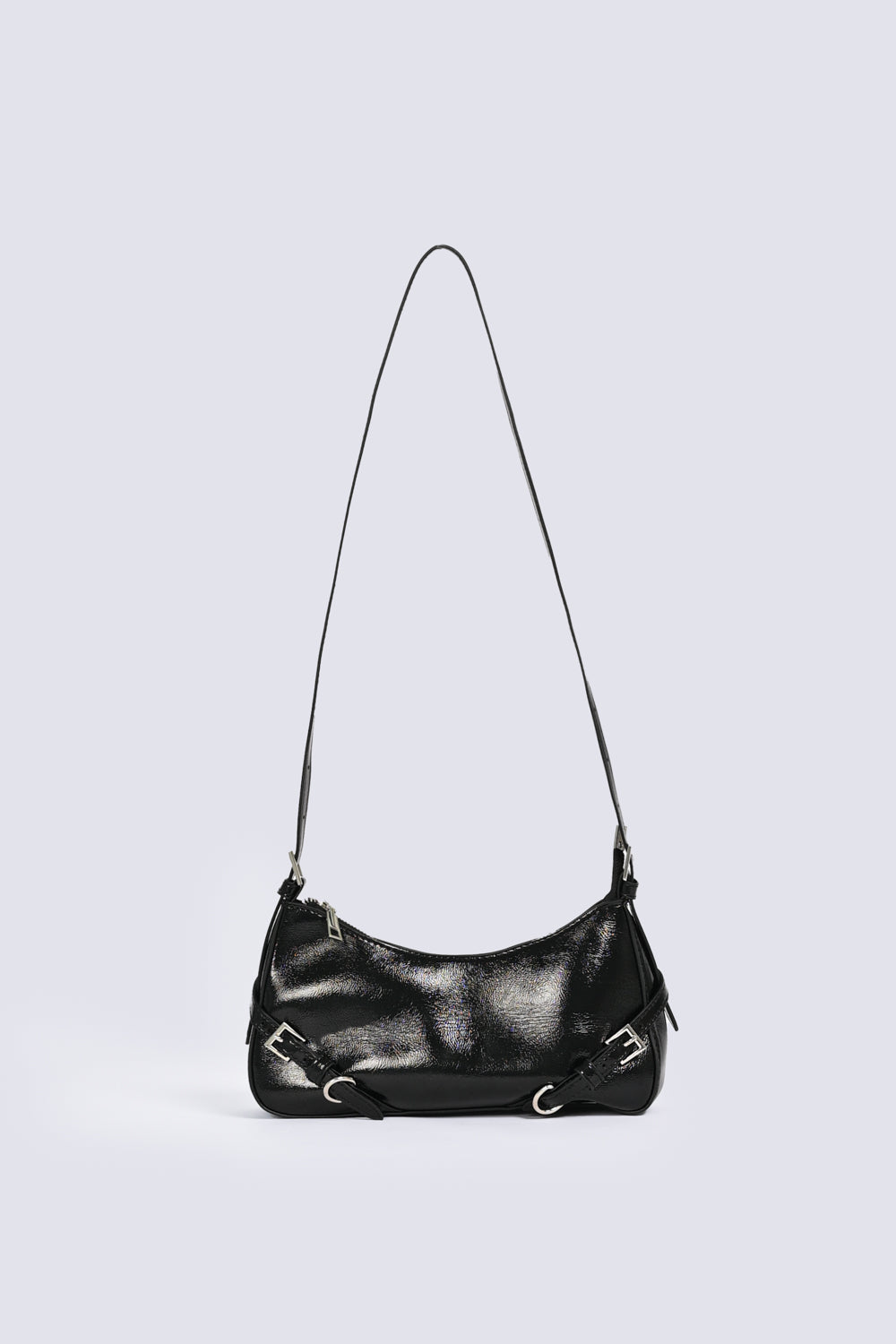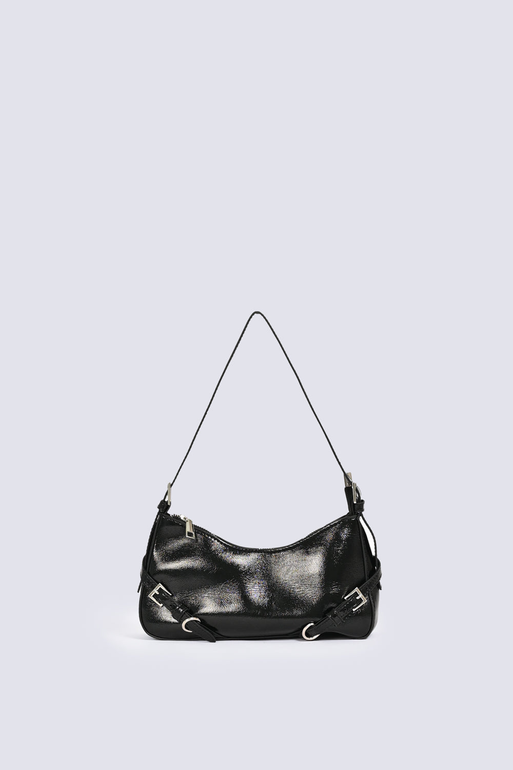 Black patent shoulder bag with a sleek finish, detailed with a buckle accent and silver hardware.