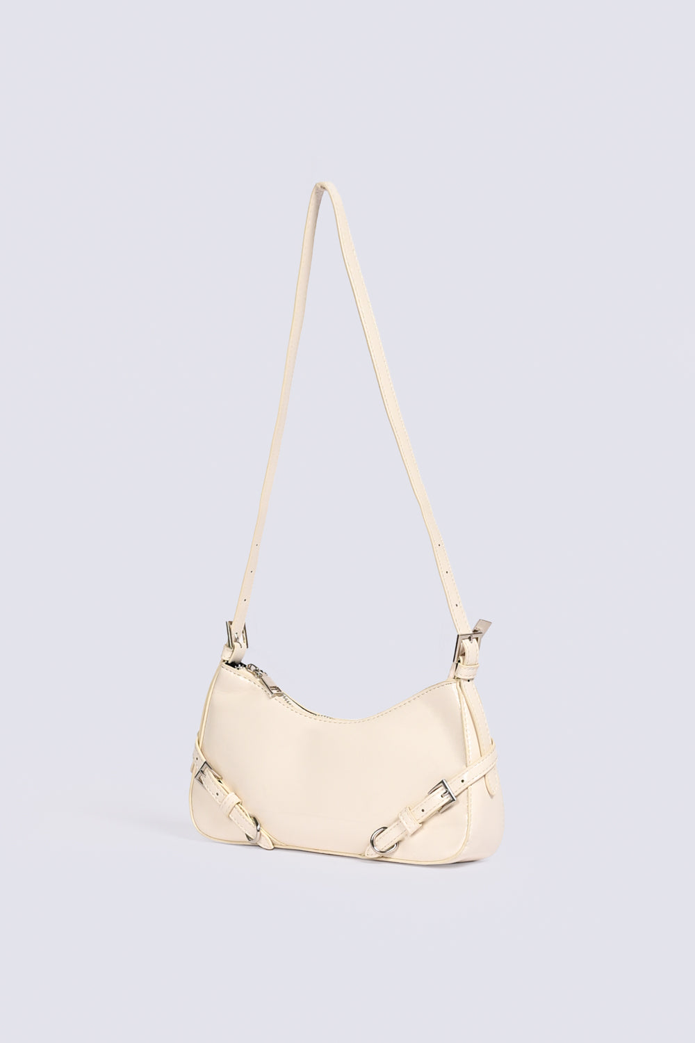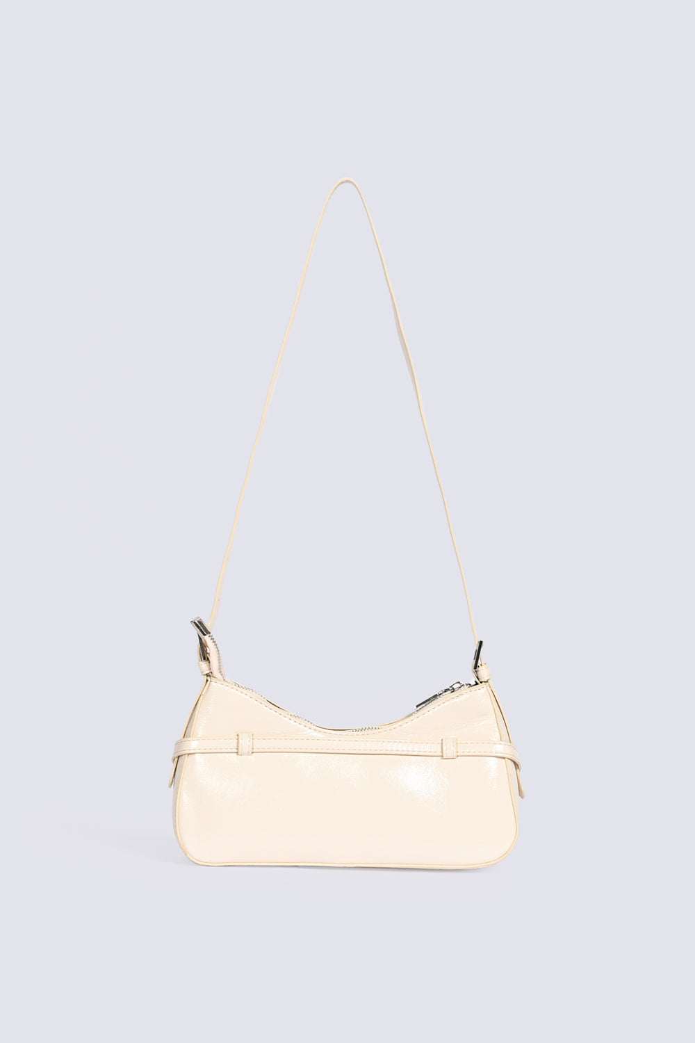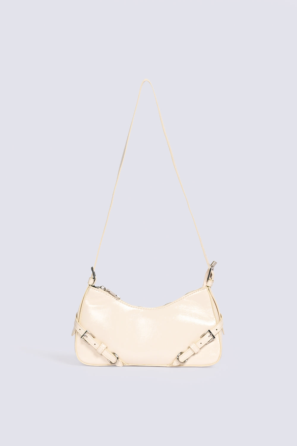 Off-white patent shoulder bag with a sleek finish, detailed with a buckle accent and silver hardware.