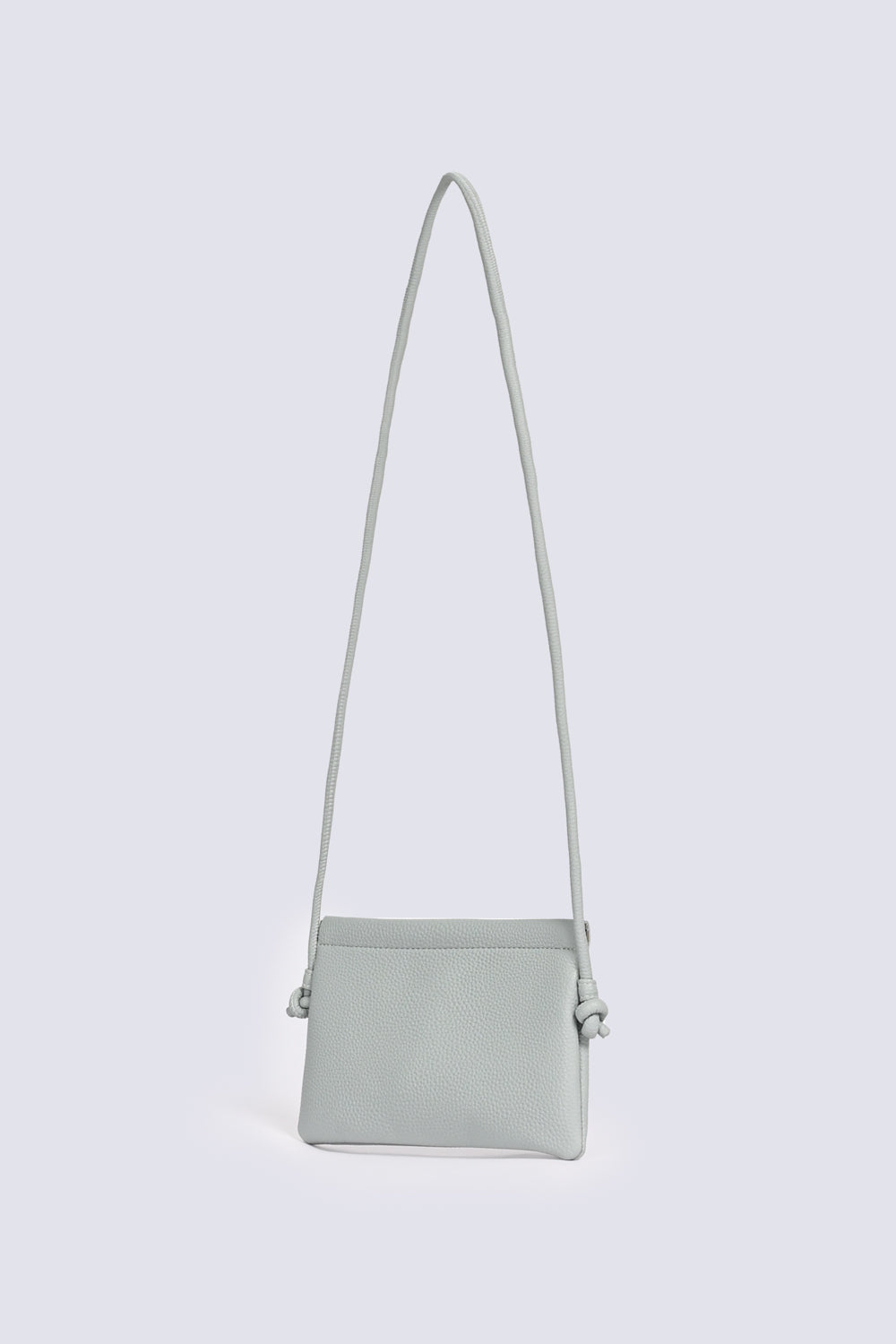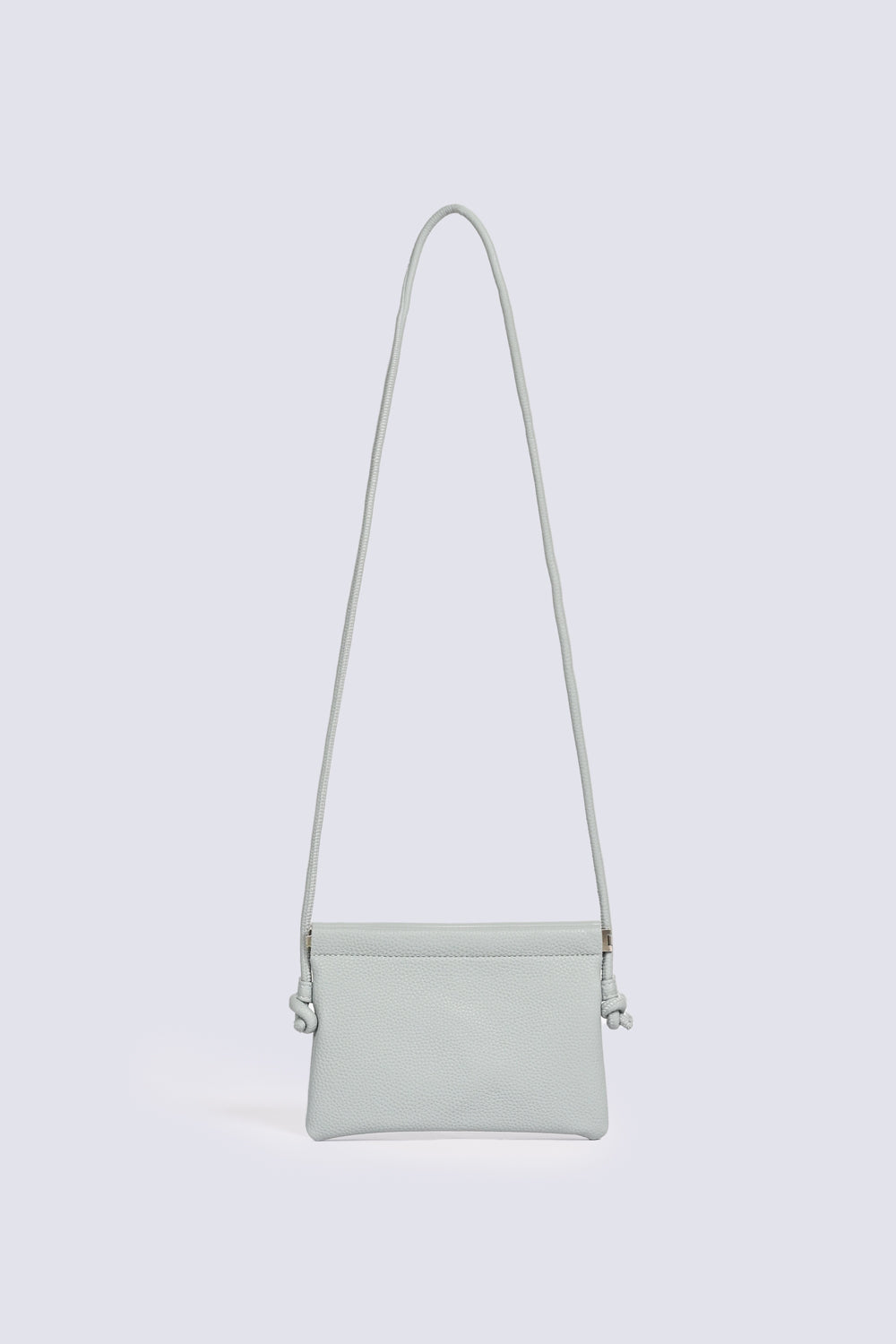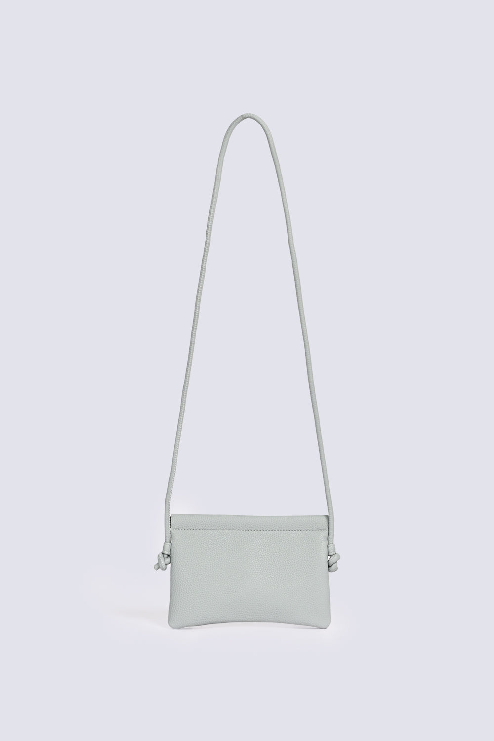 Bluish grey pouch with a clean minimal design, finished with a hinged clasp detail.