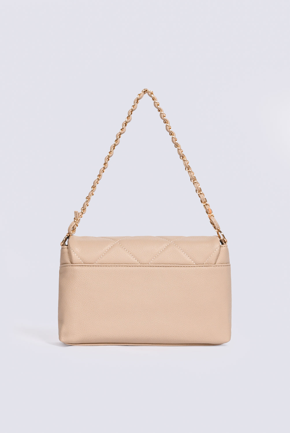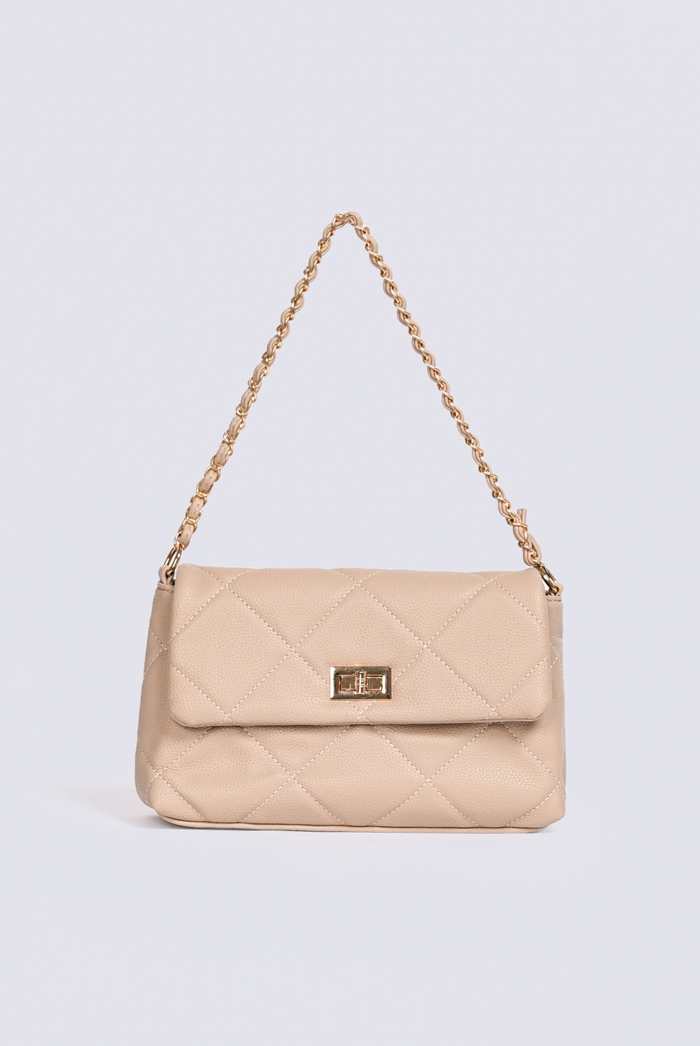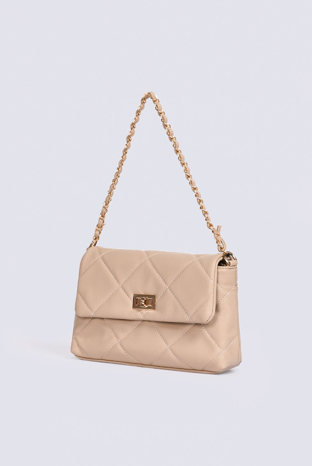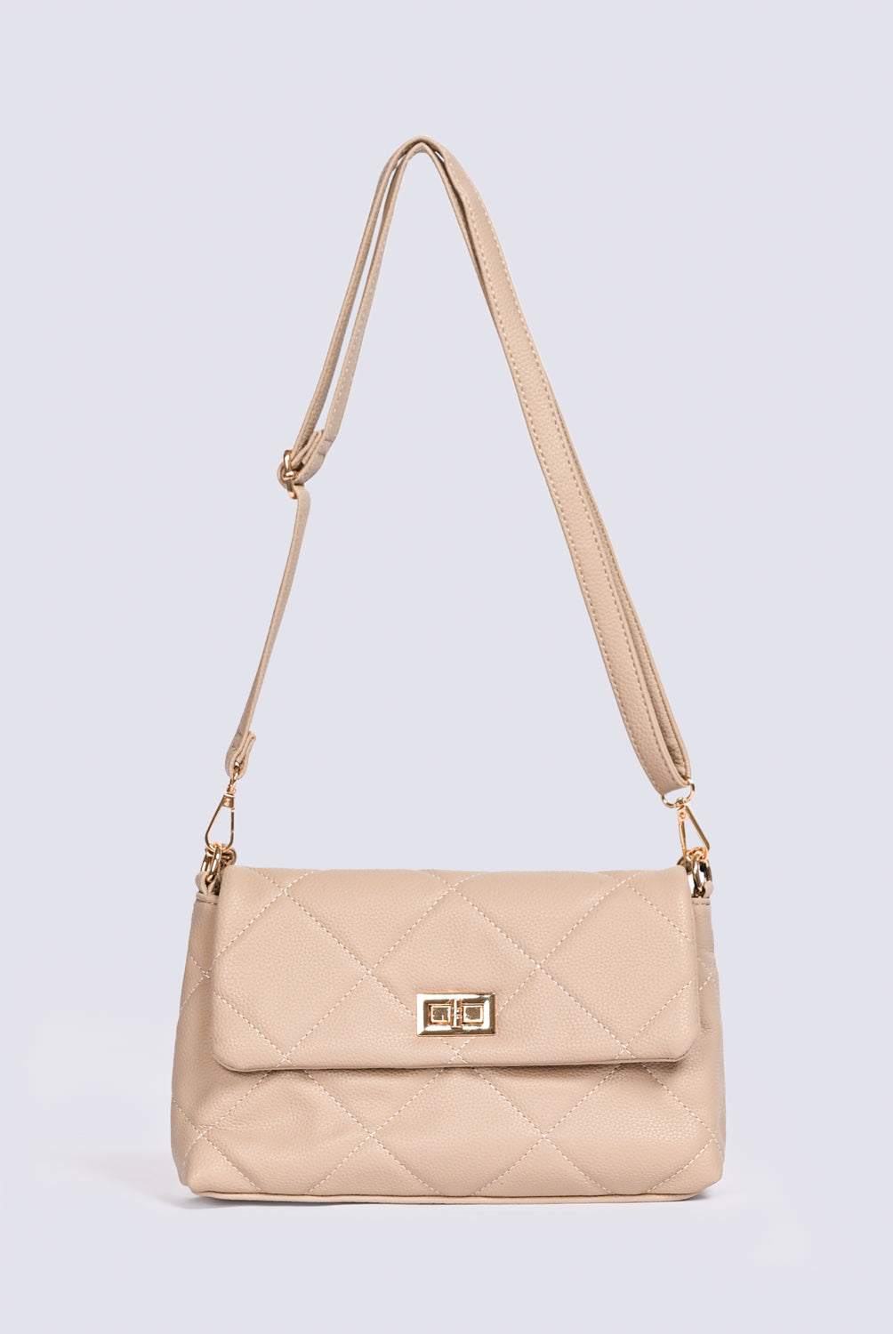 Beige quilted shoulder bag with gold accents and a twist clasp closure, complete with two detachable straps.