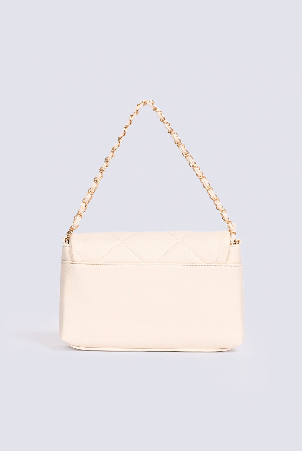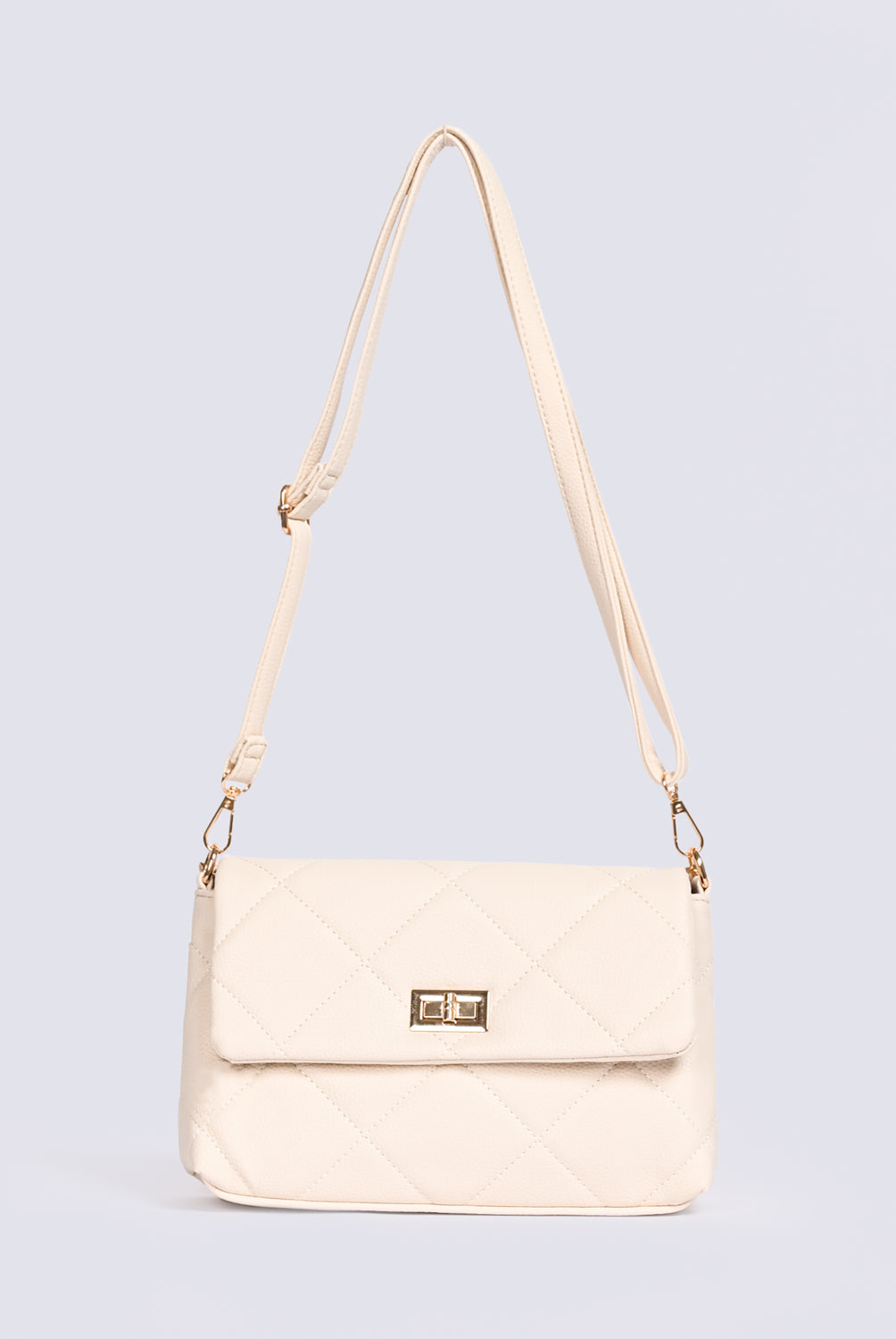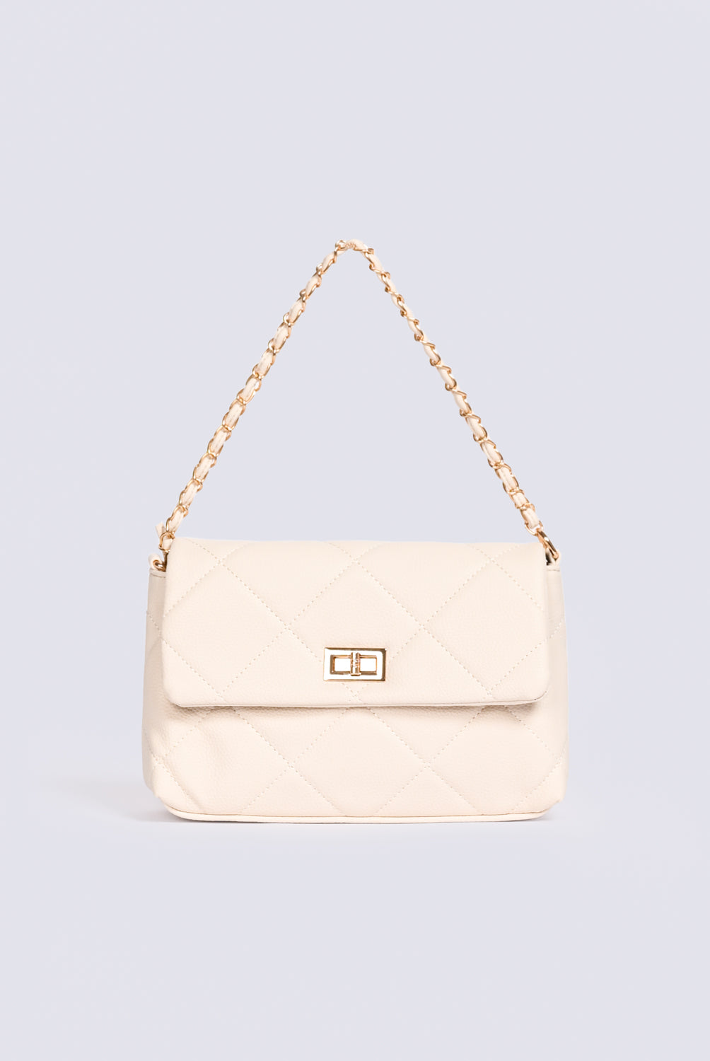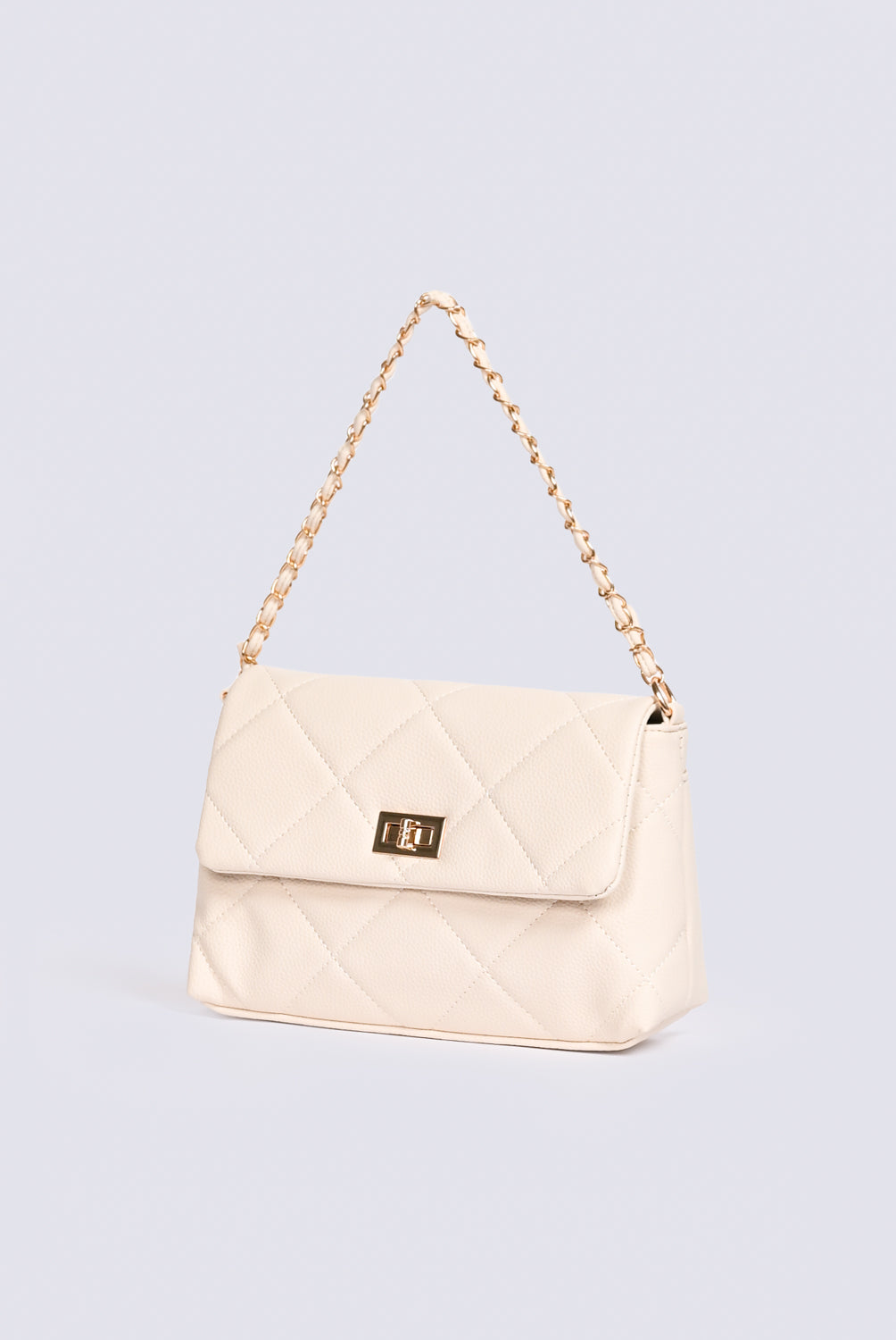 Off-white quilted shoulder bag with gold accents and a twist clasp closure, complete with two detachable straps.