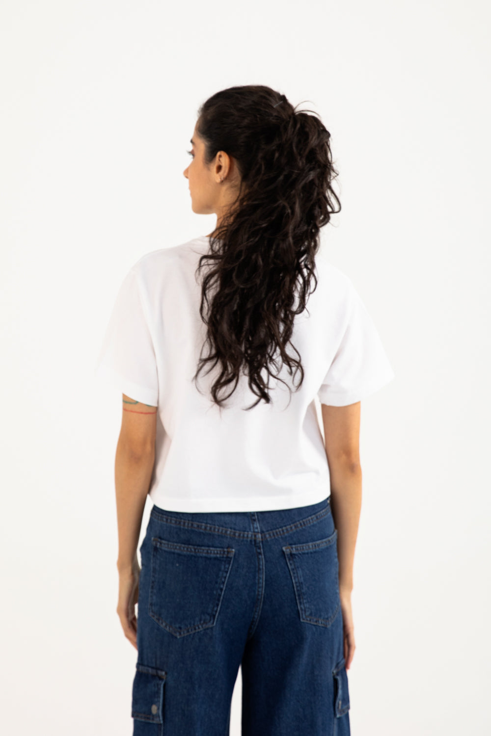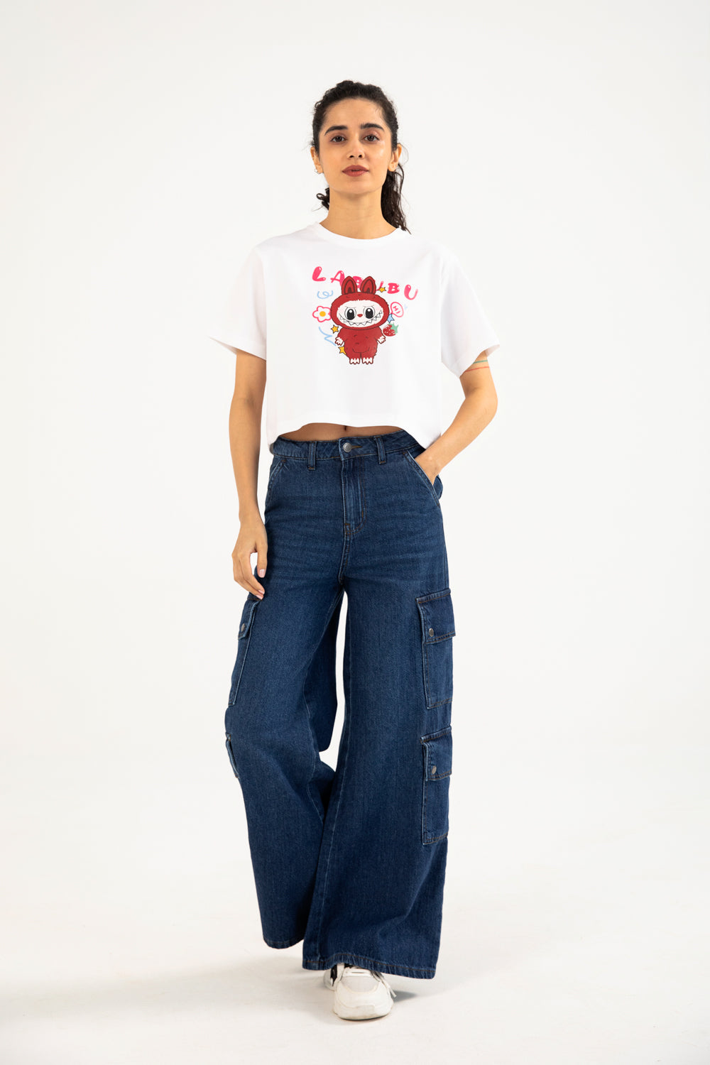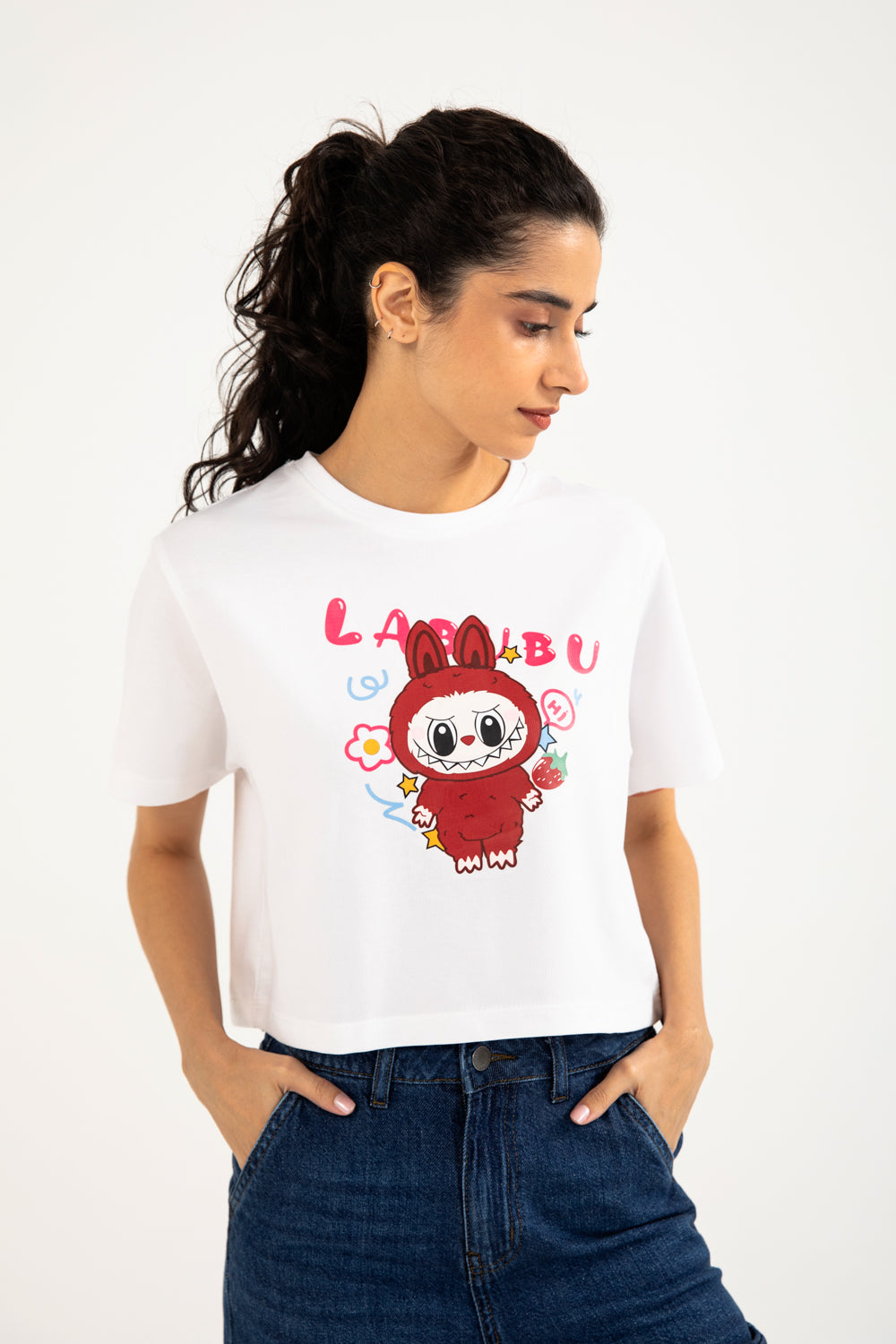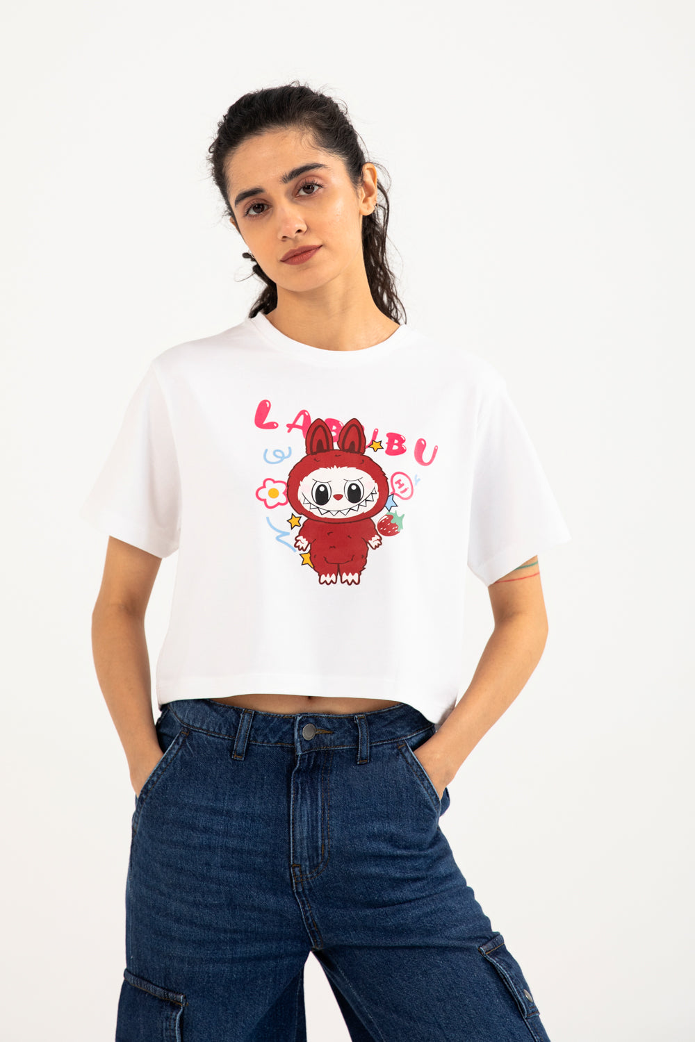 A cropped cotton tee with a playful Labubu print on the front, designed in a lightly textured finish.