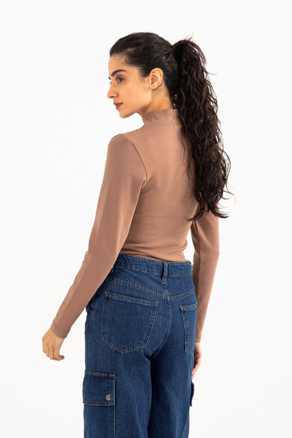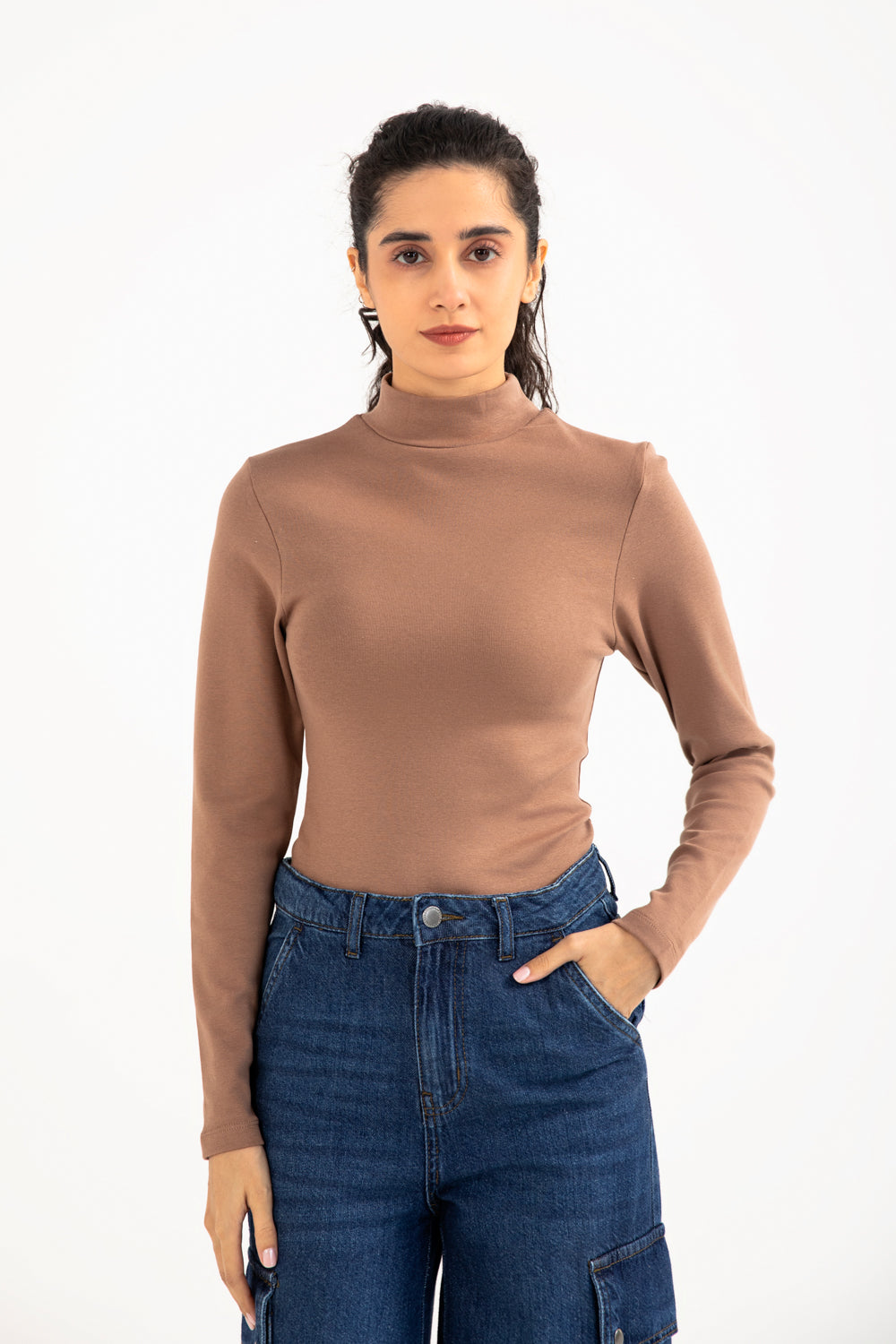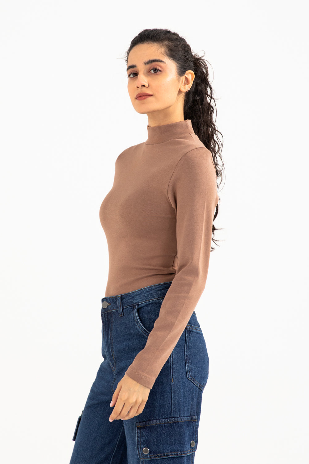 Ribbed highneck top in brown crafted from cotton with a sleek body hugging fit and full length sleeves for a clean, minimal look.