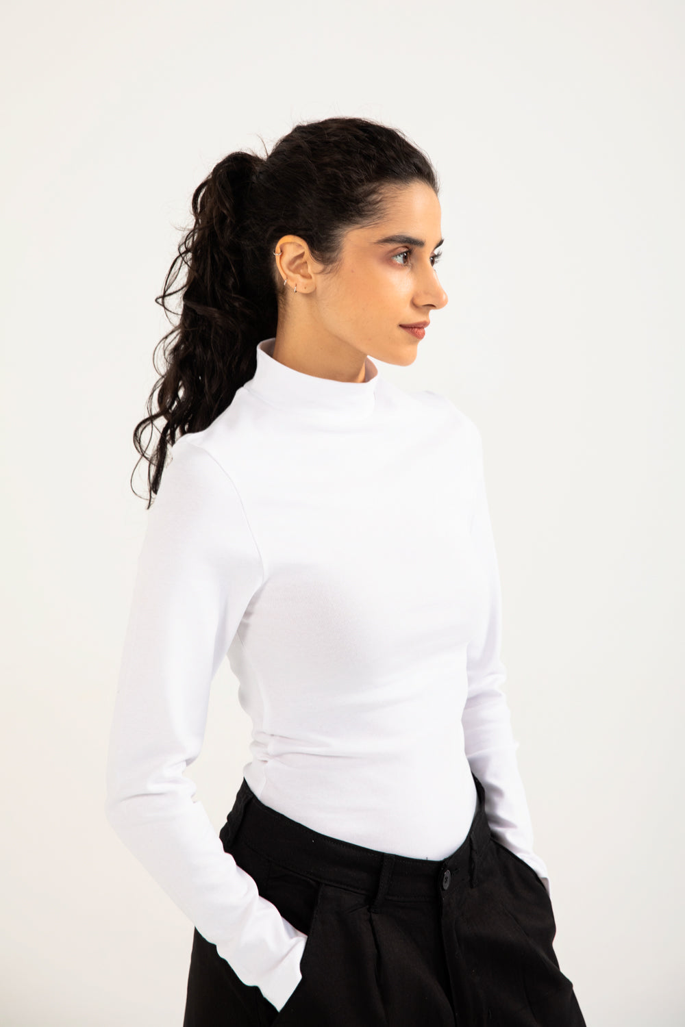 Ribbed highneck top in white crafted from cotton with a sleek body hugging fit and full length sleeves for a clean, minimal look.