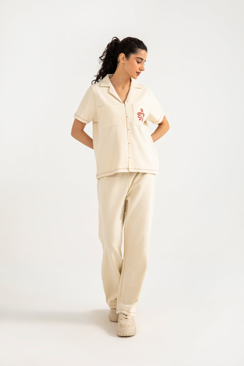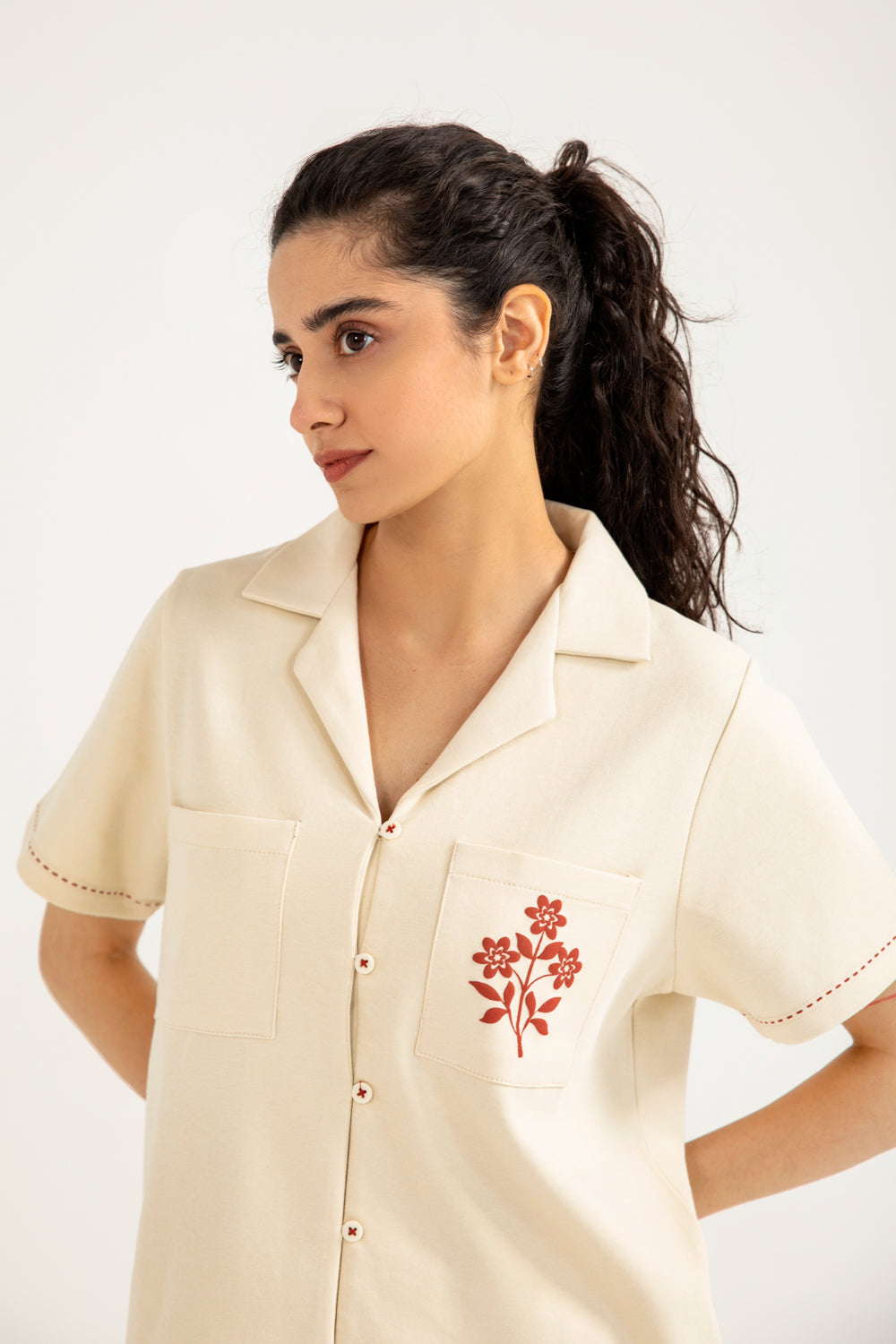 Button down top in beige made from a soft cotton blend, featuring two chest pockets with a contrast print accent on one pocket.