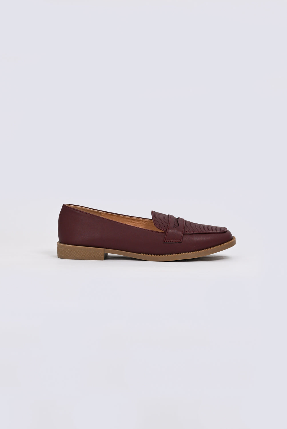 Textured loafers in maroon set on a brown sole with a slight heel.