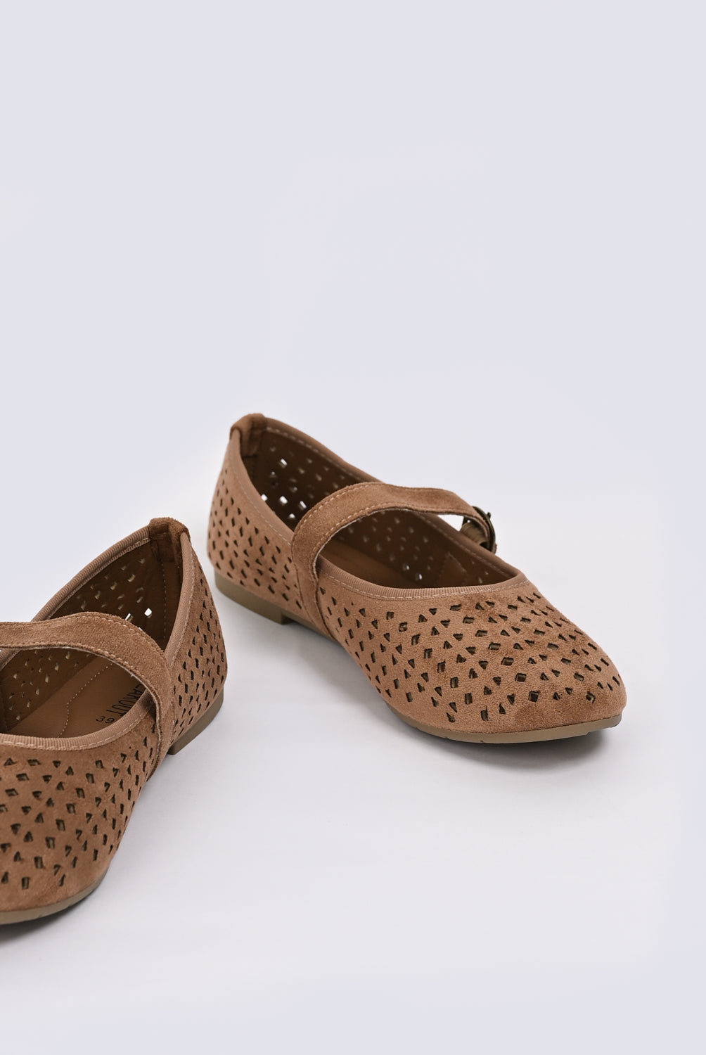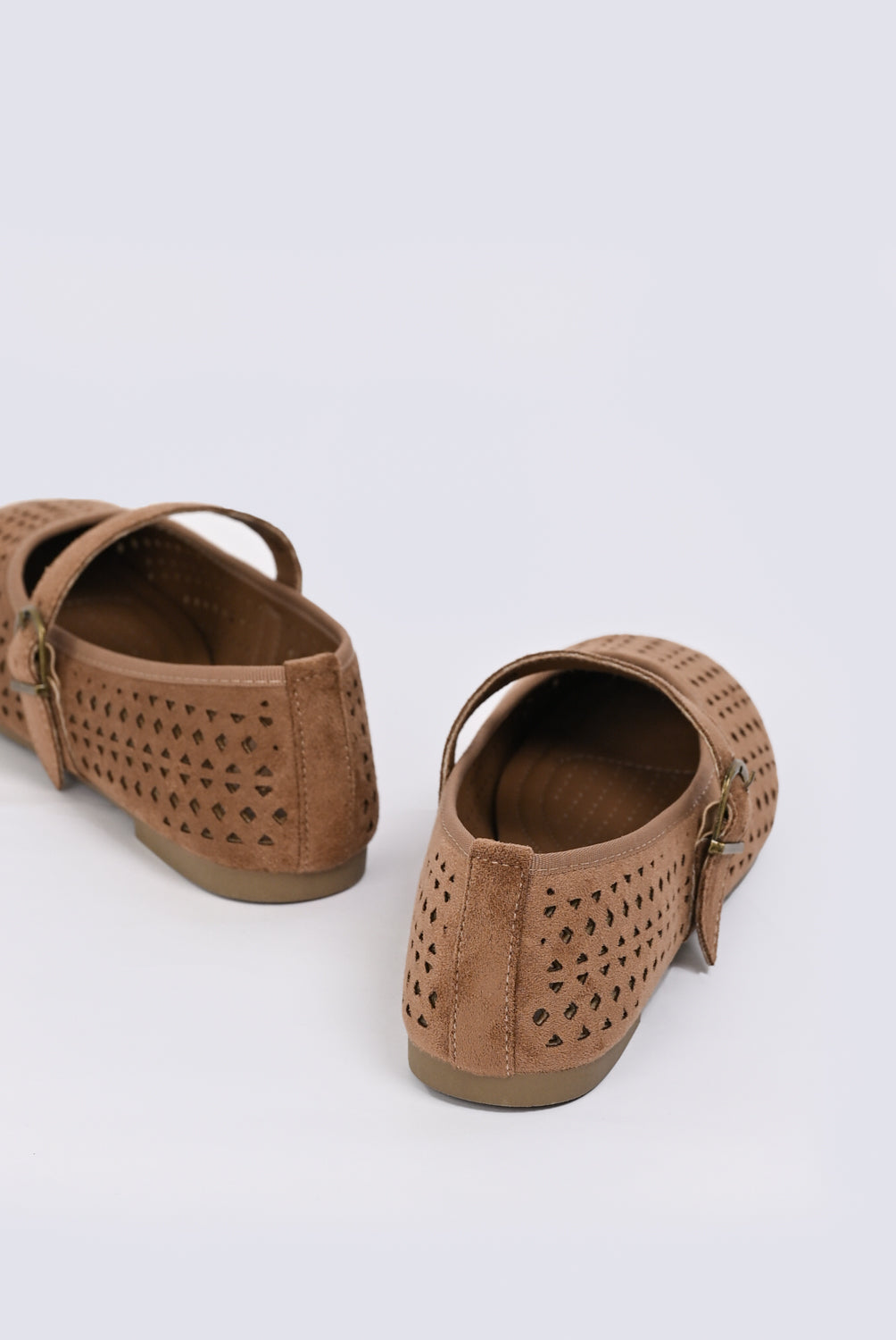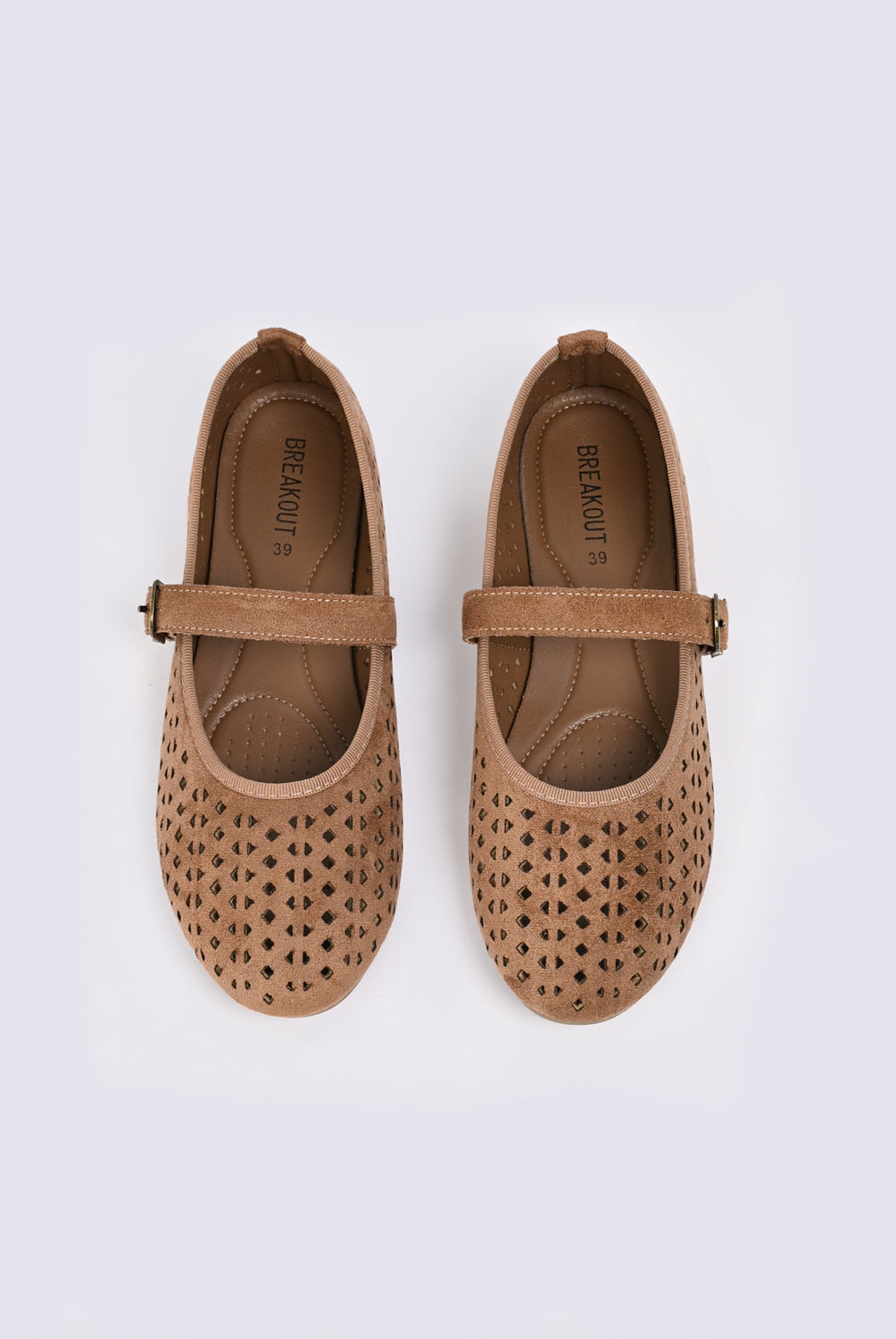 Cutout suede pumps in khaki featuring an upper made of delicate cutouts and a buckle strap.