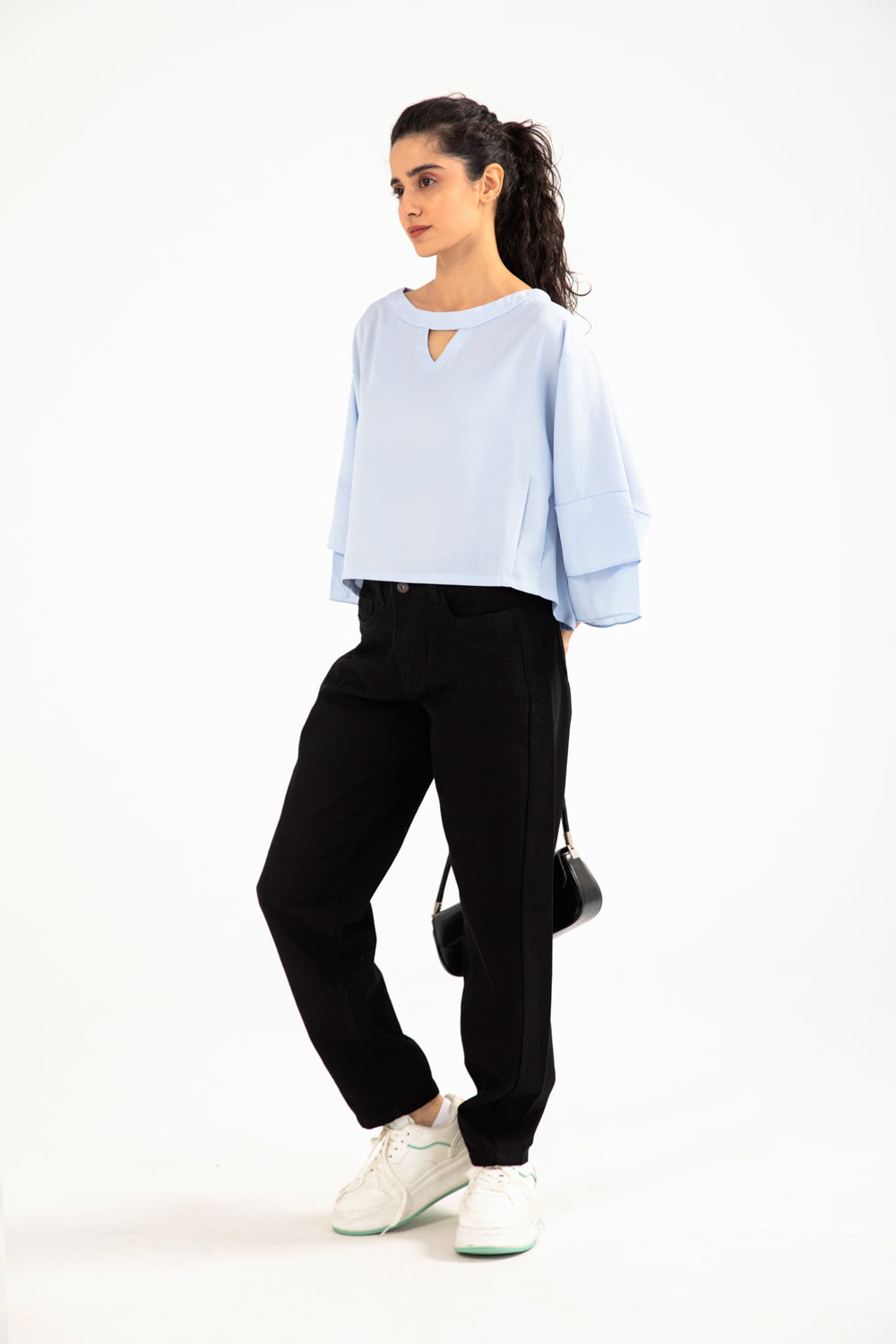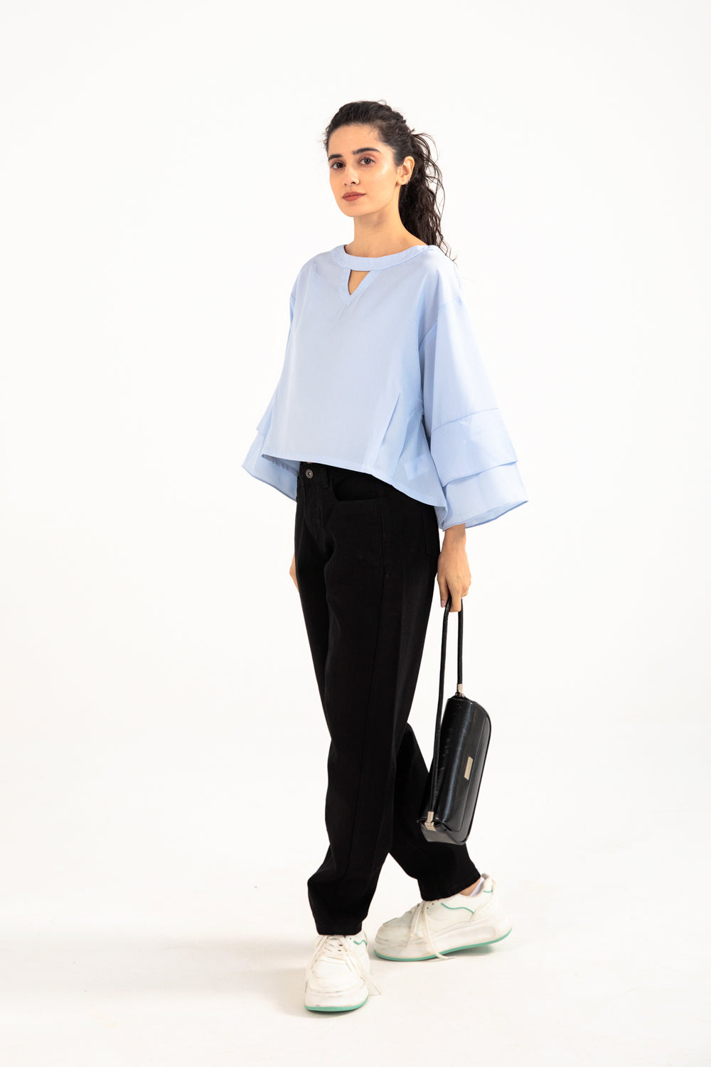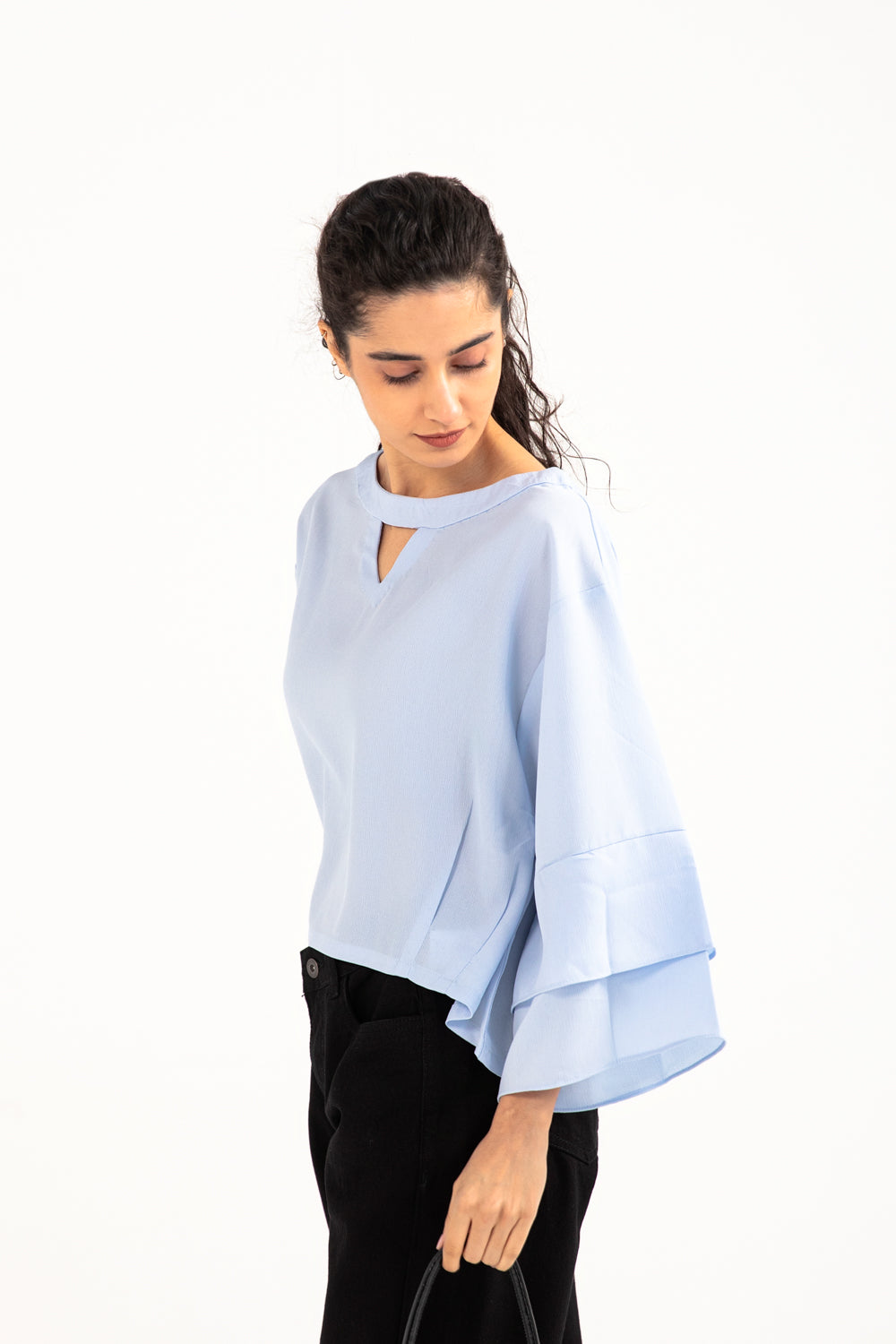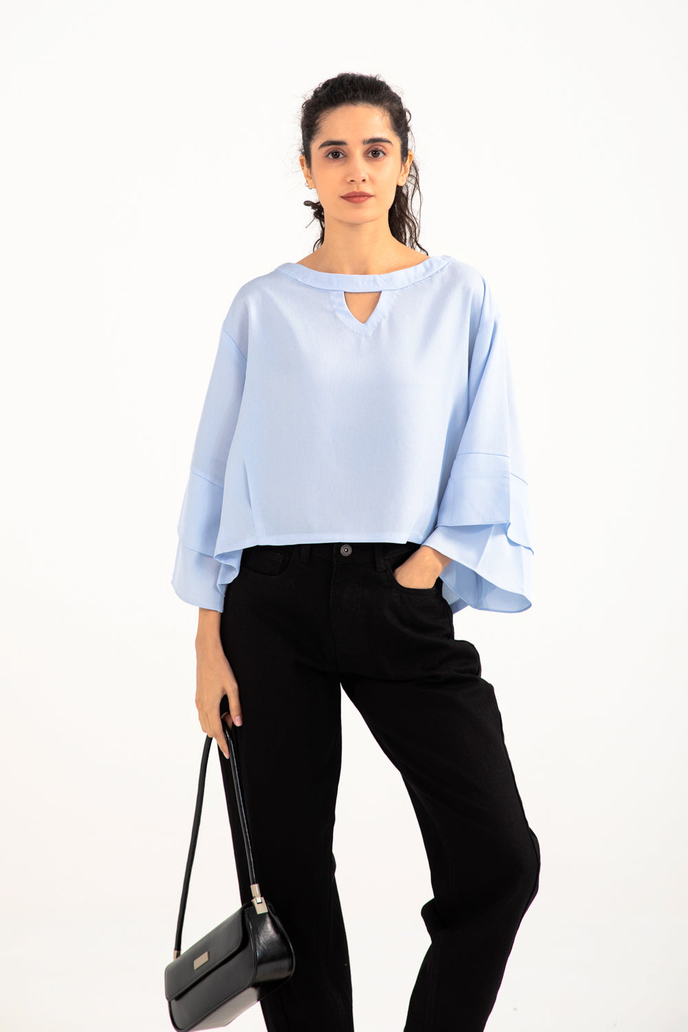 Top in soft blue crafted from a flowy synthetic blend, featuring wide layered sleeves, a keyhole neckline, and pleated detailing along the hem for added dimension.