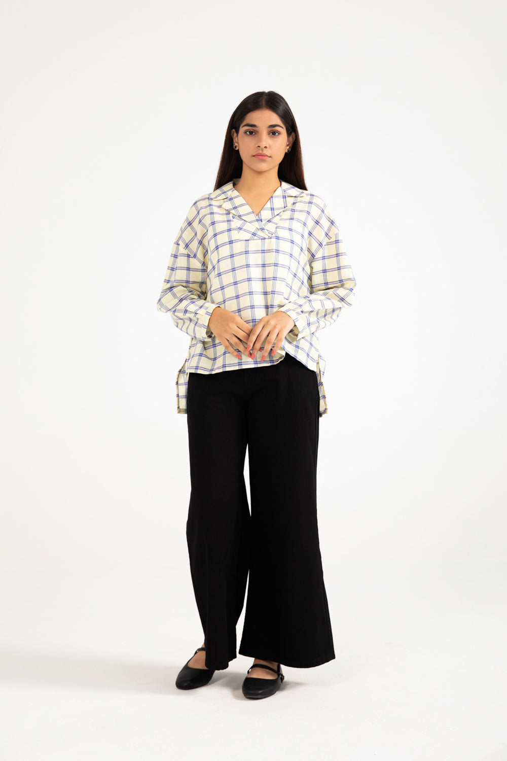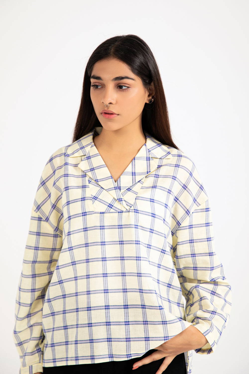 Butter yellow top with a blue checkered pattern, drop shoulder fit, collar detail, and full-length sleeves.