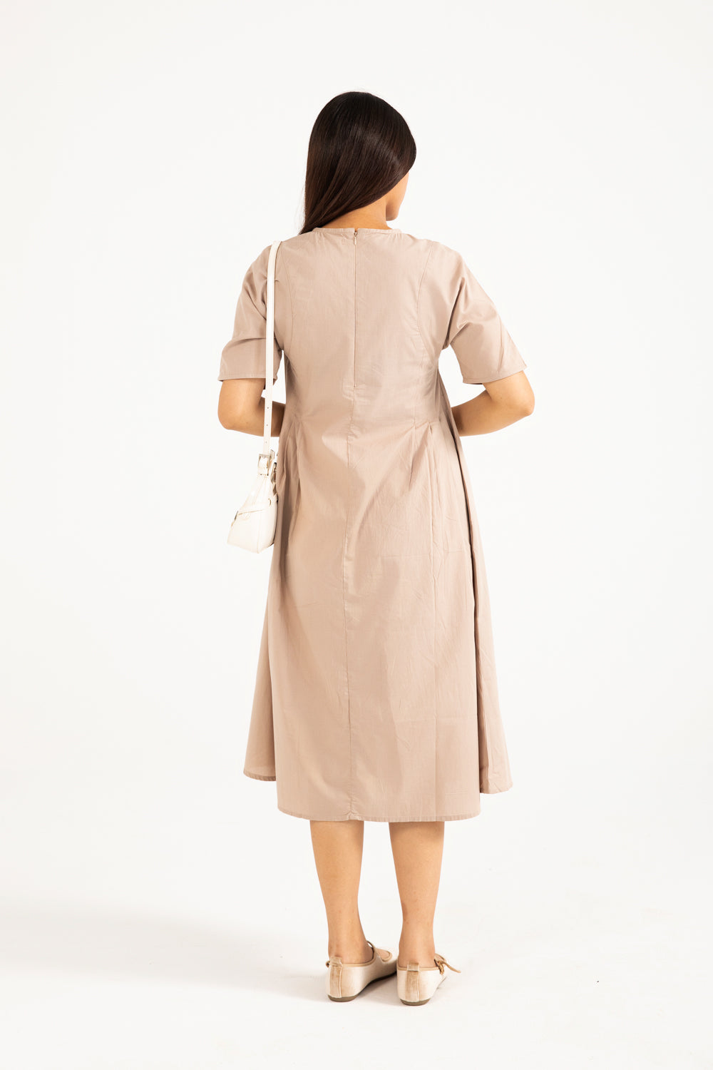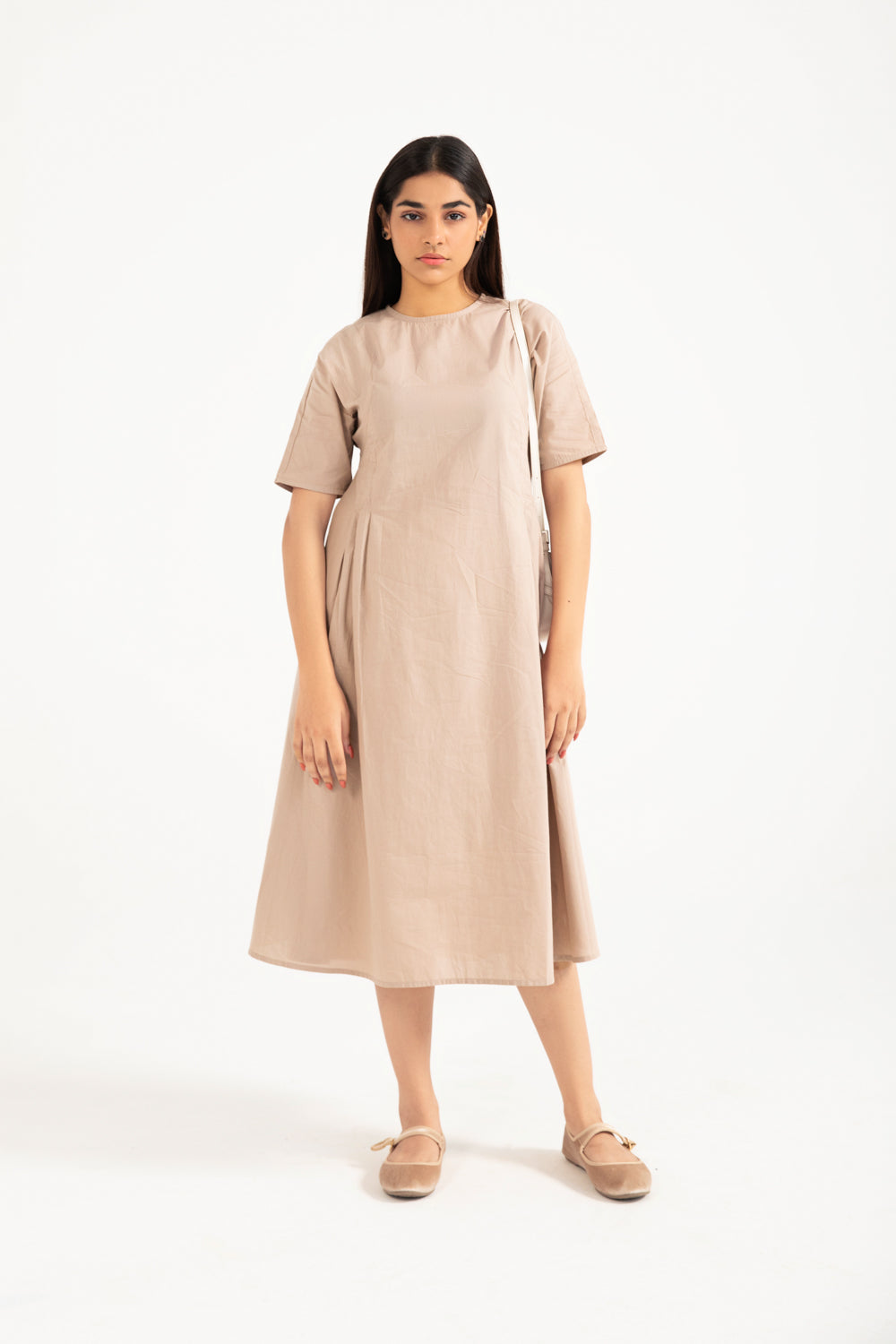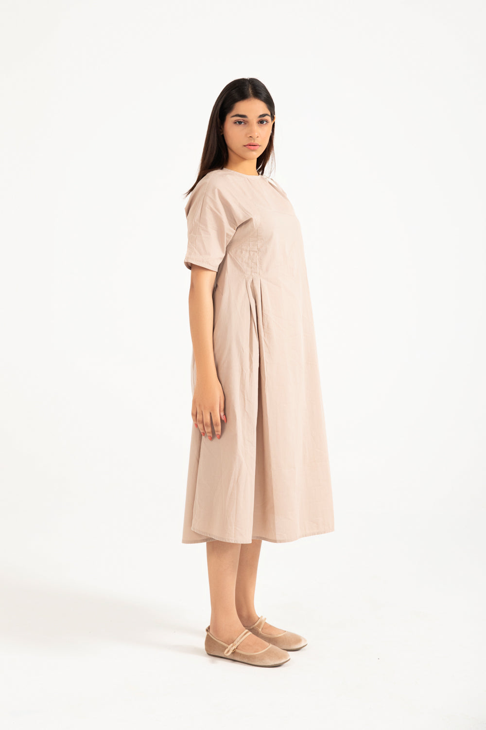 Beige cotton dress with a minimal design, featuring pleat details at the waist and a clean armhole cut.