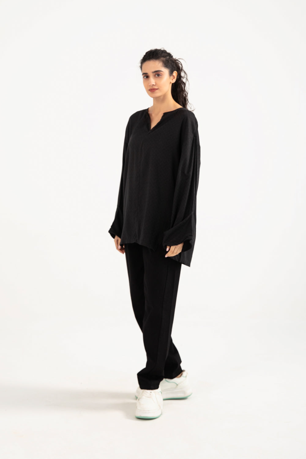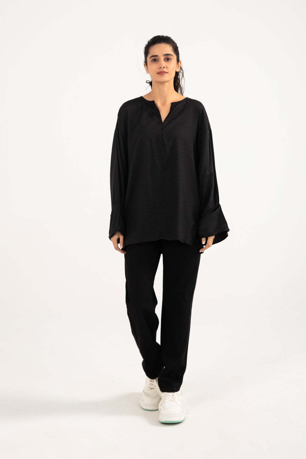 Top in black crafted from cotton with full length flowy sleeves and subtle side seam detailing with a clean finish.
