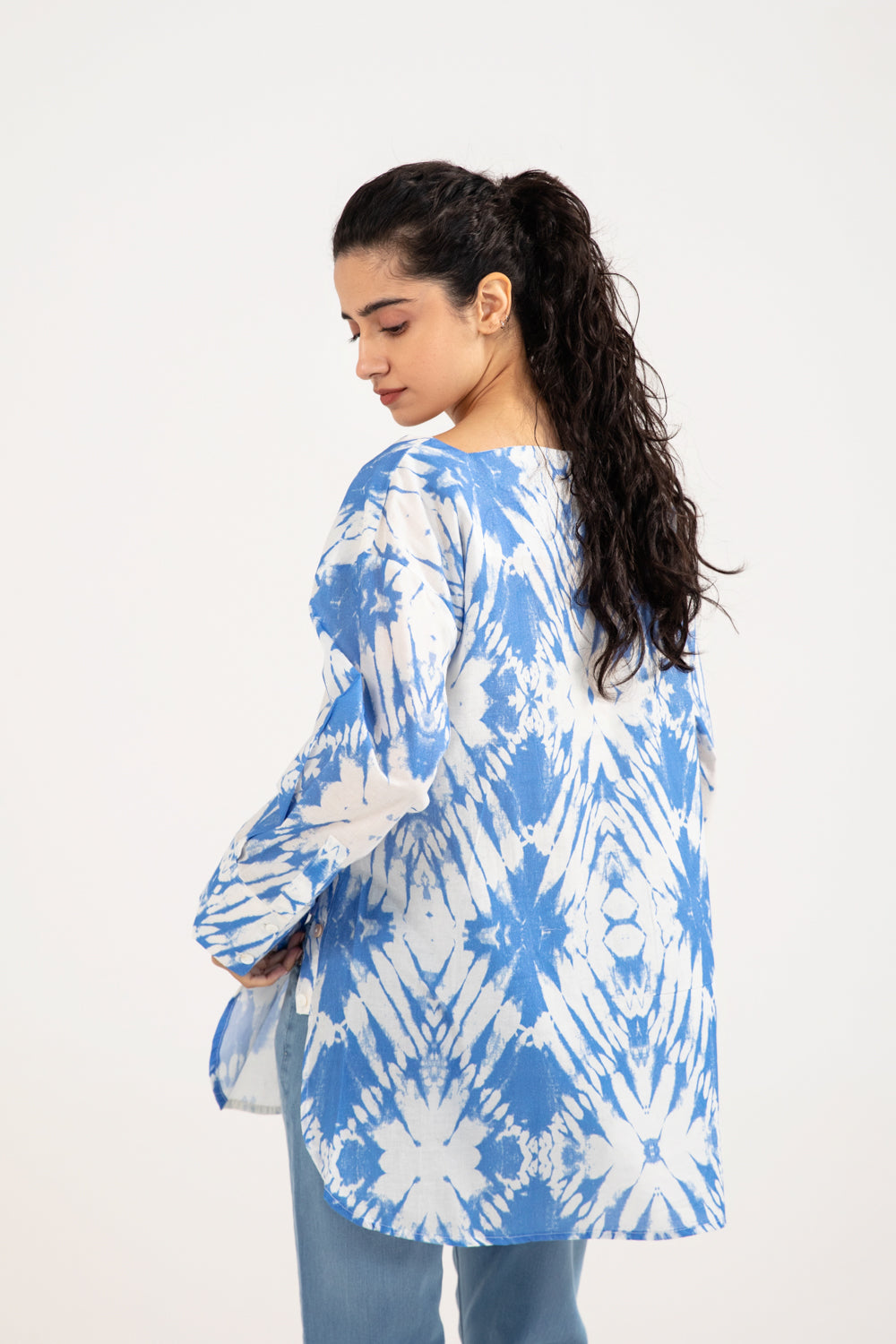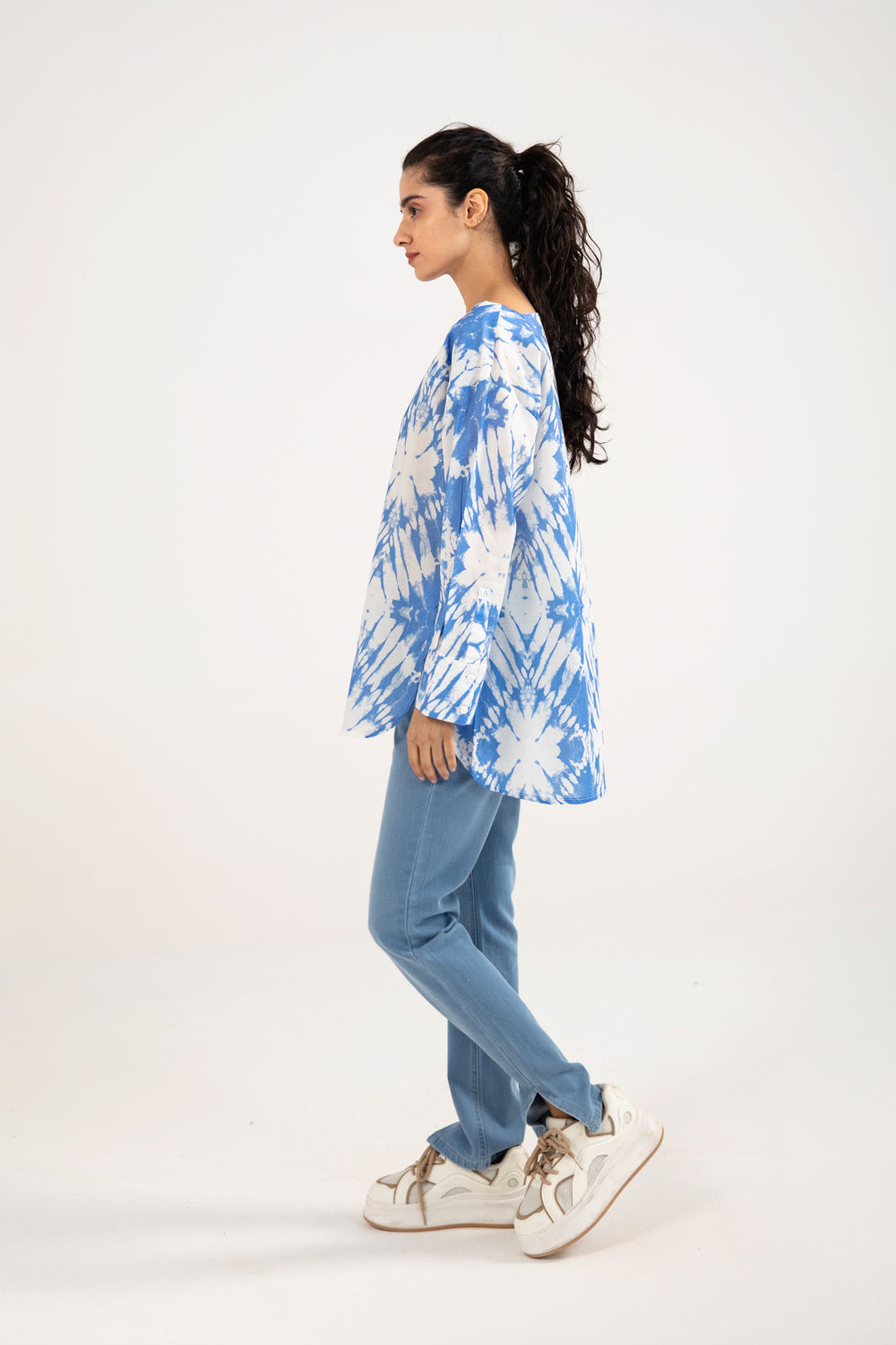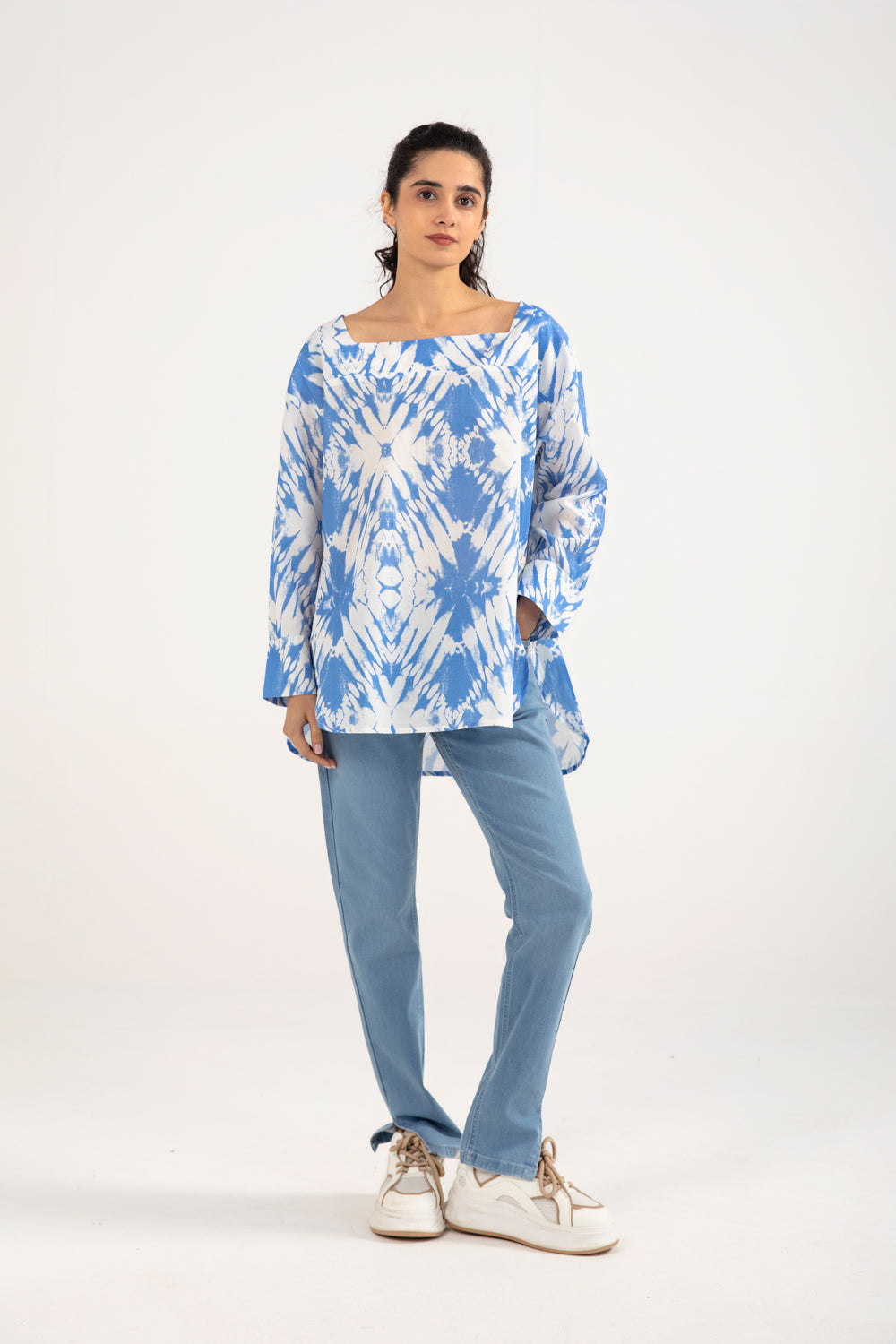 Printed top in blue and white made from cotton with an all over design and full length sleeves.