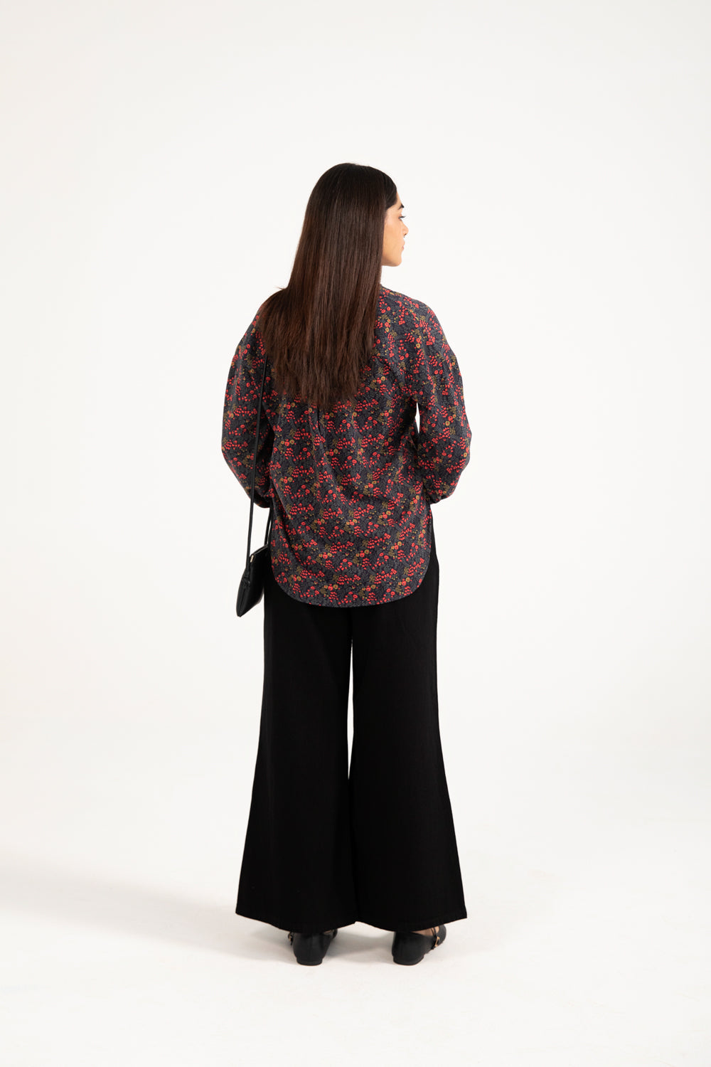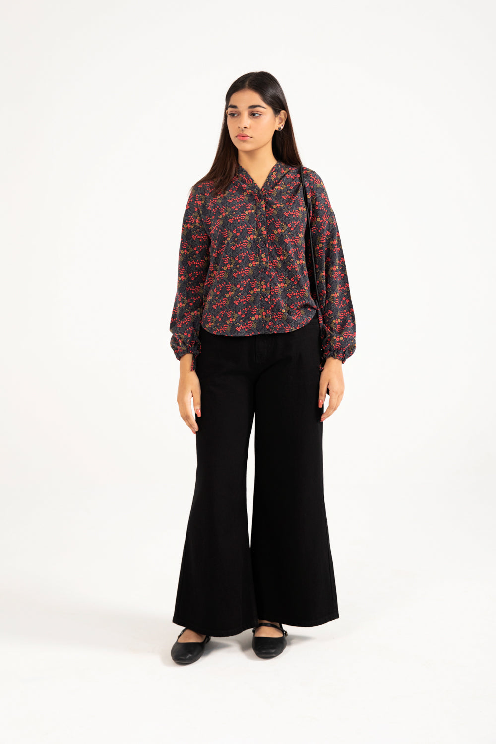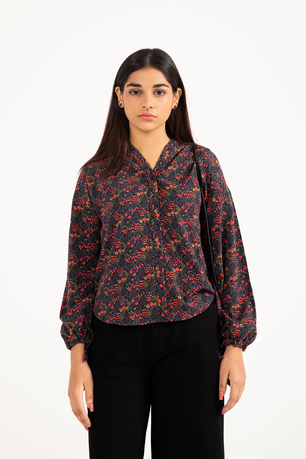 Multi-colored floral print top with full-length sleeves featuring tie accents and elastic cuffs, finished with matching buttons and a shaped hem detail.