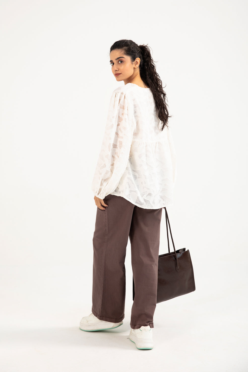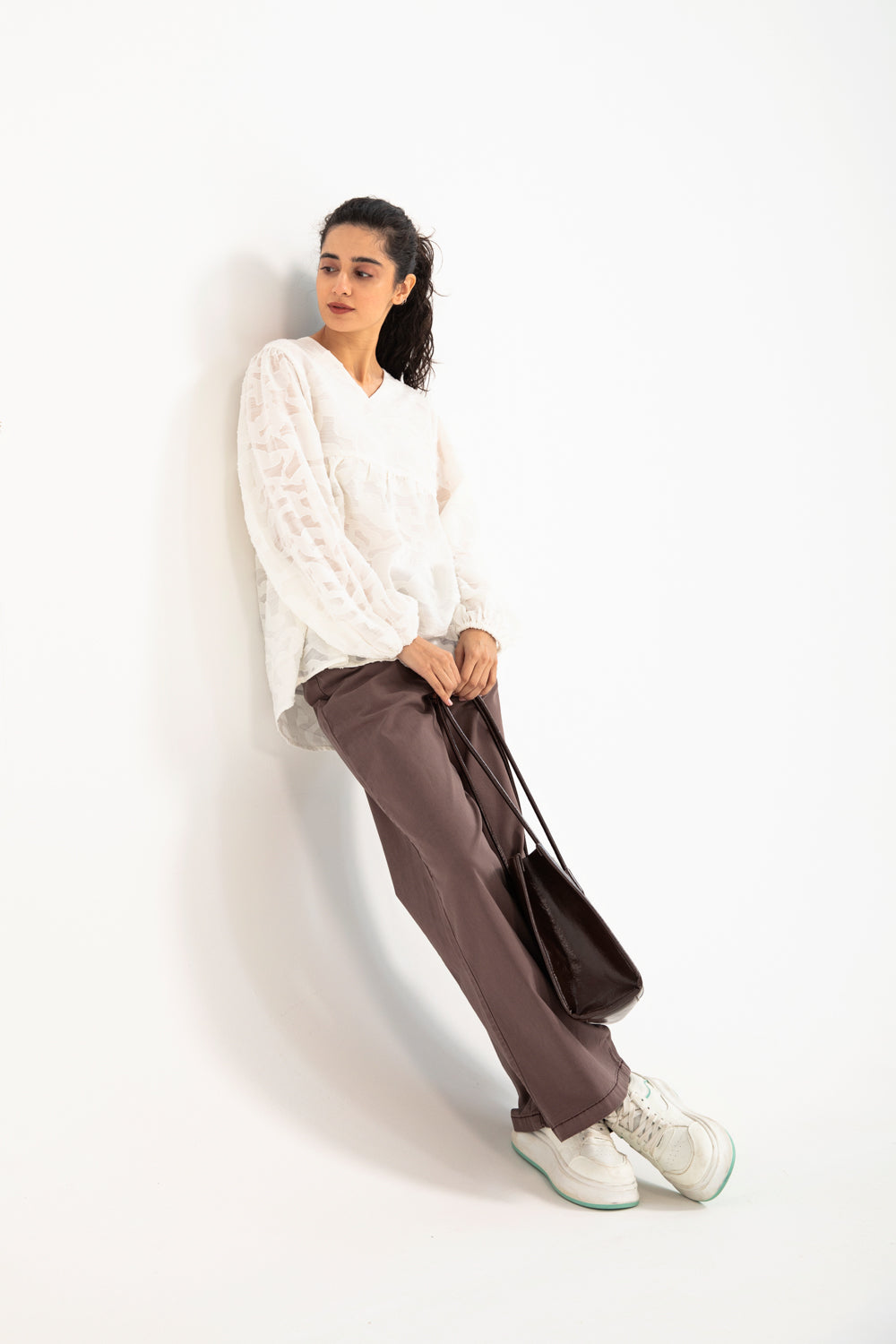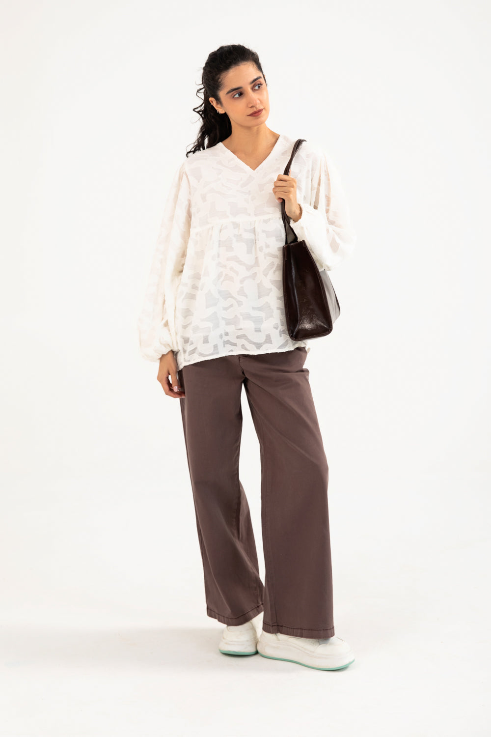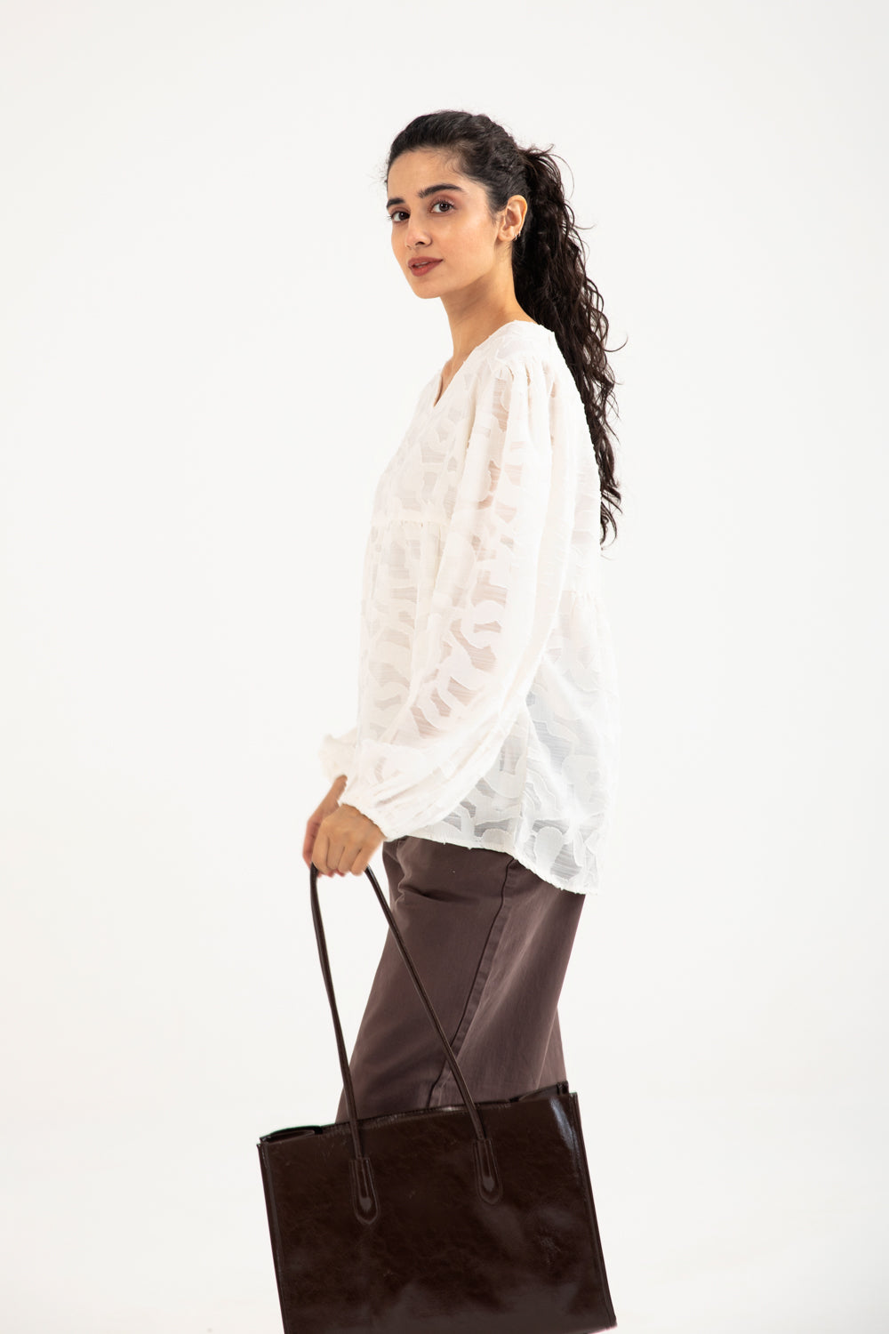 Jacquard peplum top in off white made from a semi sheer cotton blend, featuring a V neckline and cuffed balloon sleeves for a soft, elegant shape.