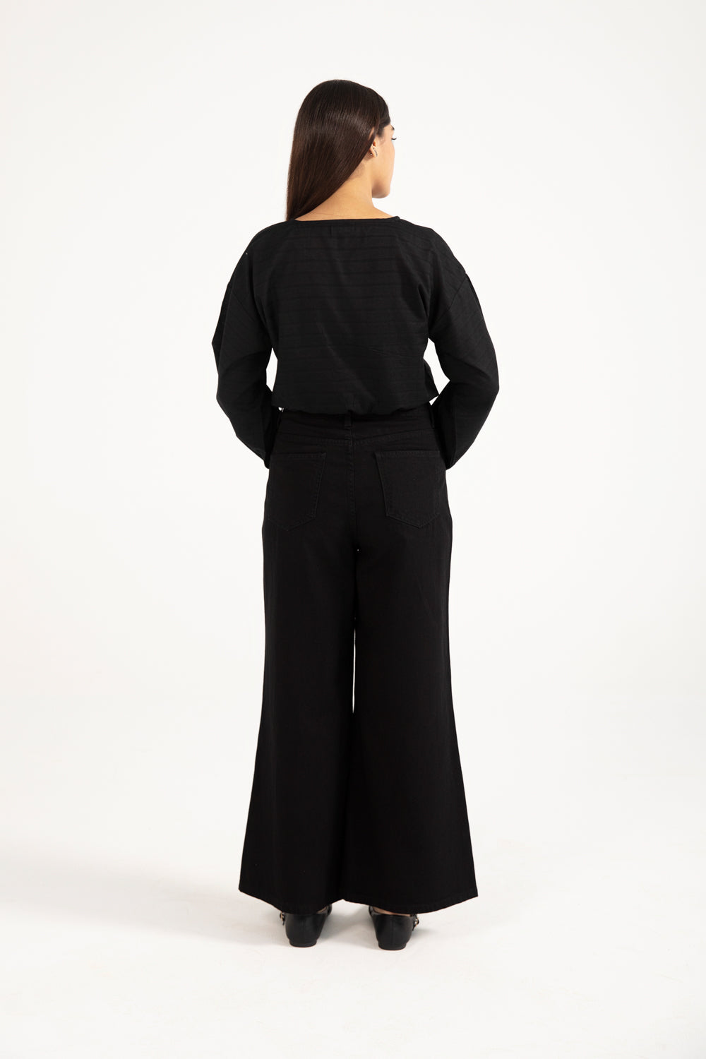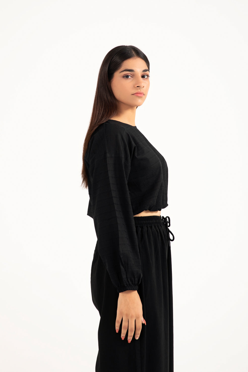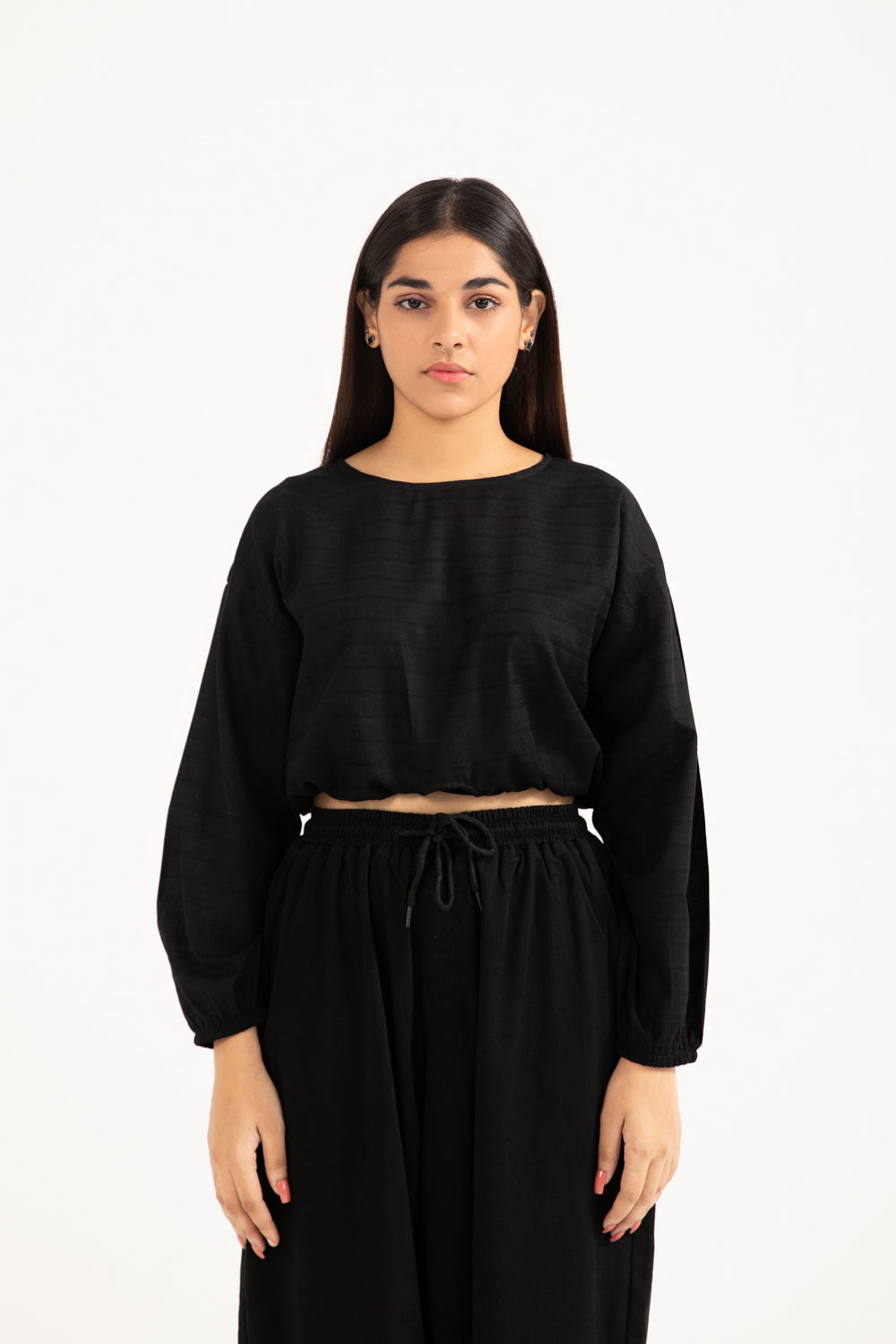 Black blouse in a cotton synthetic blend with a textured horizontal line finish, featuring a cropped elasticated waist with a front tie detail and full-length sleeves with elastic cuffs.