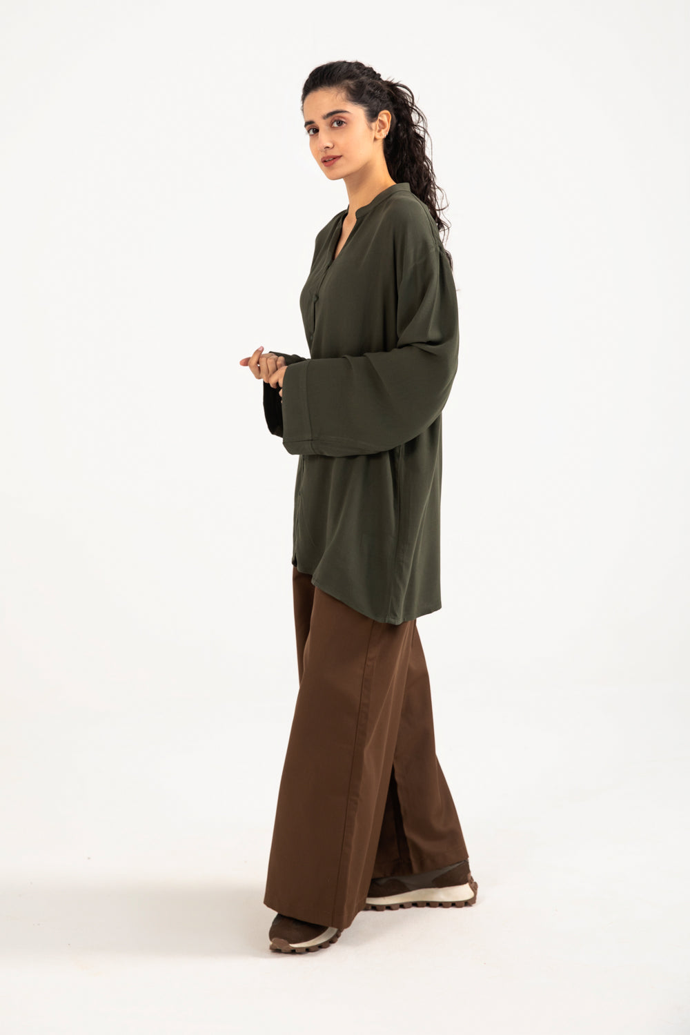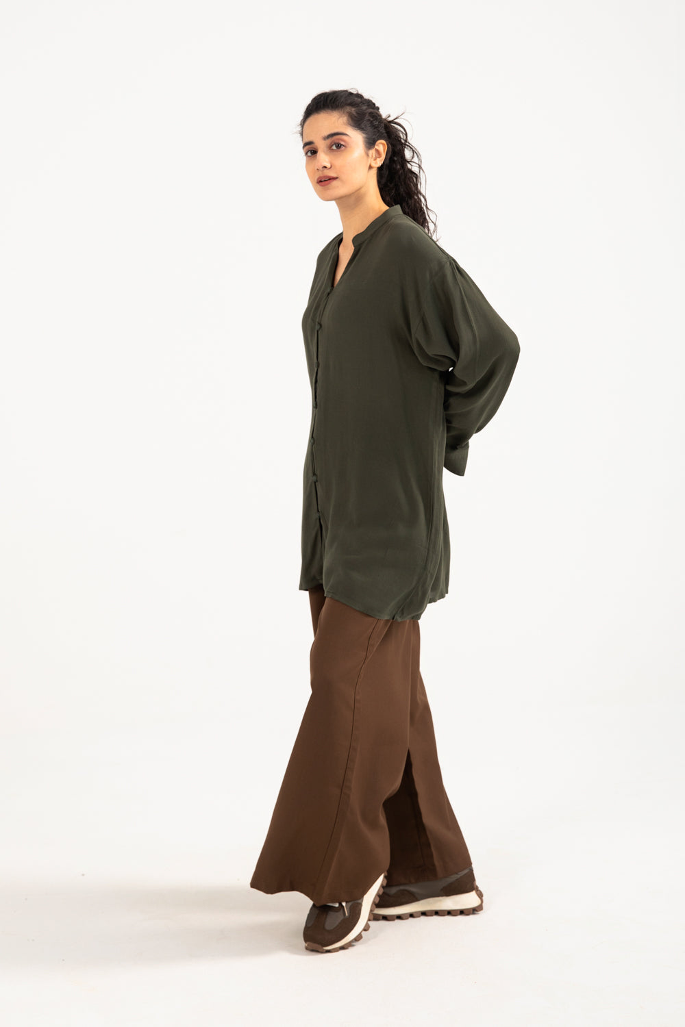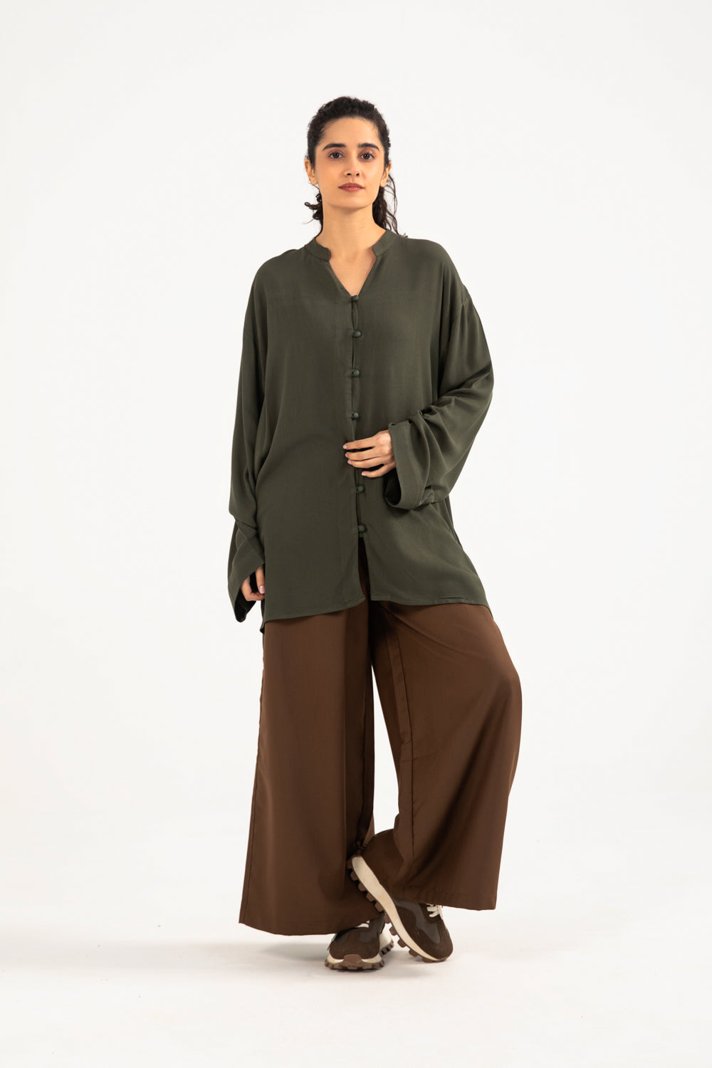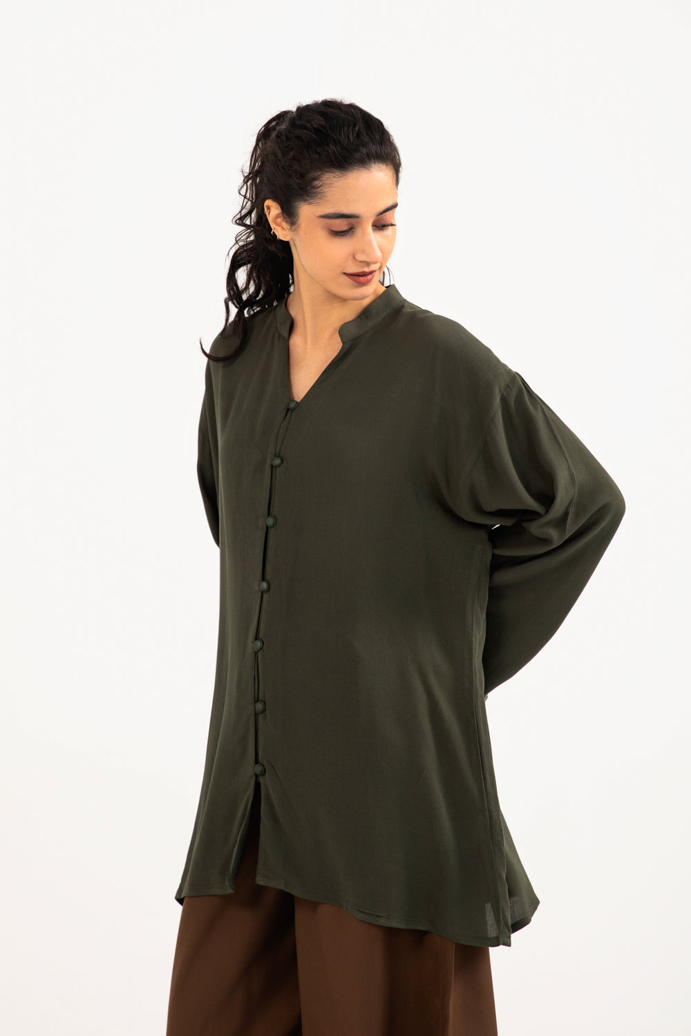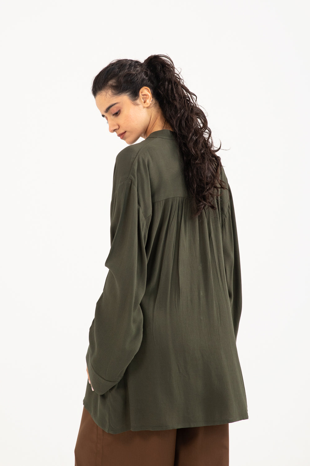 Oversized button down top in olive green made from a flowy synthetic blend with matching buttons for a seamless finish.