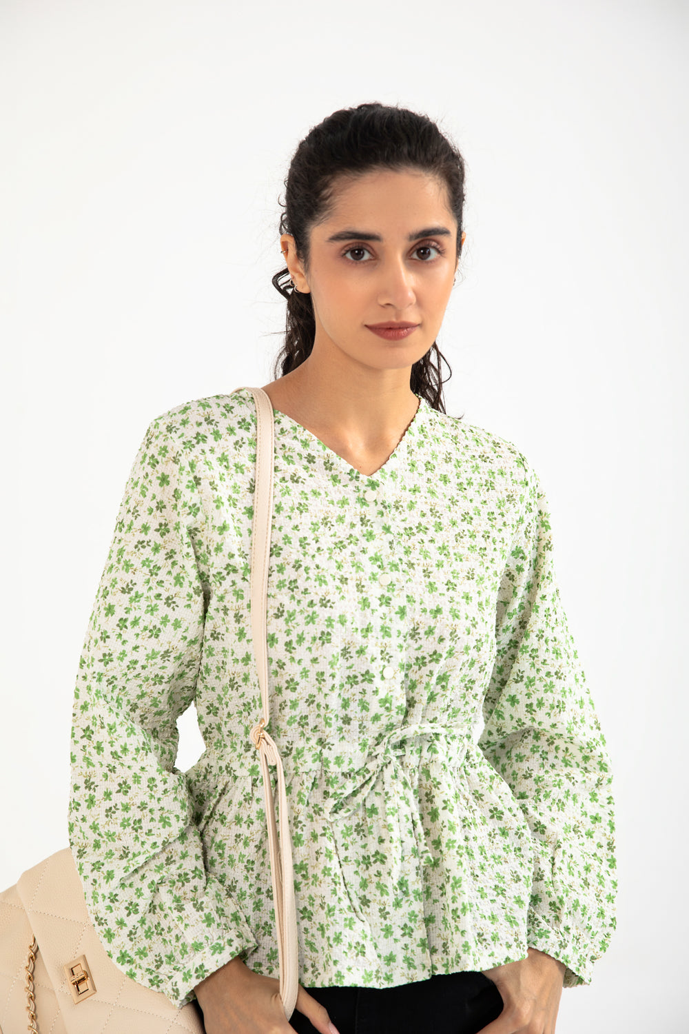 V neck top in white and green crafted from a synthetic blend with full length sleeves, a front waist tie, and an all over floral print that adds a lively charm.