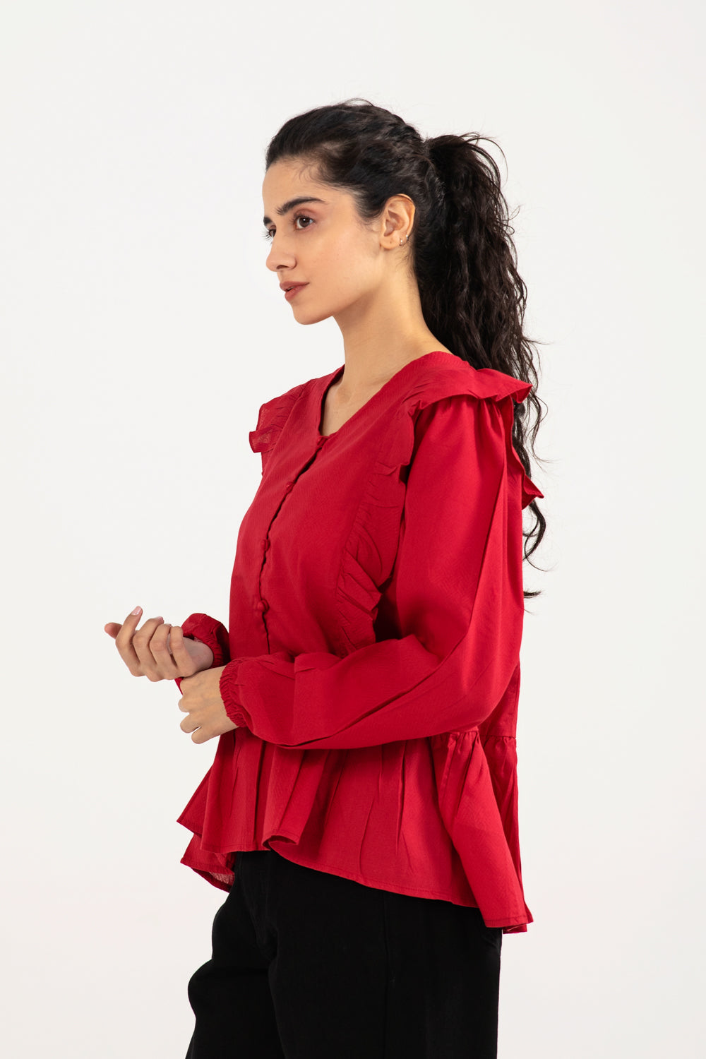 Ruffled peplum top in red crafted from a cotton blend with front buttons and full length cuffed sleeves.