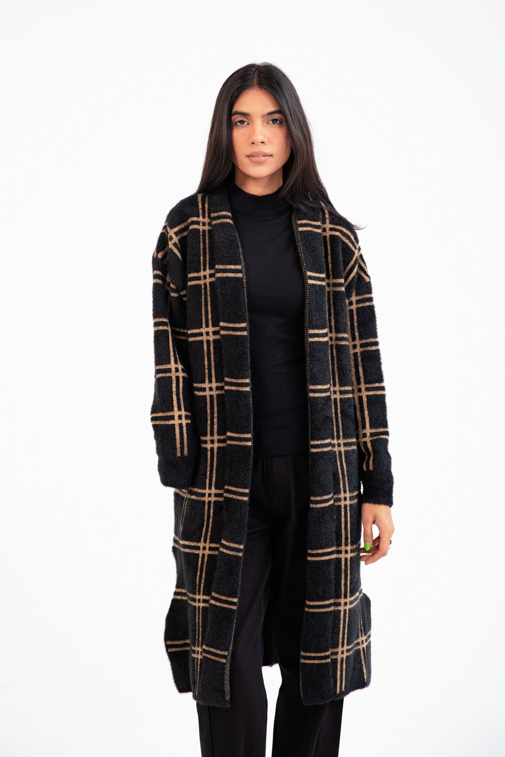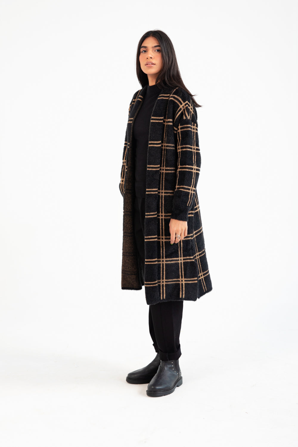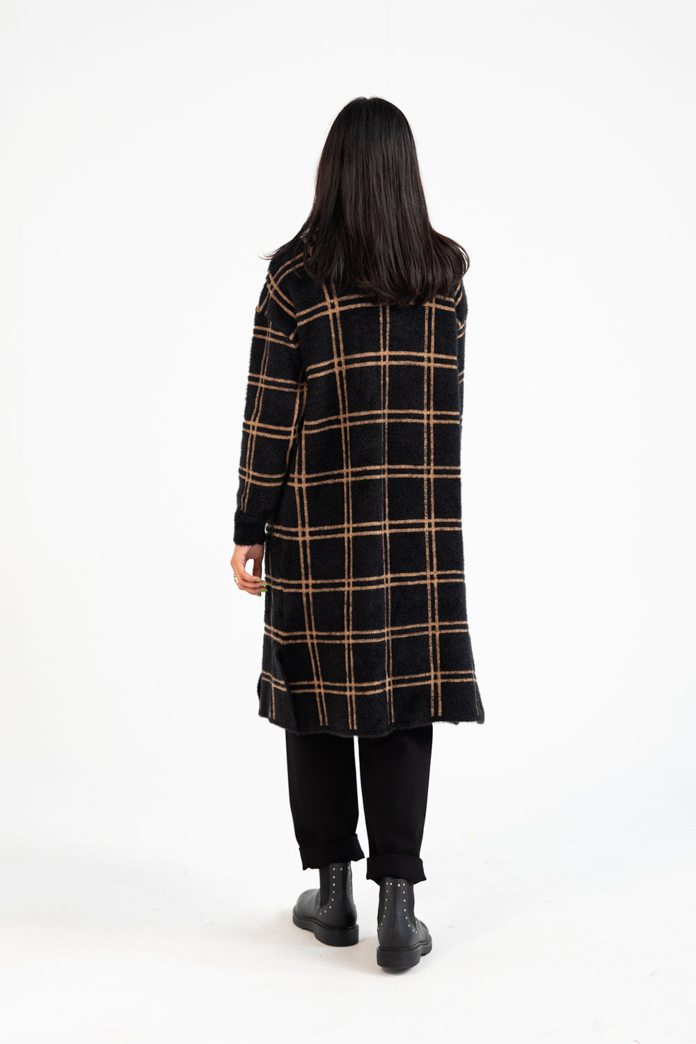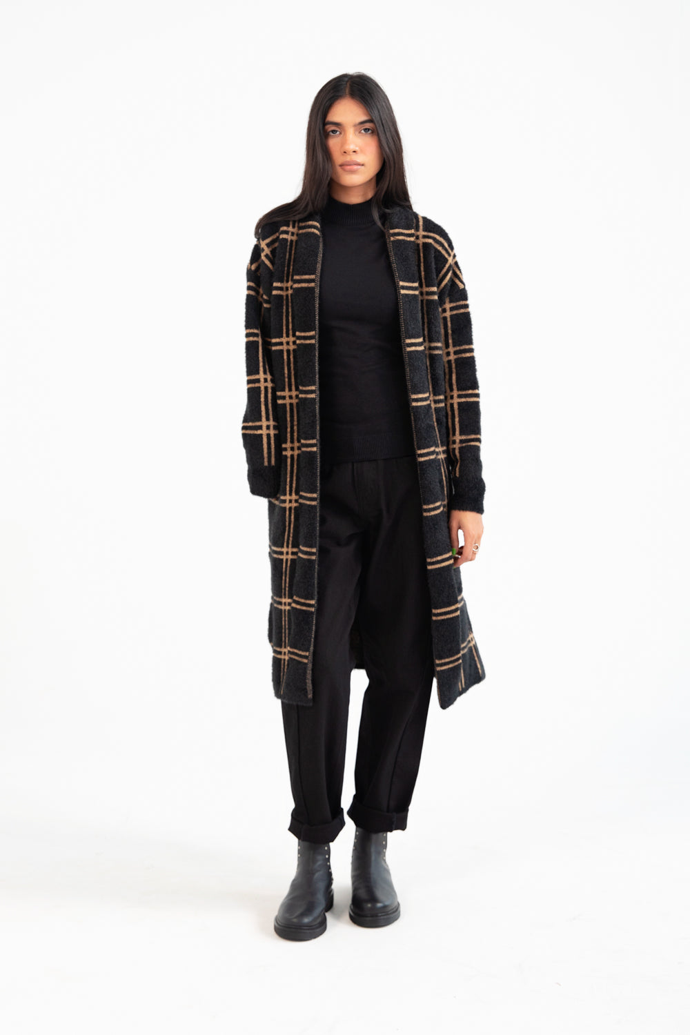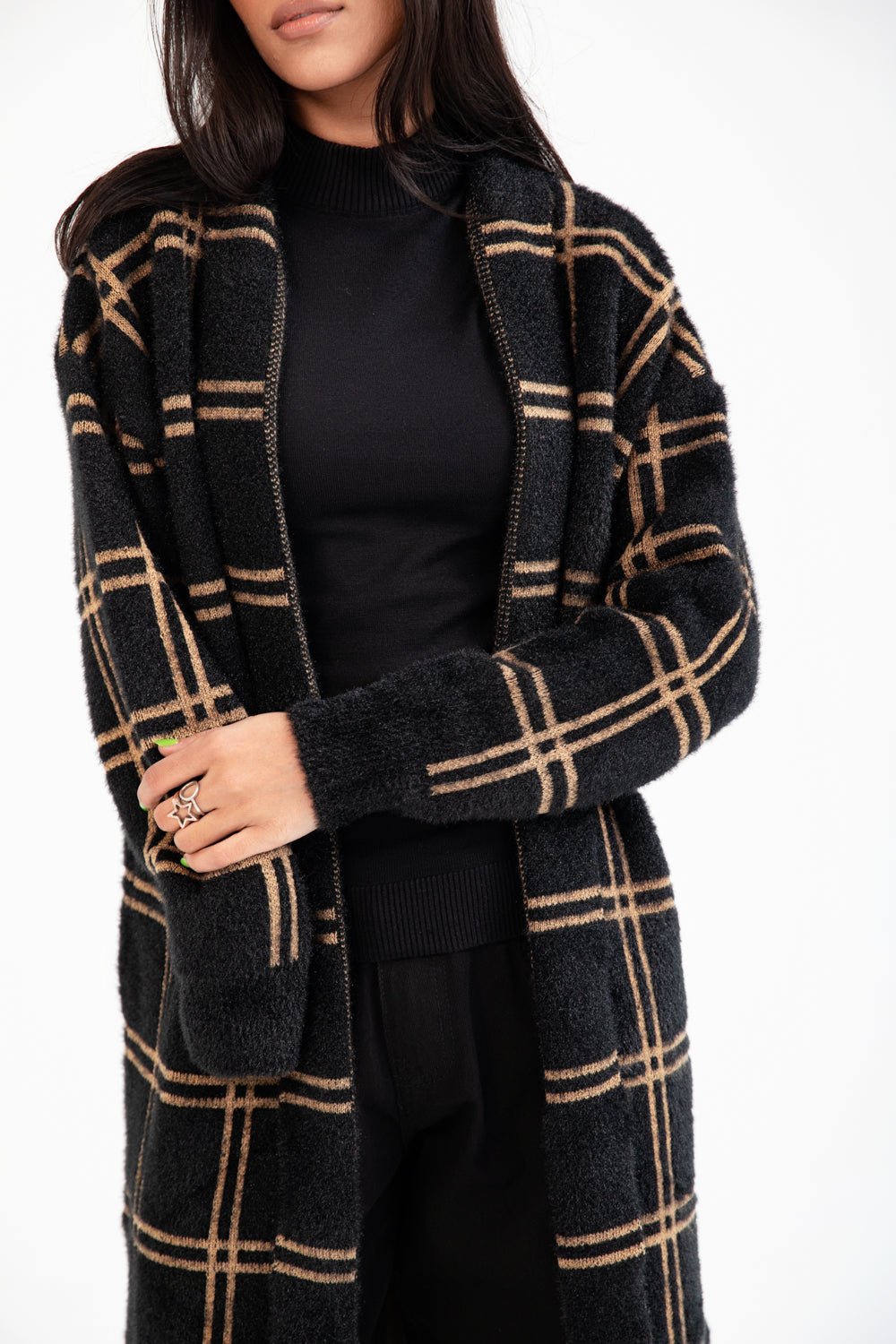Knitted jacquard long cardigan in black woven with mink yarn and finished with a beige plaid pattern.