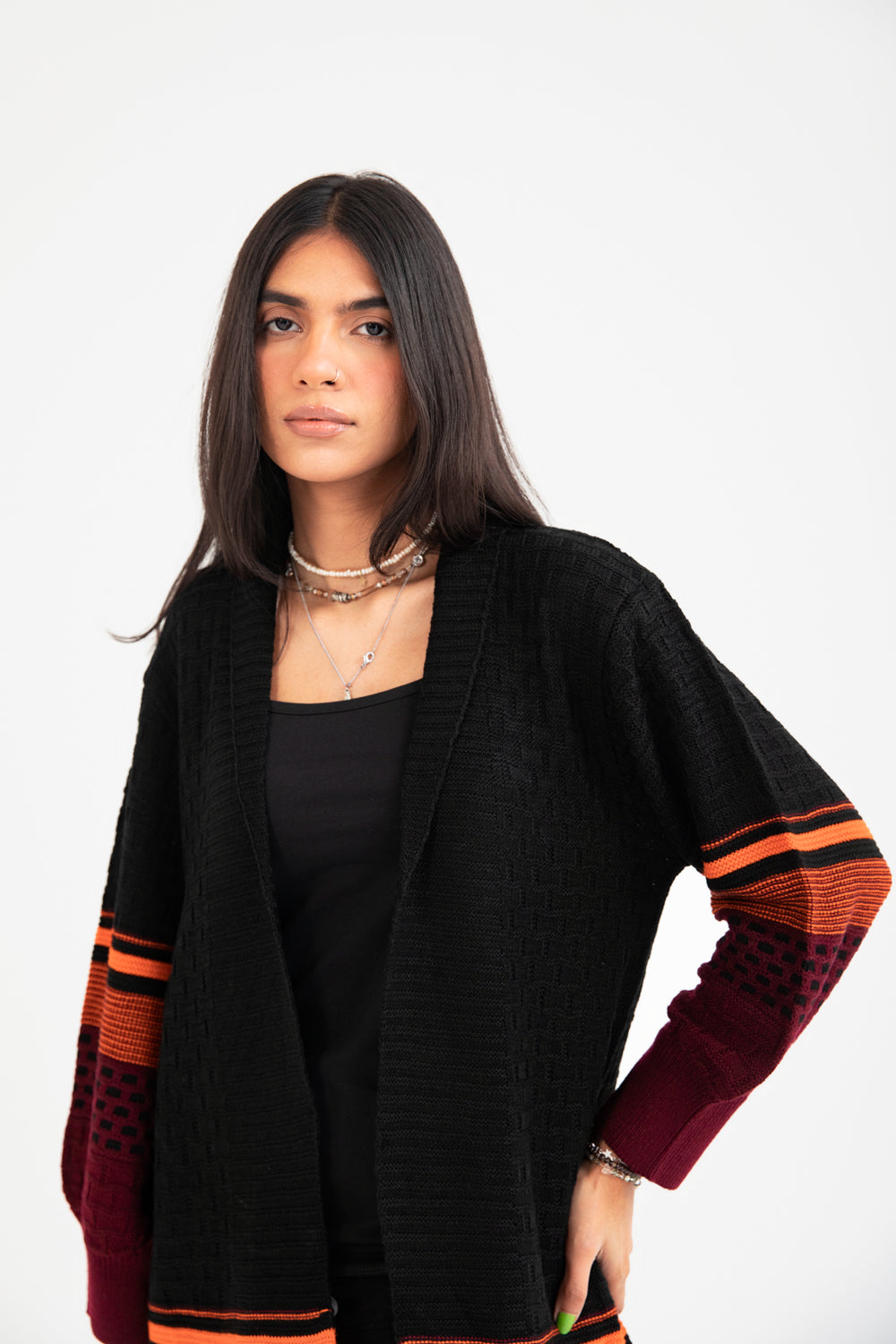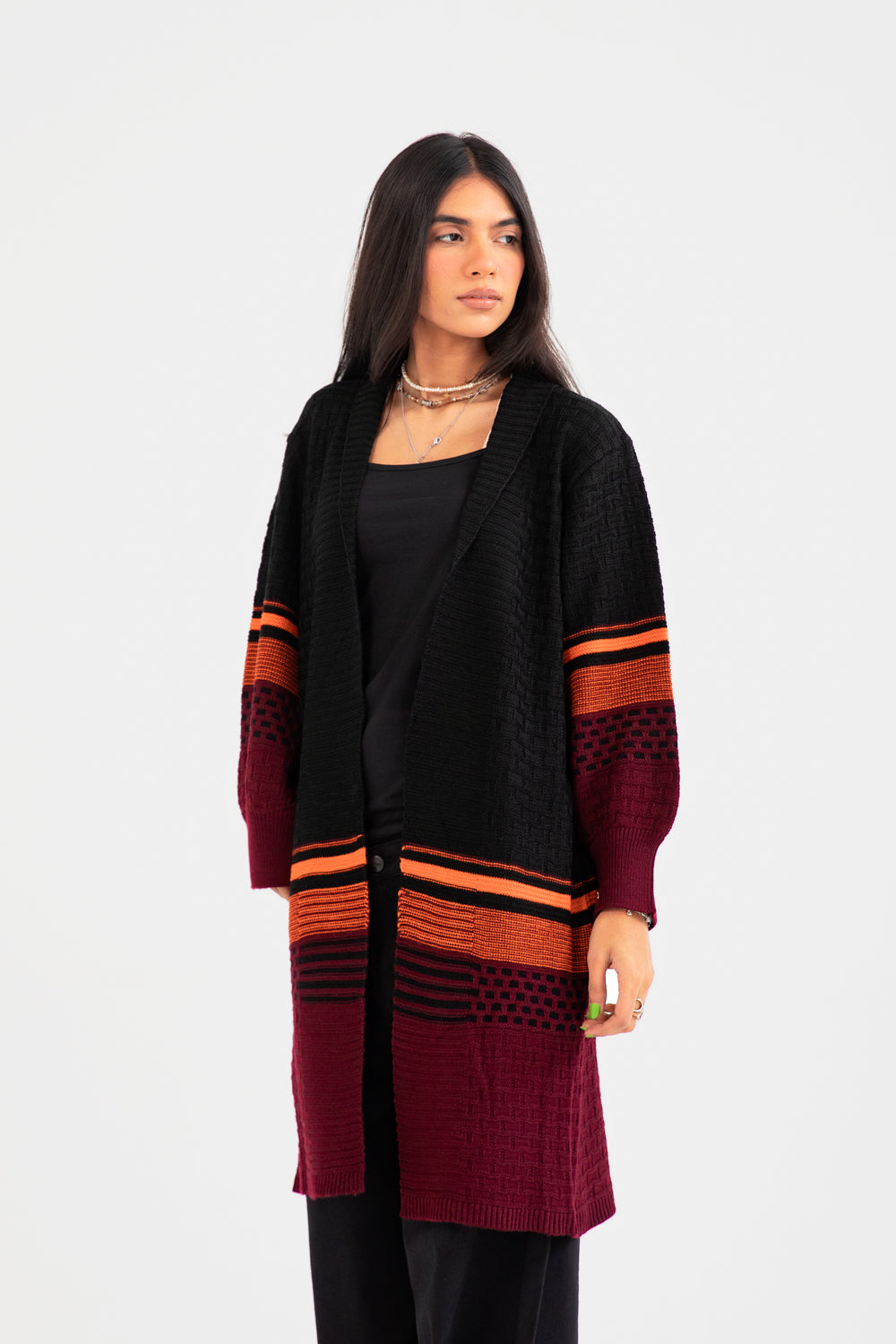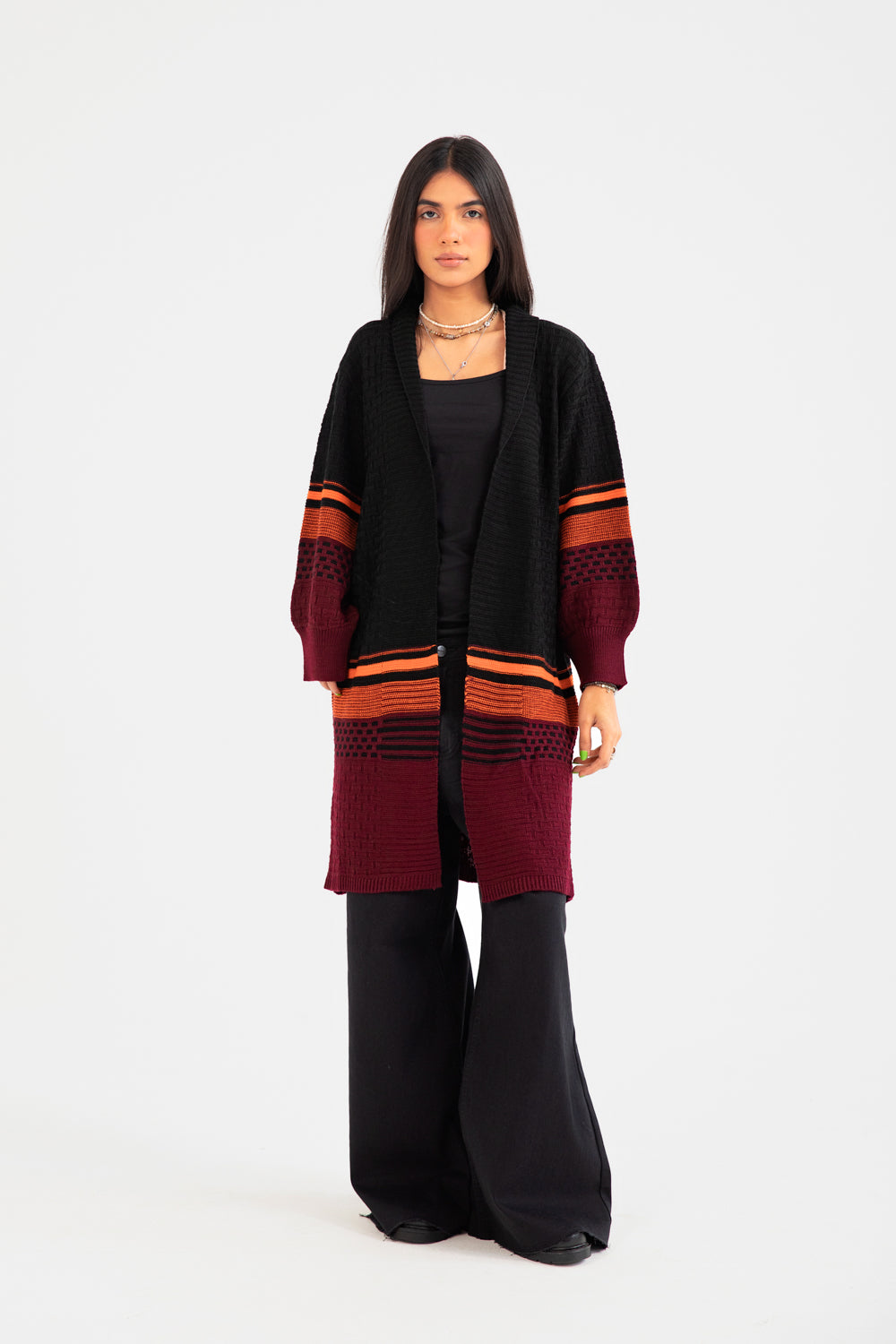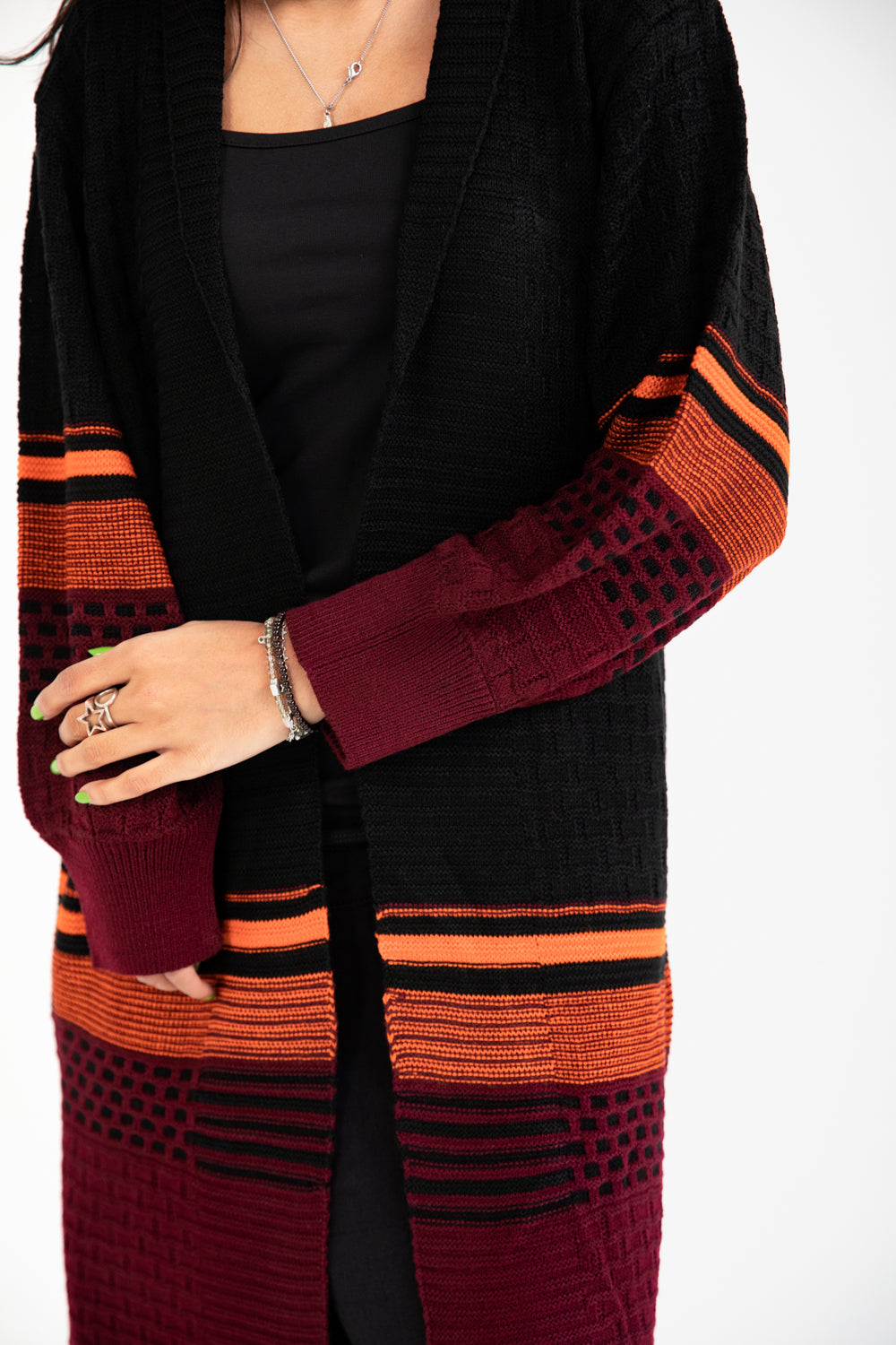 Chunky knitted cardigan in black and burgundy designed in a long front open style with a cozy textured feel.