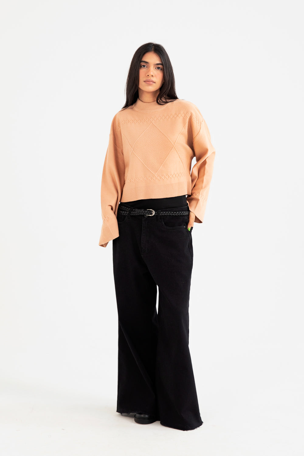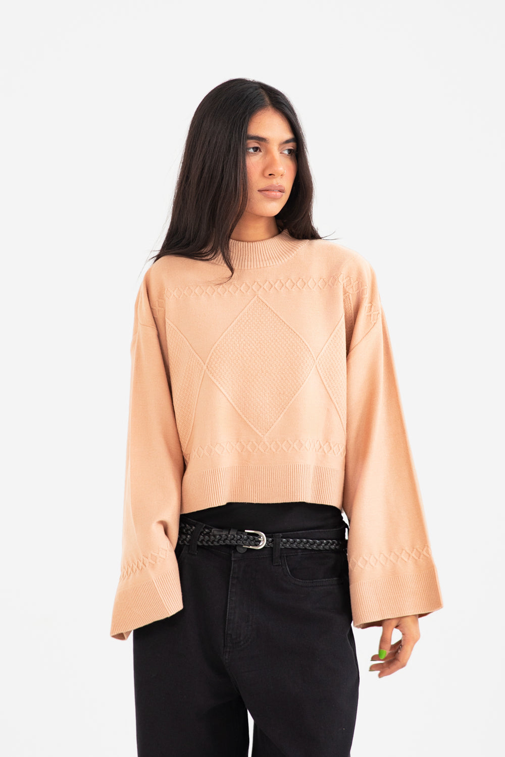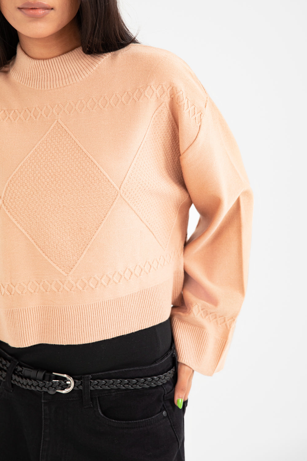 A beige cropped jumper with a mock neck and a textured knitted pattern in an oversized fit.