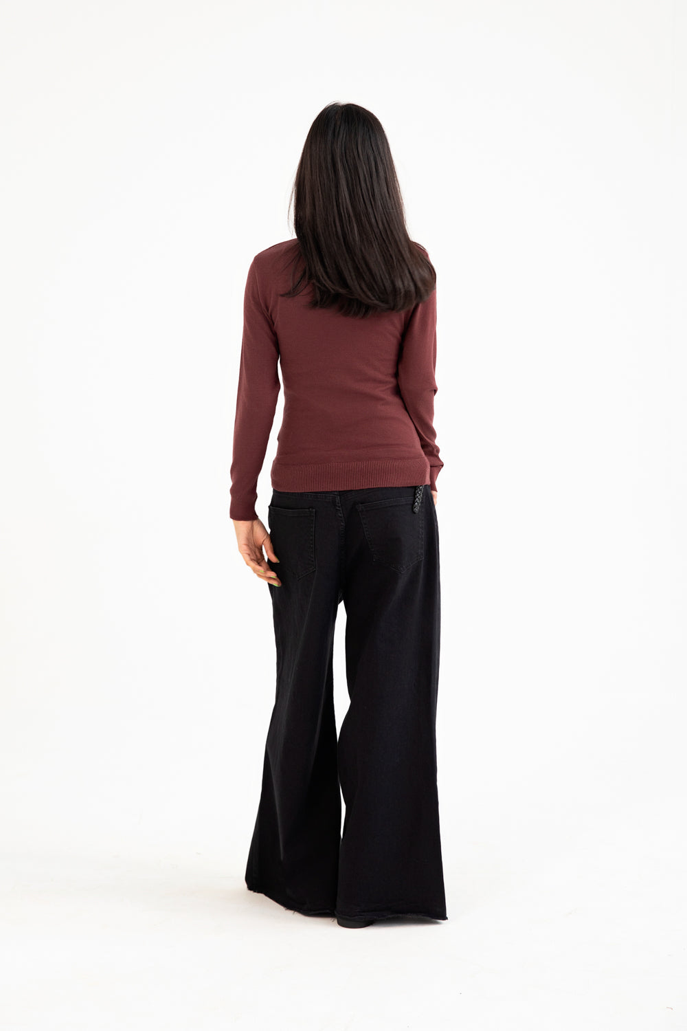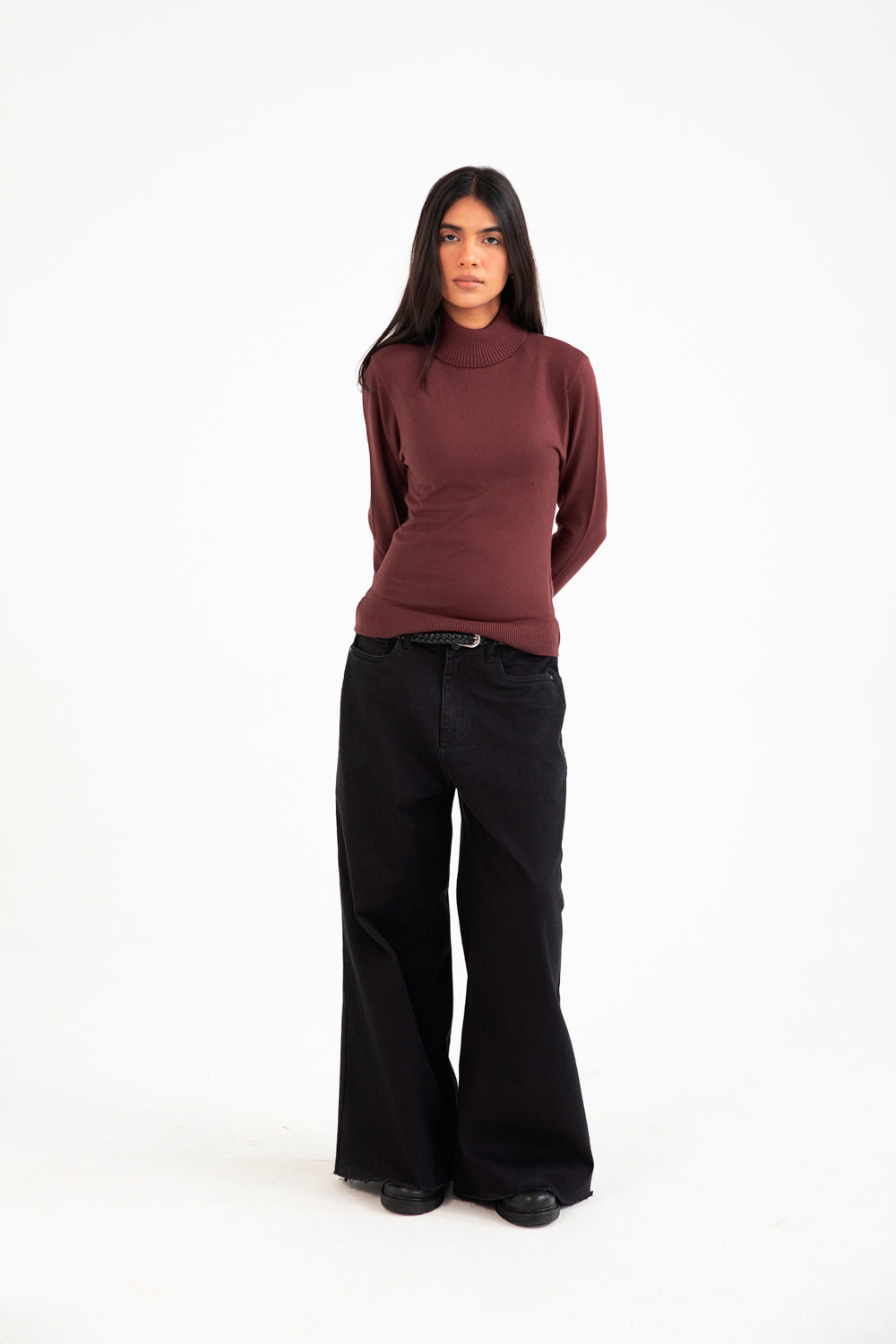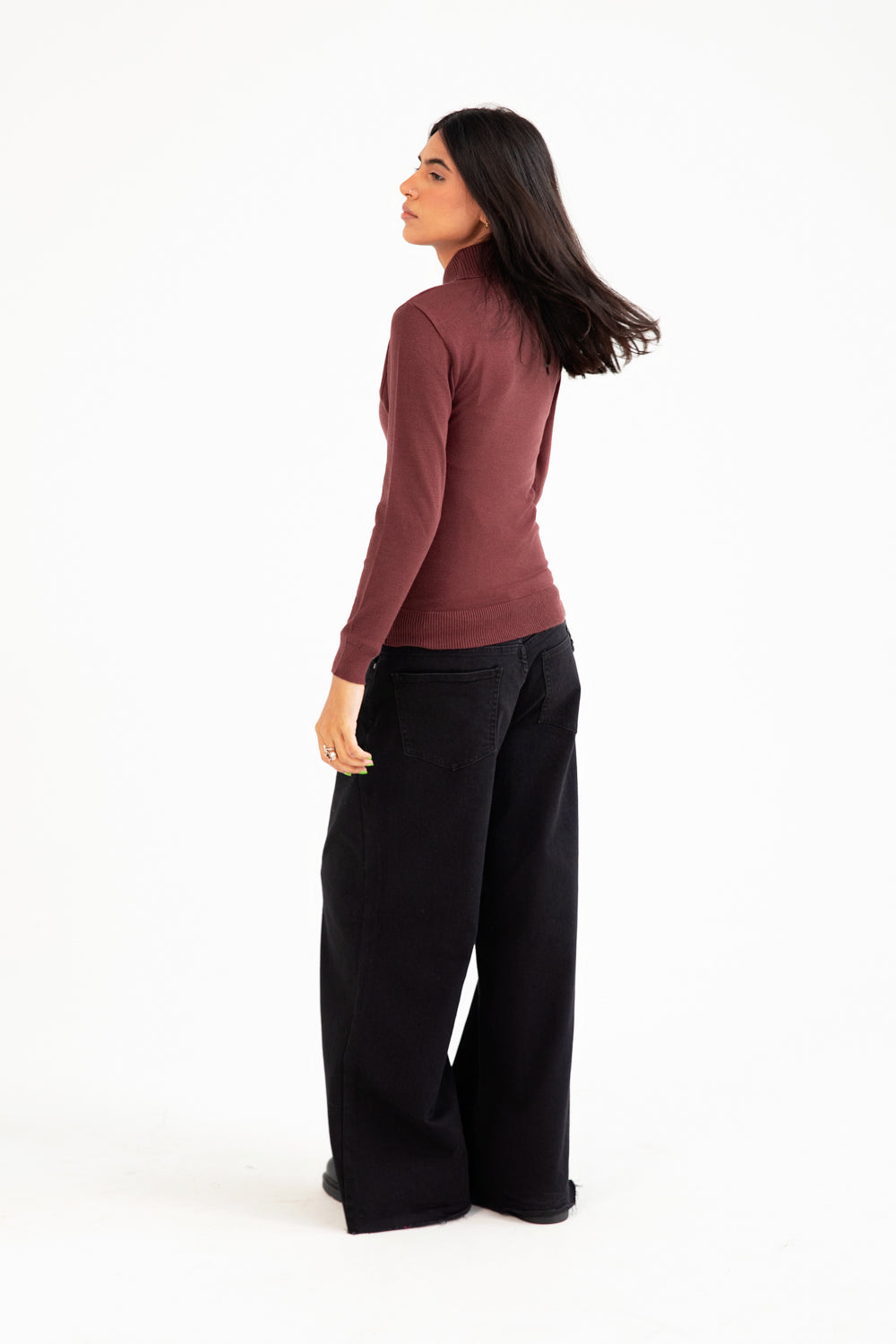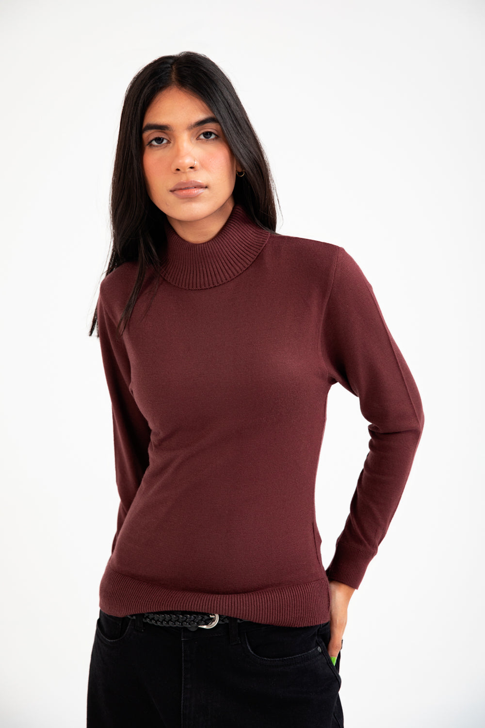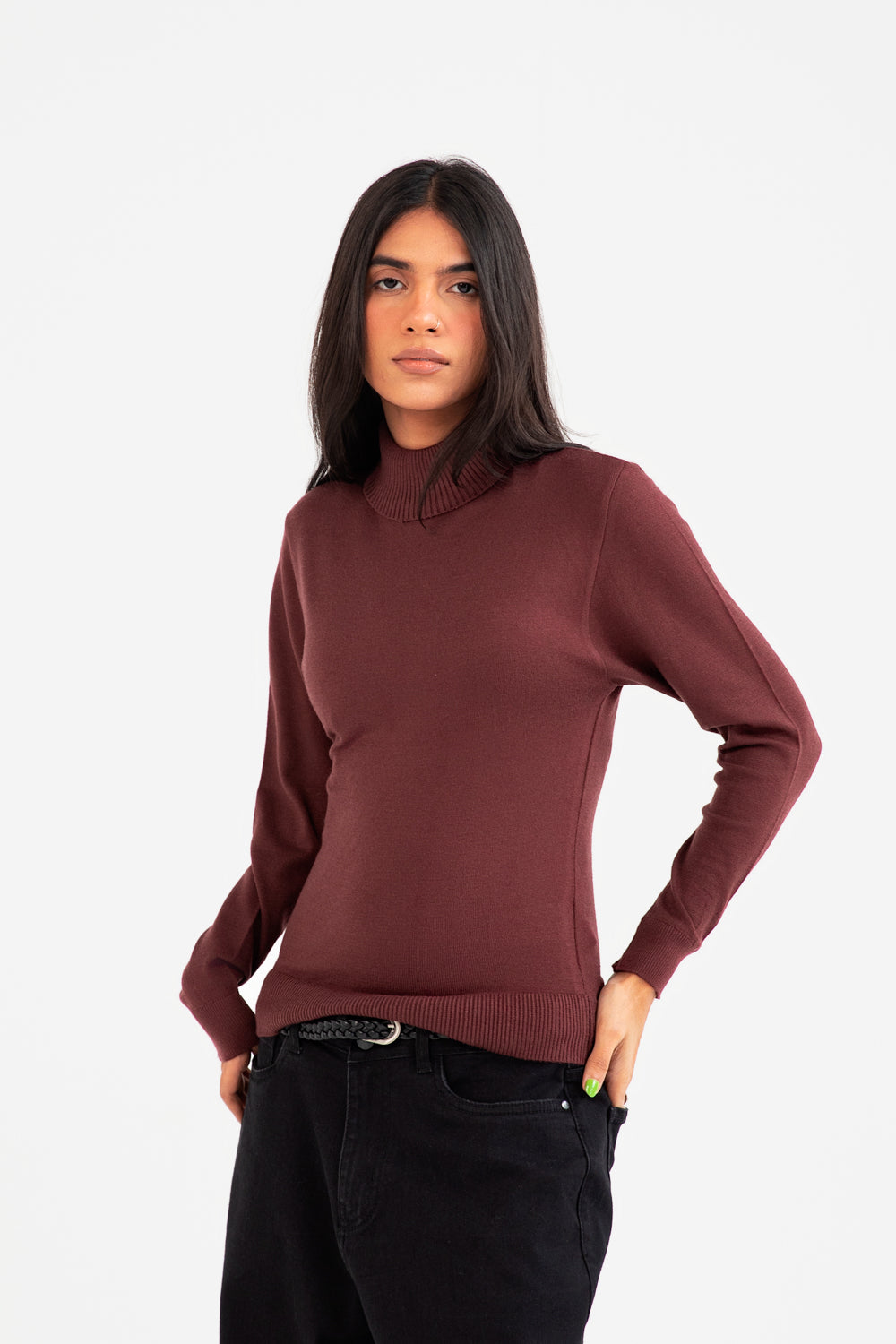 A burgundy sweater with a mock neck and a soft cashmere hand feel, designed in a close fit for a clean look.