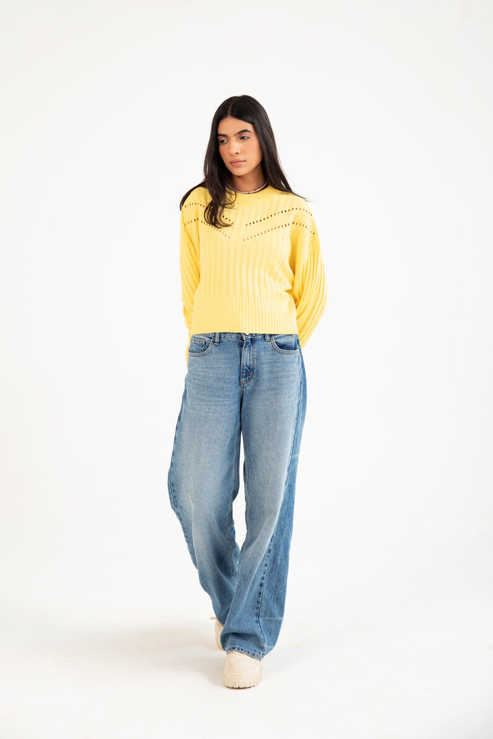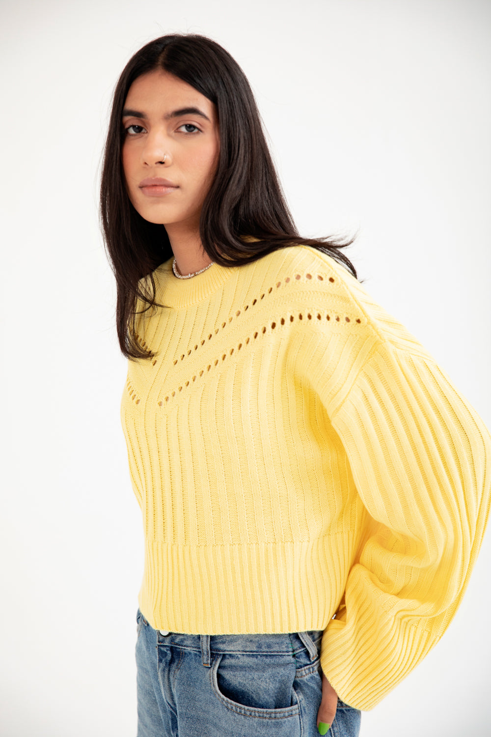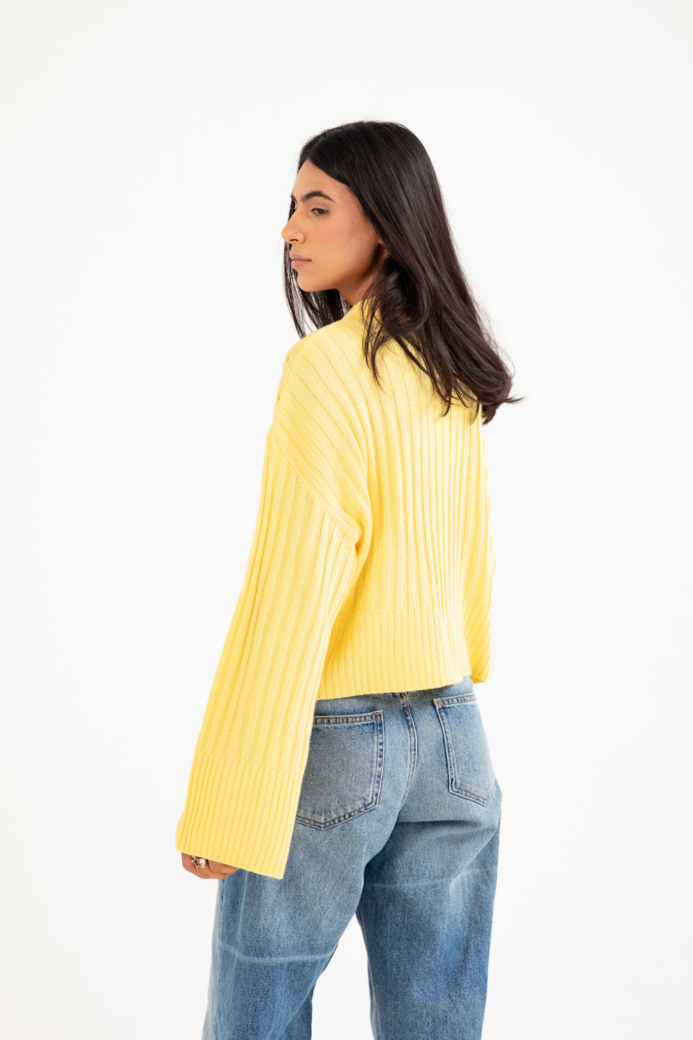 A butter yellow cropped jumper with oversized sleeves in a soft knitted design.