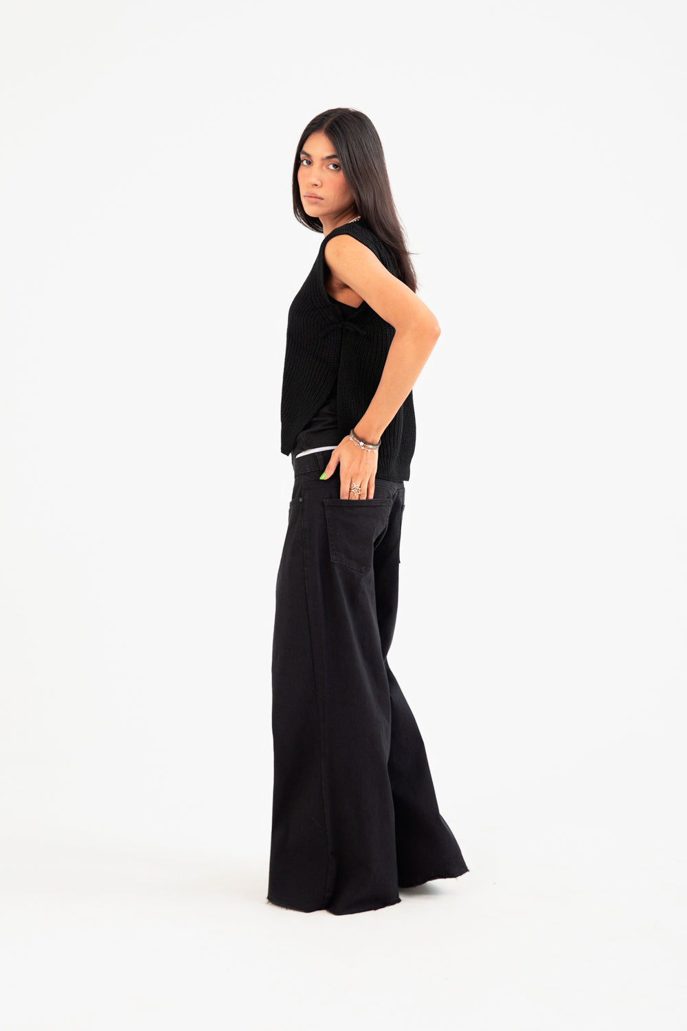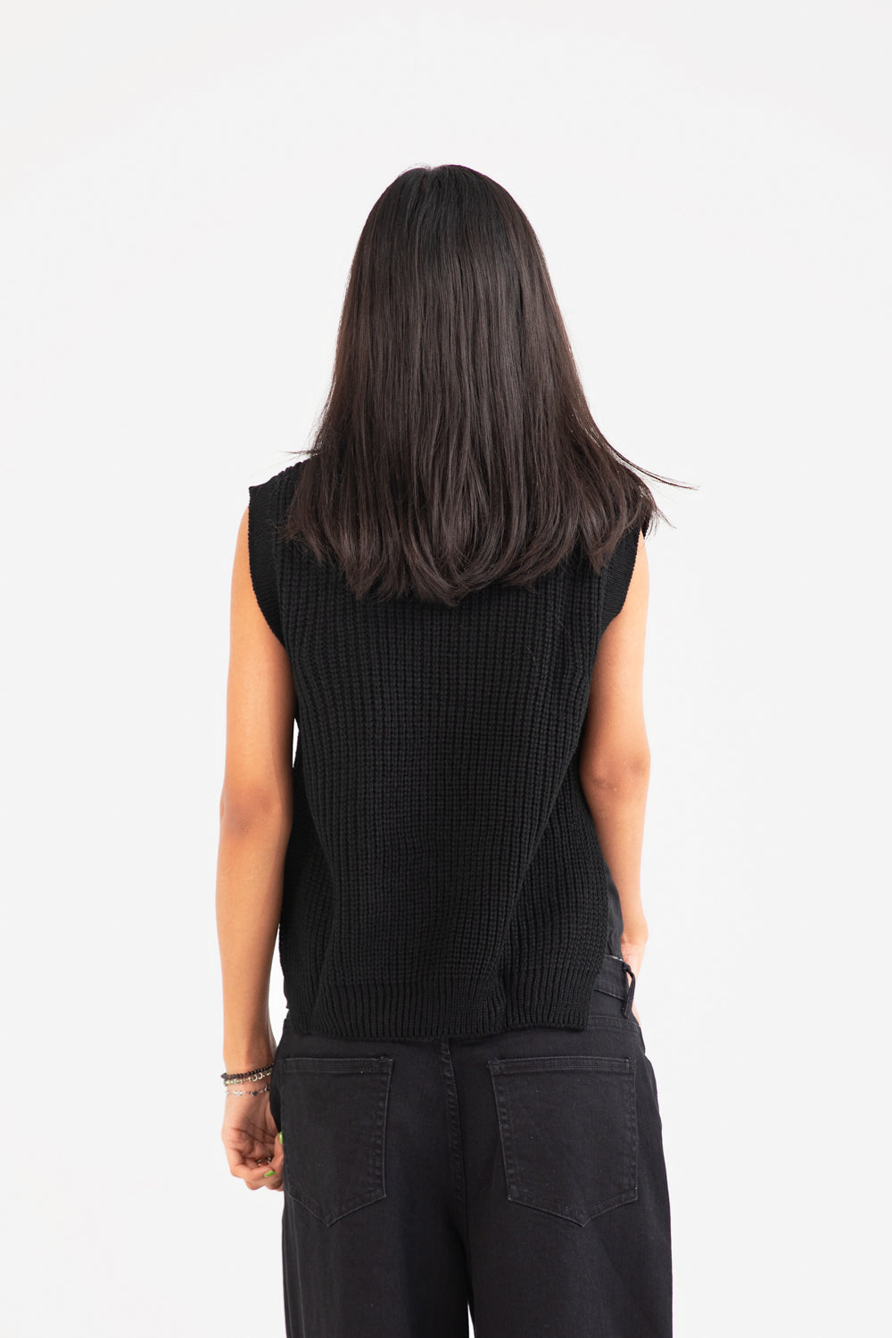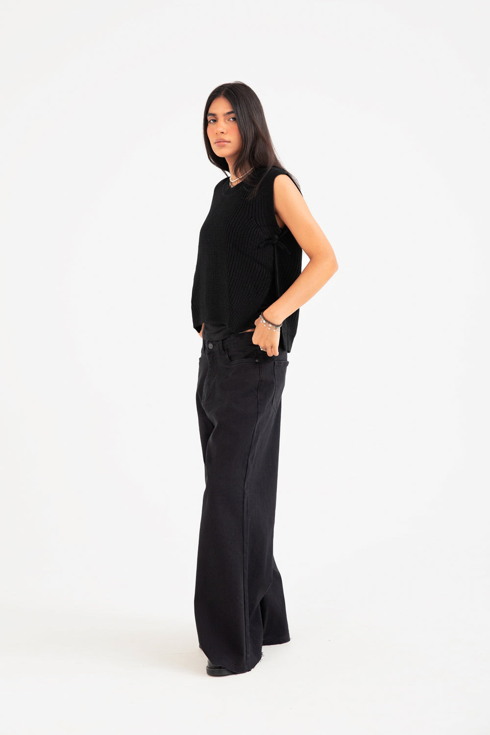 A sleeveless sweater vest in black, finished with tie details along the sides.