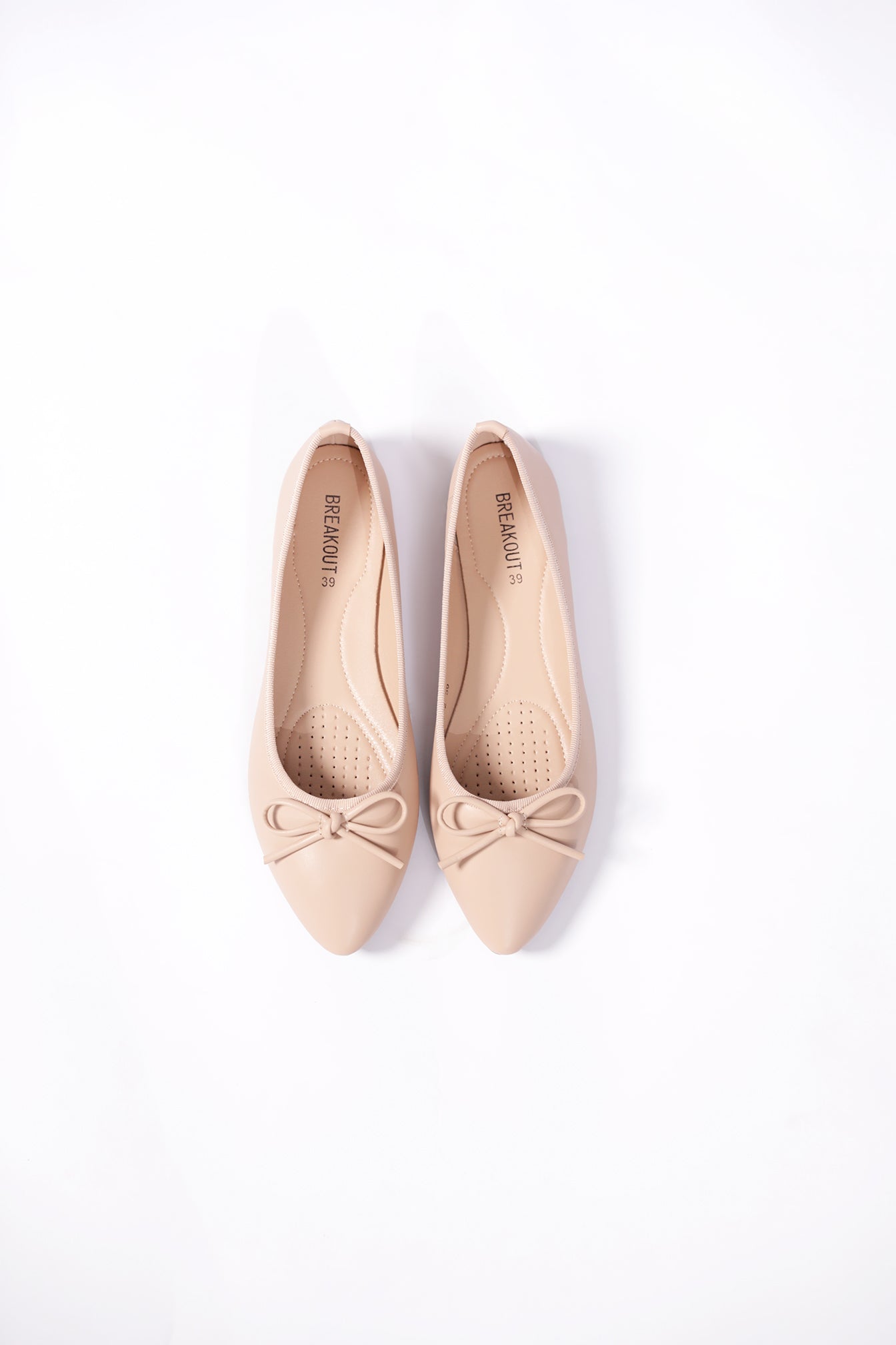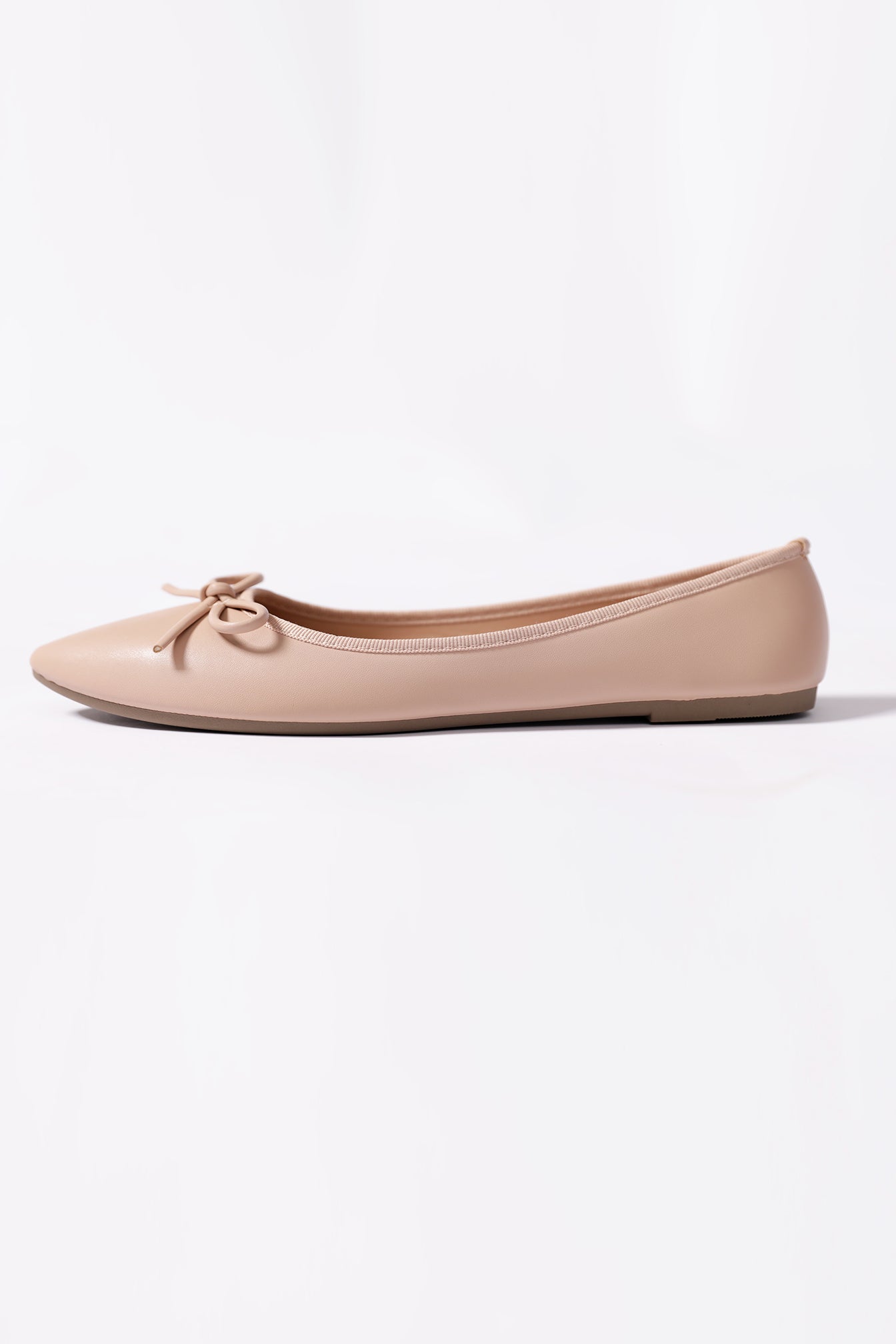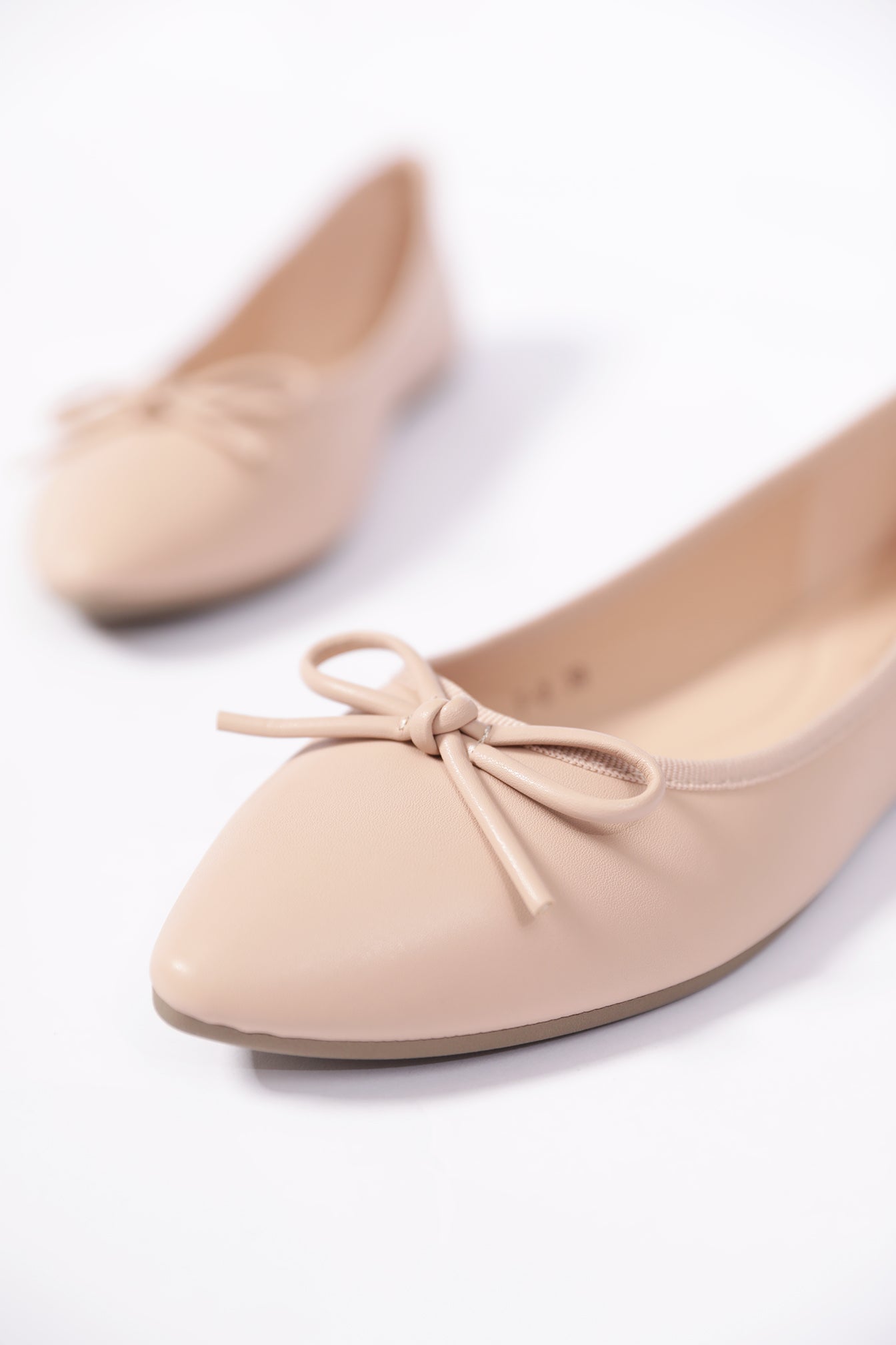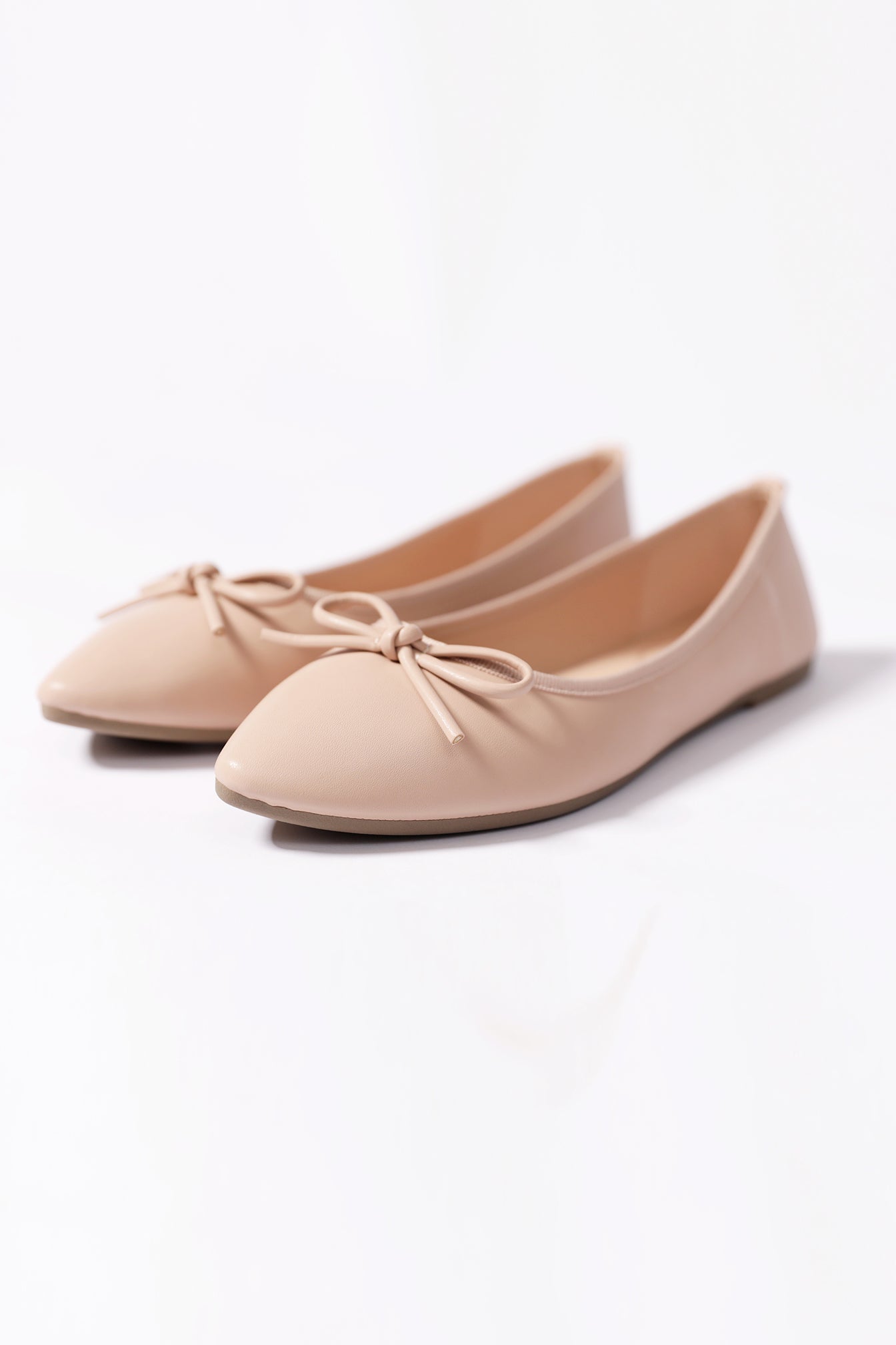 Beige ballerina pumps with a pointed toe and a delicate bow detail on the front for a classic touch.