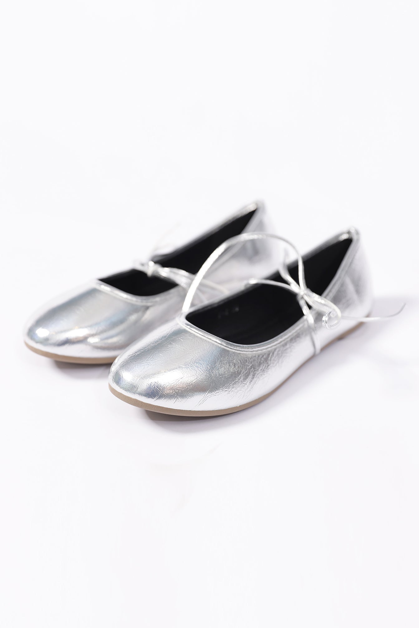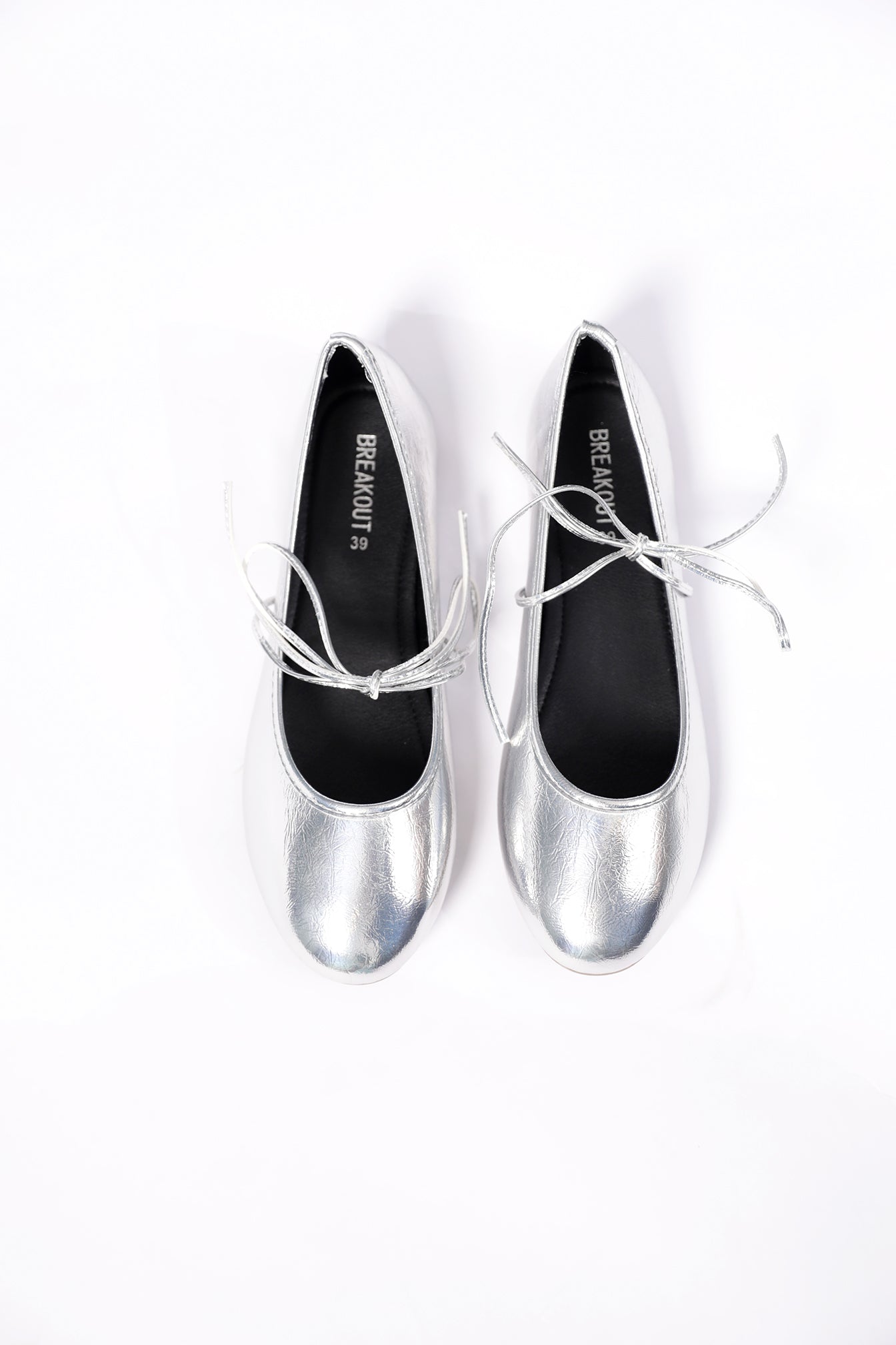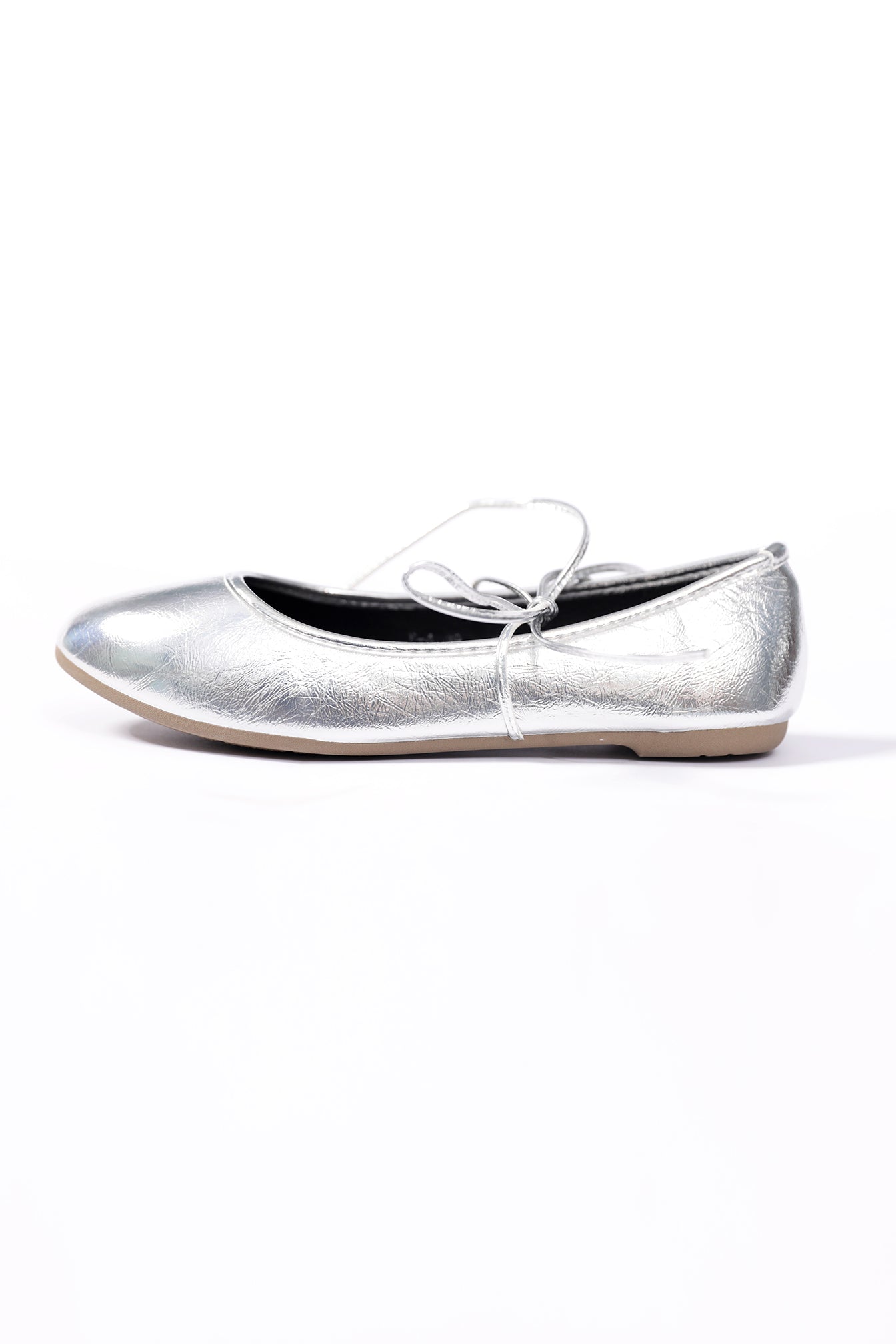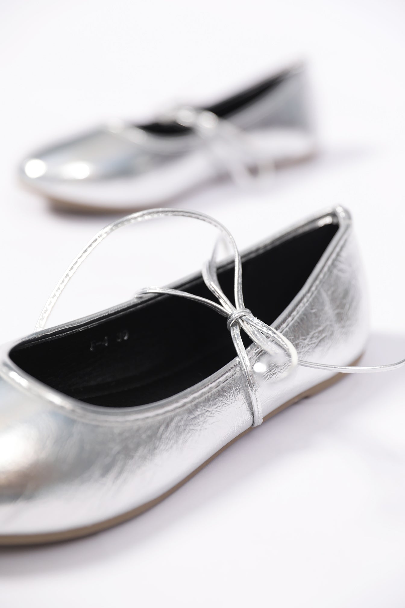 Silver metallic pumps with a rounded toe and delicate tie detail for a chic finish.