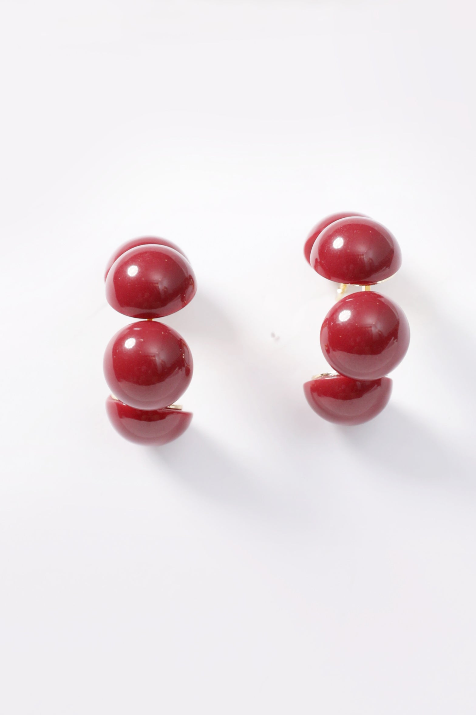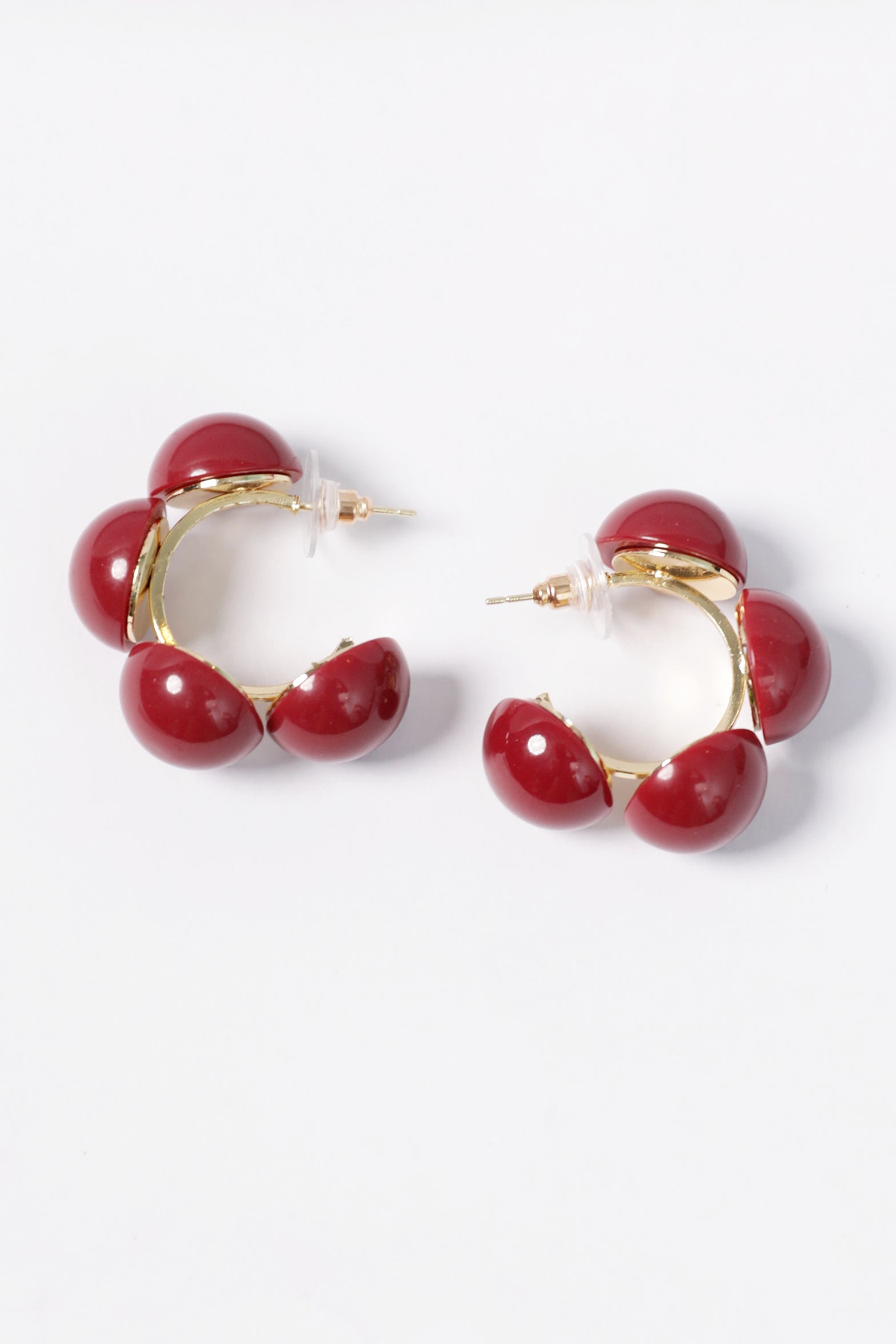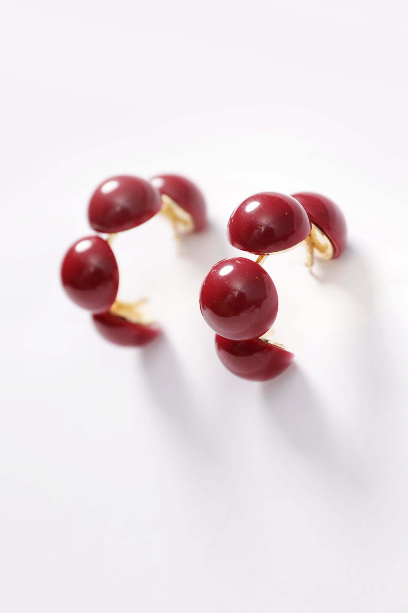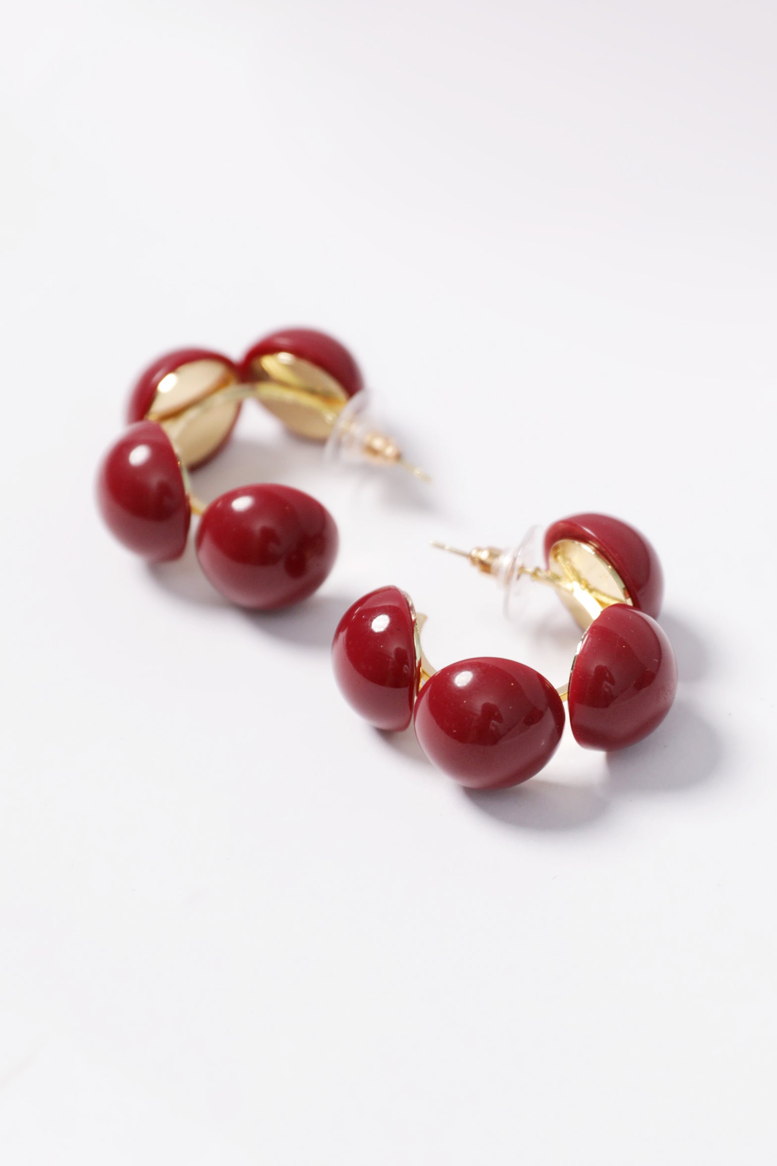 Semicircular hoop earrings adorned with maroon acrylic beads, set in a sleek golden base for a vibrant and stylish finish.