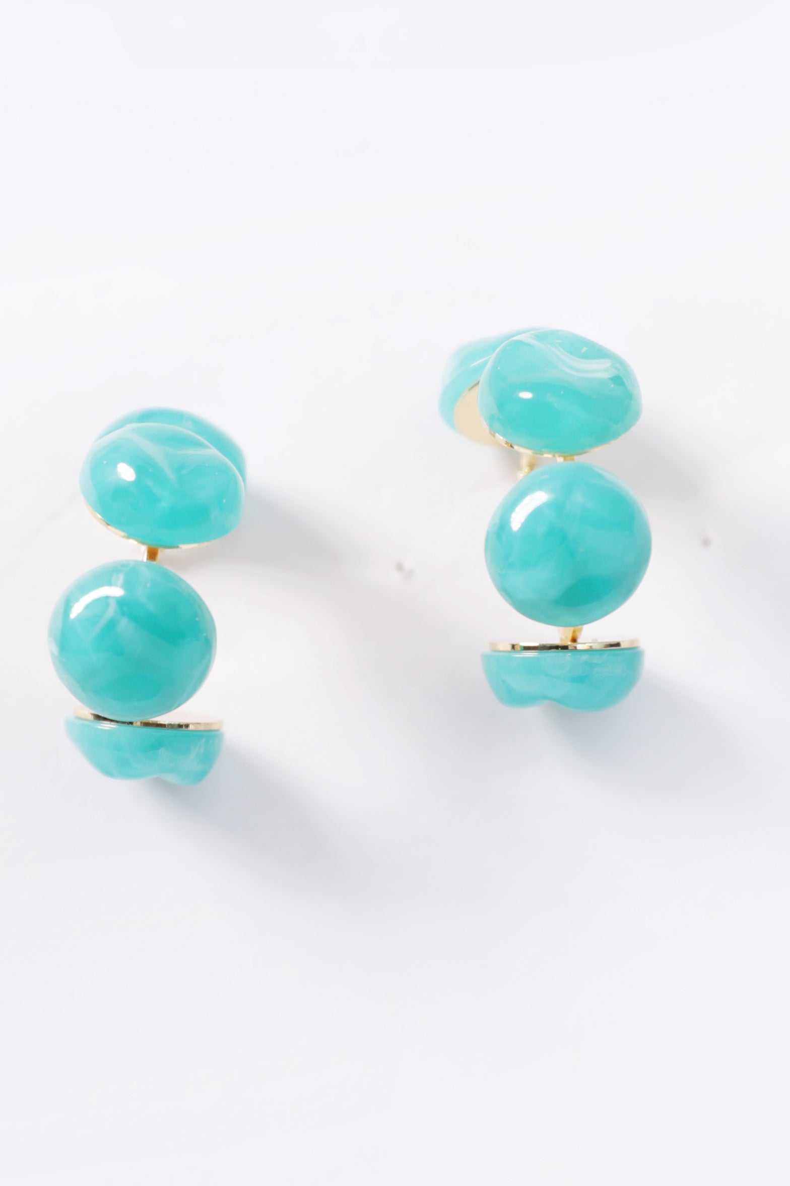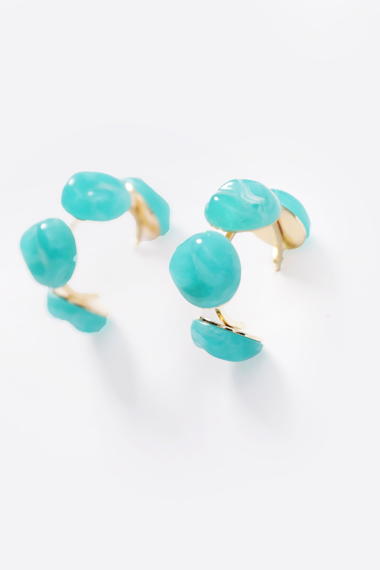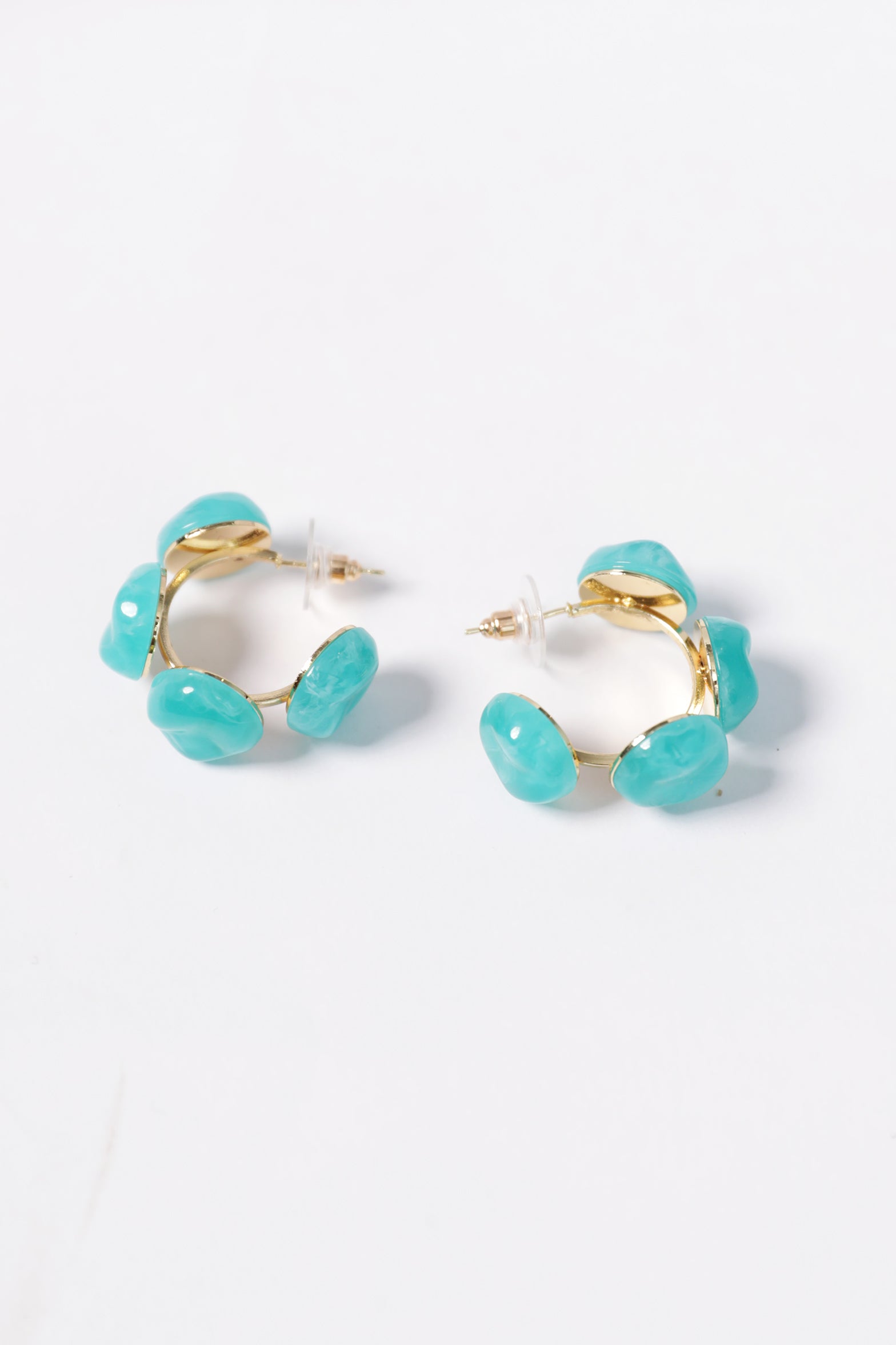 Semicircular hoop earrings adorned with turquoise blue acrylic beads, set in a sleek golden base for a vibrant and stylish finish.