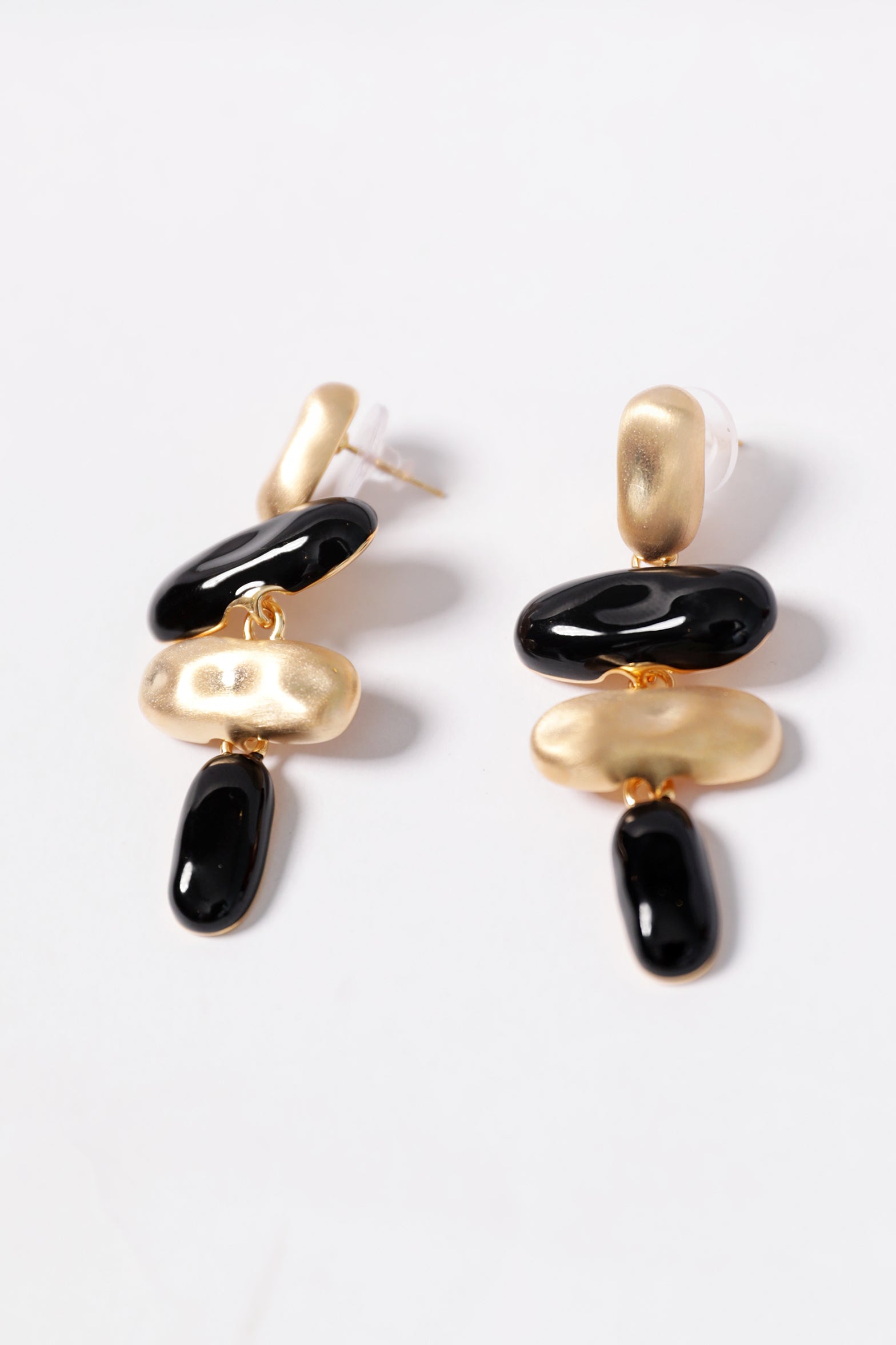 Dangle earrings with a stack of pearl-like stones in contrasting black and cream, offering a chic and sophisticated style.