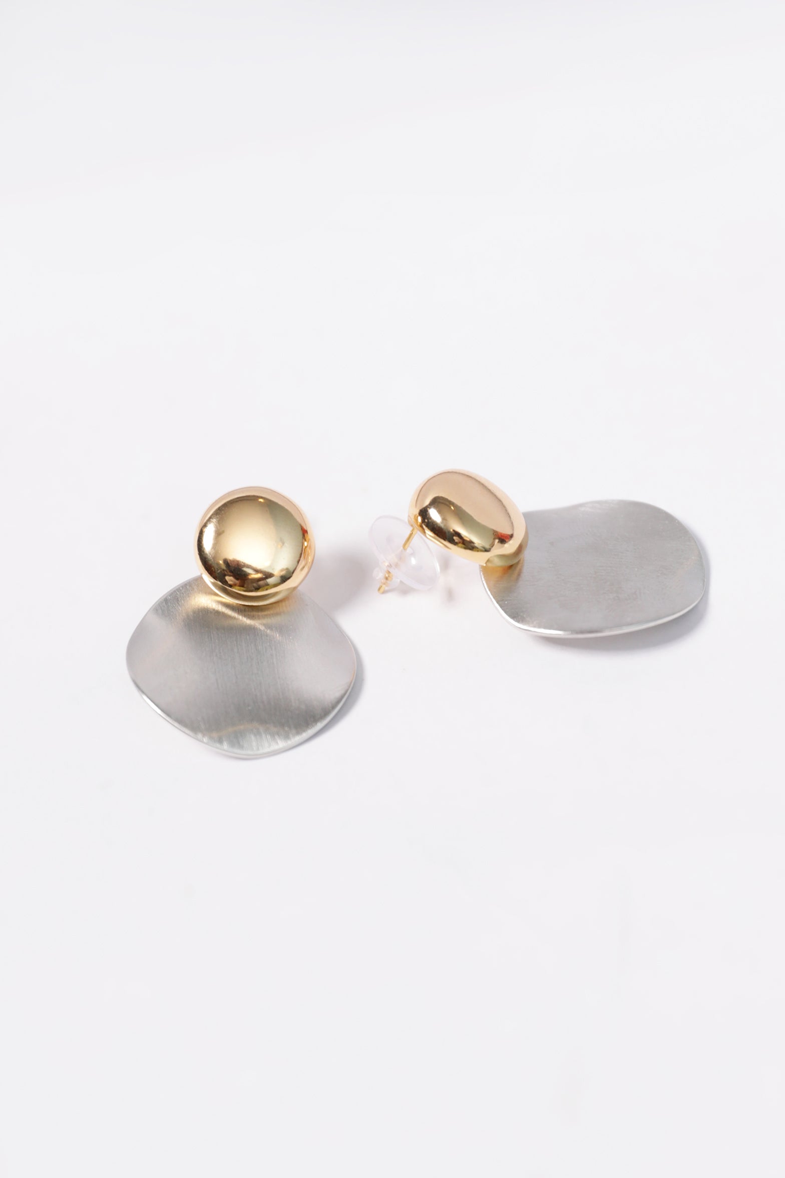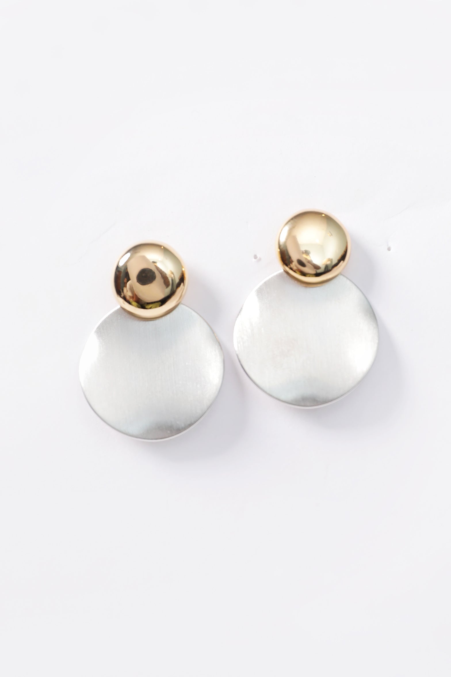 Disc drop earrings with two contrasting discs, one in gold and the other in silver, creating a sleek and modern look.