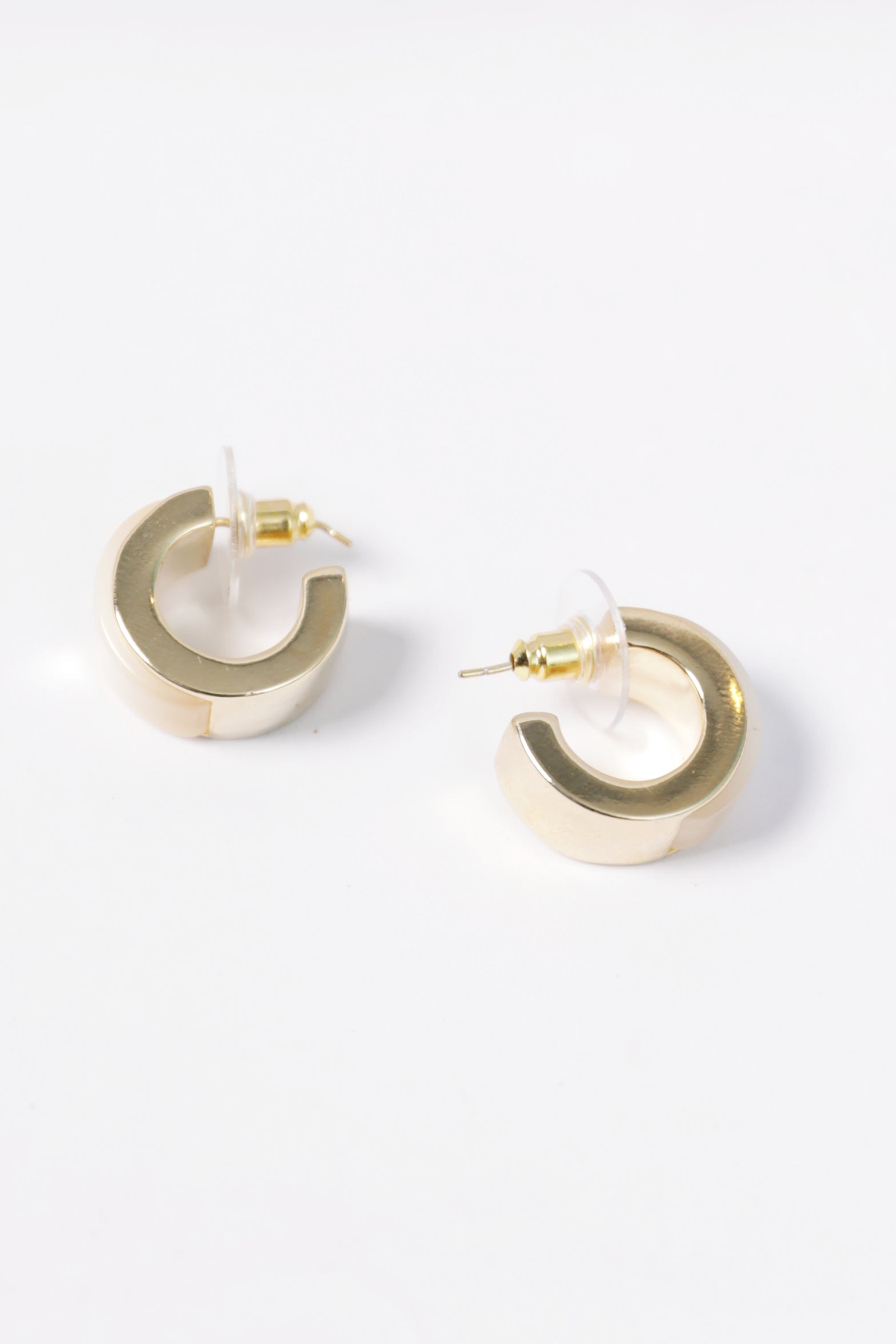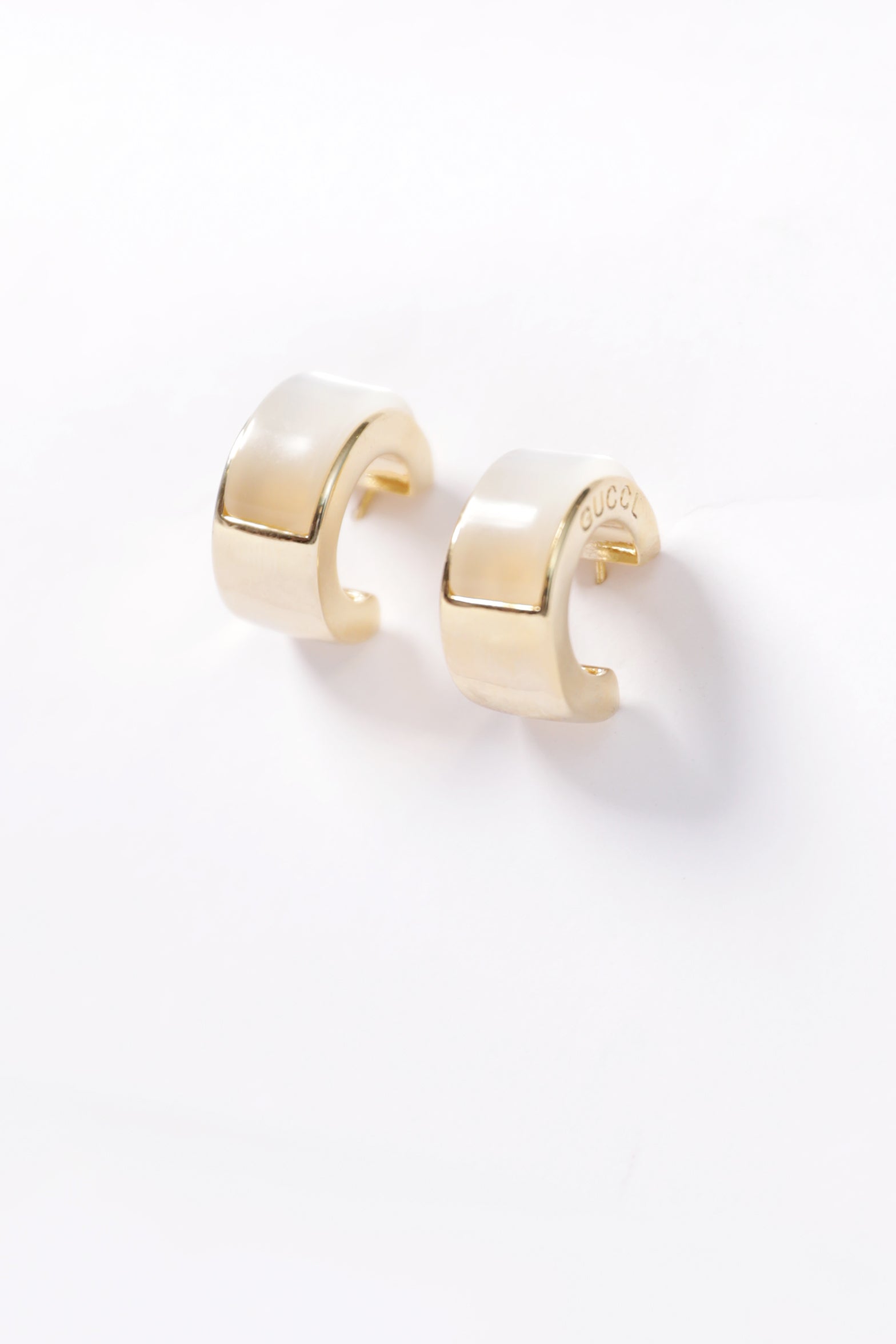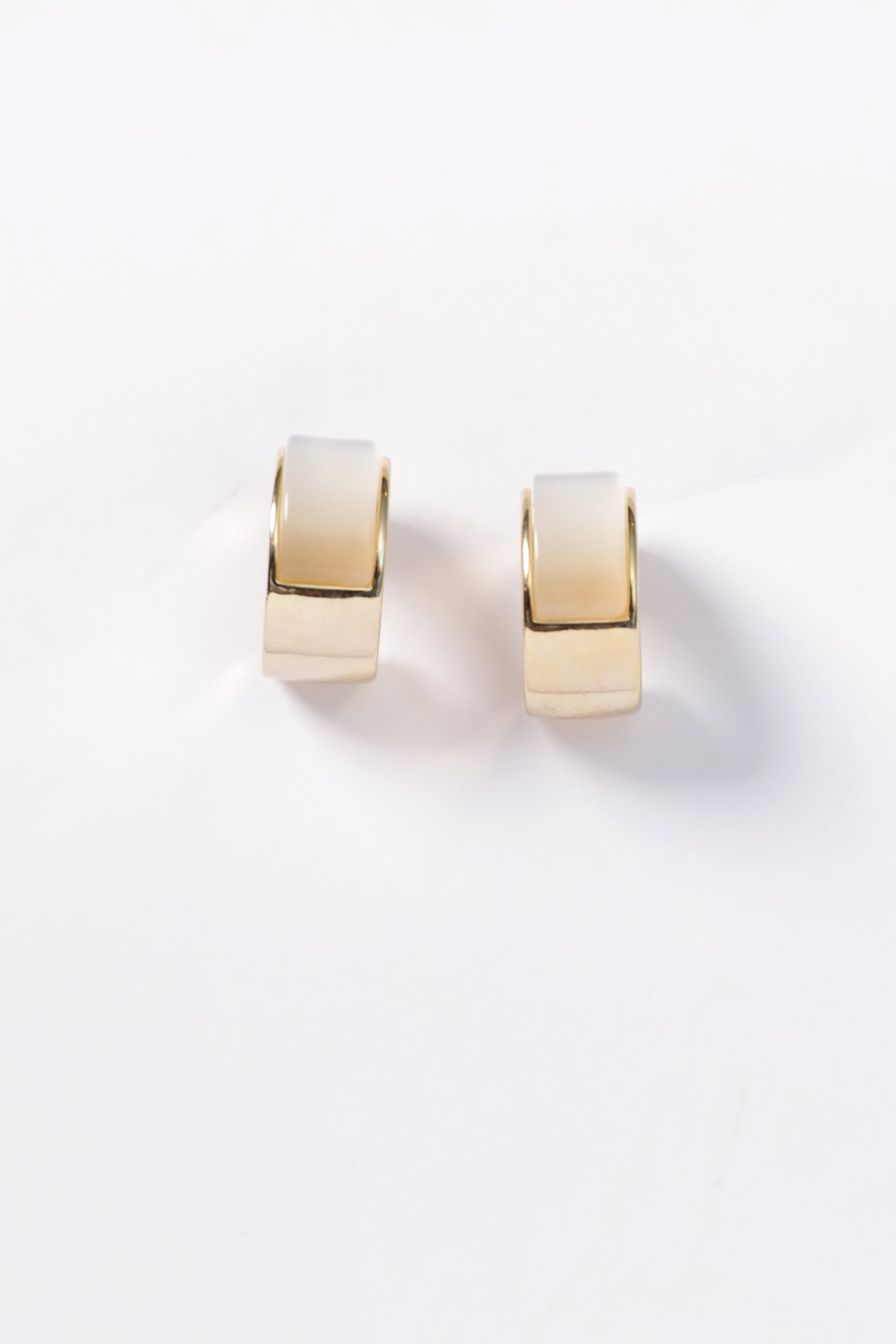 Semi-circular cat eye hoops set in a gold base, offering a modern shape with a soft, polished finish.